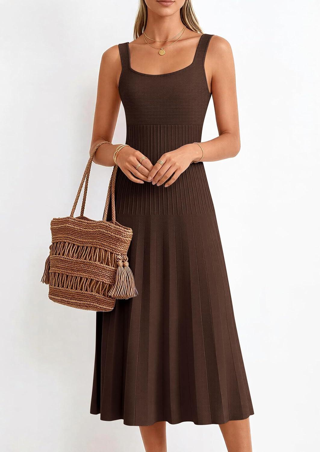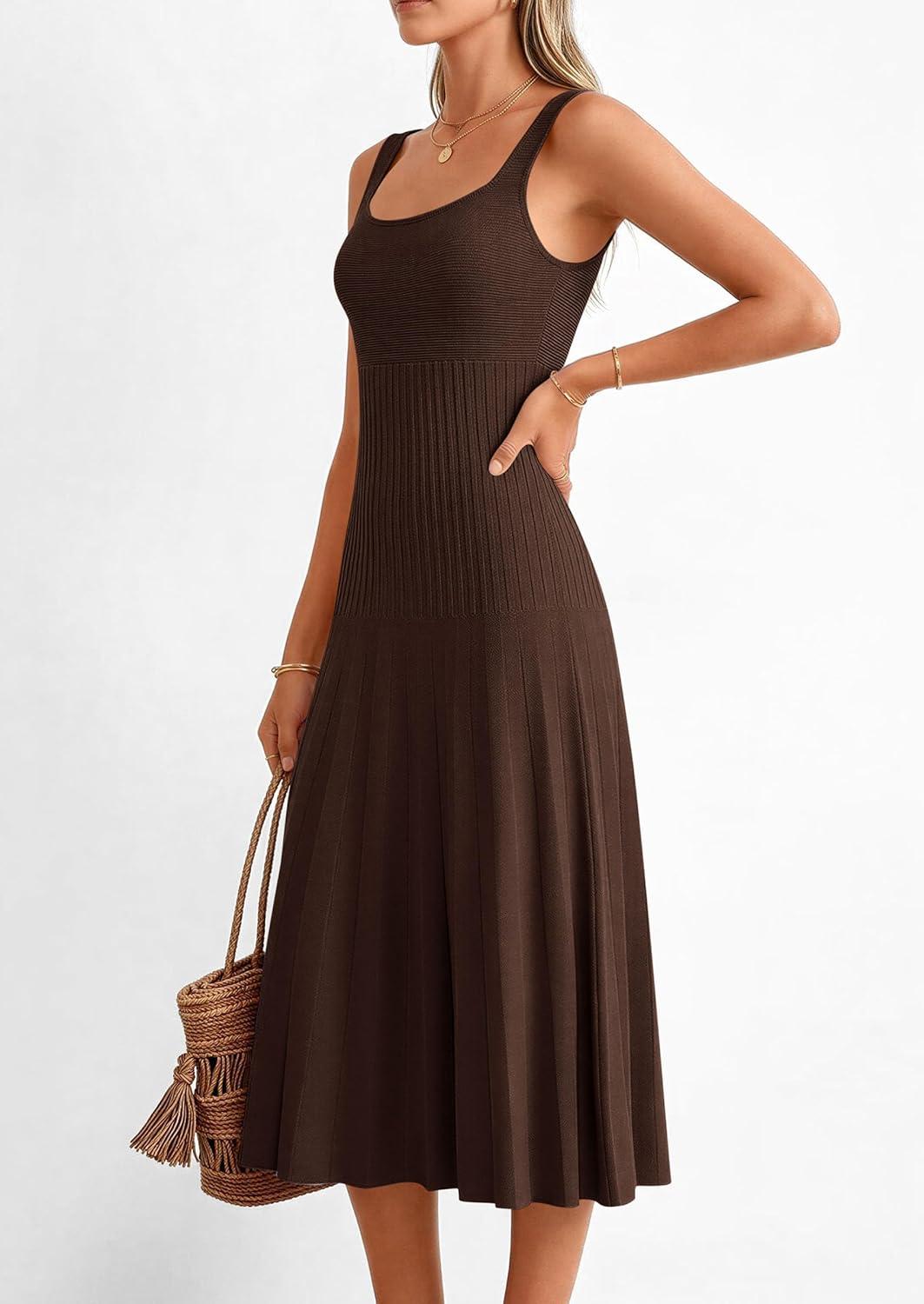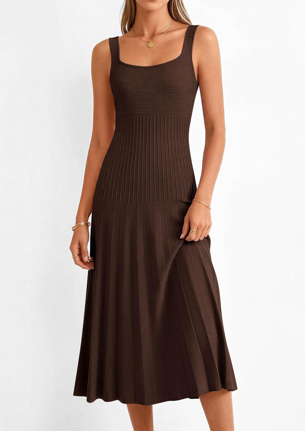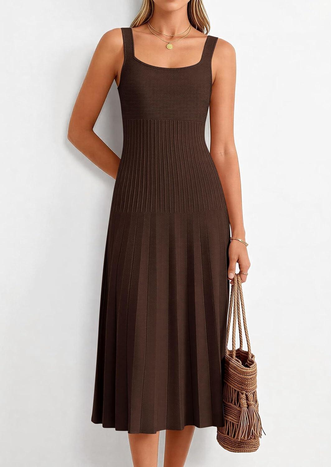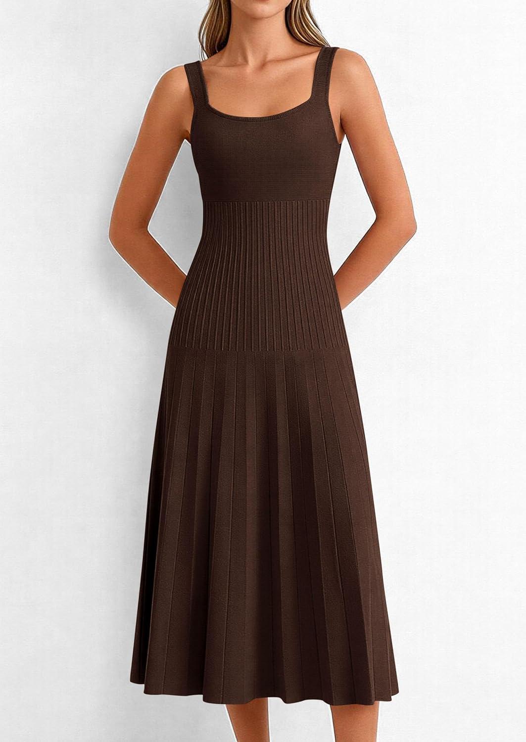 PRETTYGARDEN Spring Dresses for Women 2026 Summer Casual Sleeveless Square Neck A Line Knit Pleated Midi Cocktail Party Dress(Brown)
