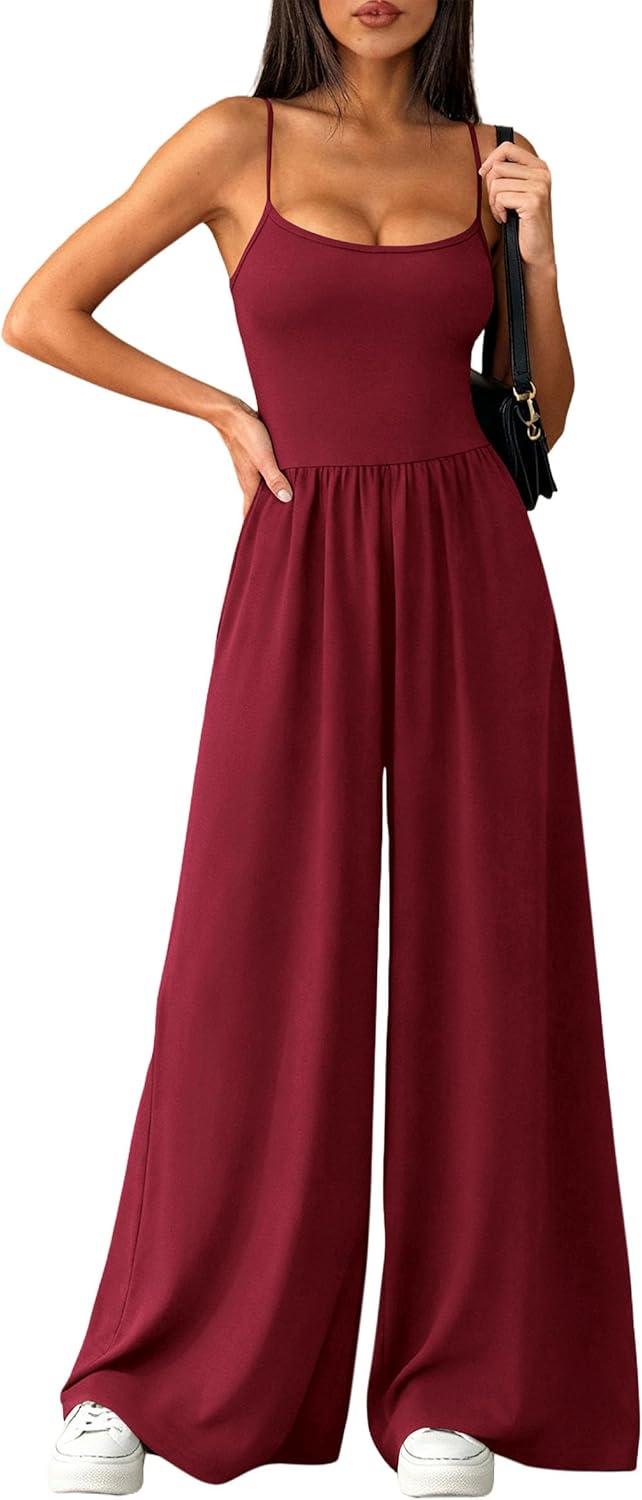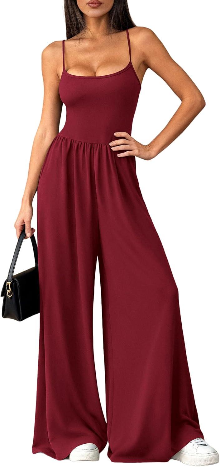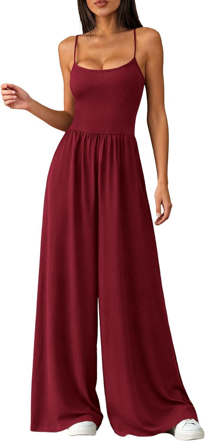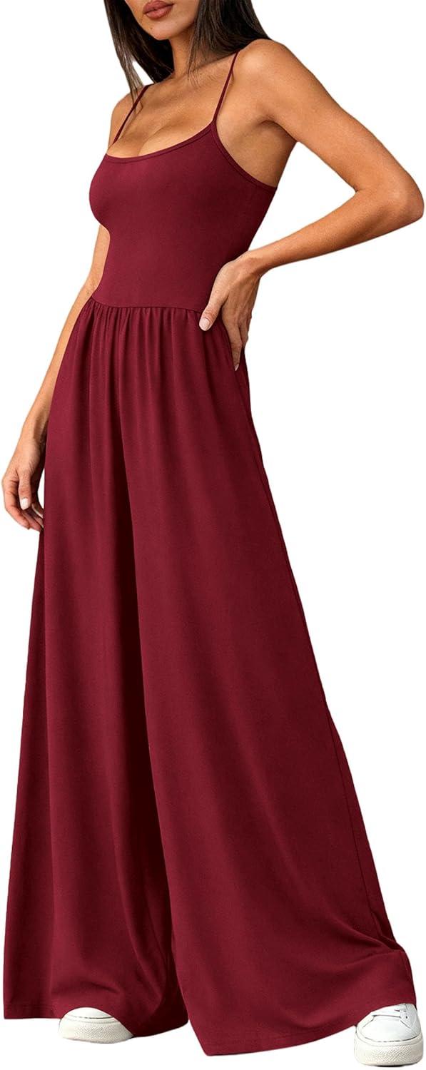 imagePRETTYGARDEN Summer Jumpsuits for Women Casual 2026 Wide Leg Date Night Rompers Sleeveless Beach Vacation One Piece OutfitsWine Red