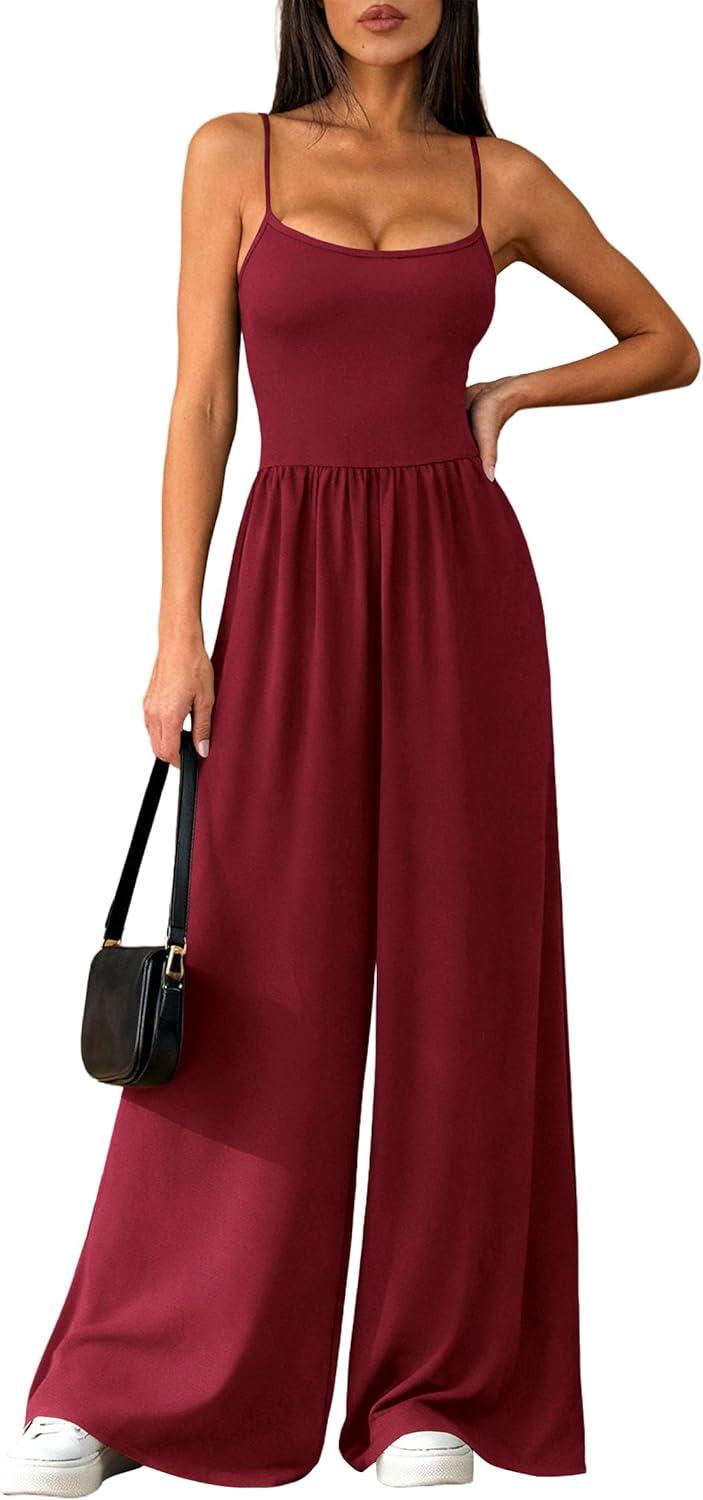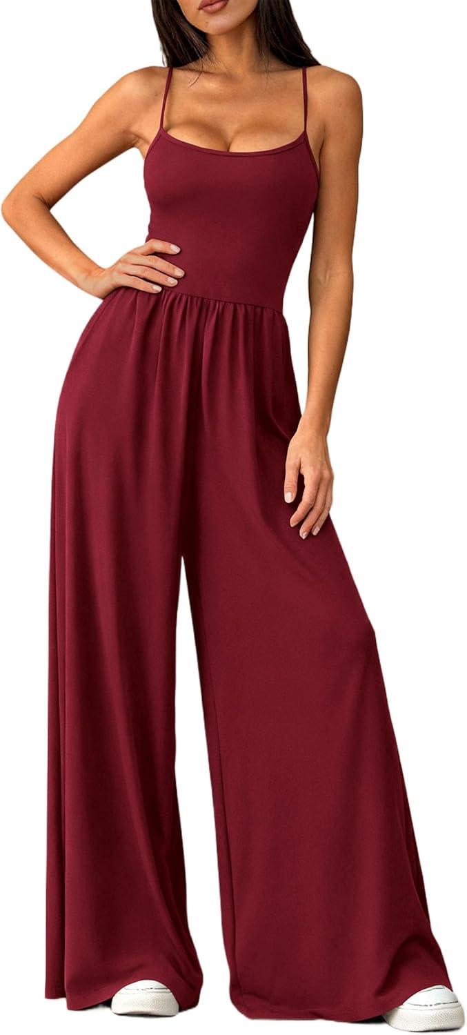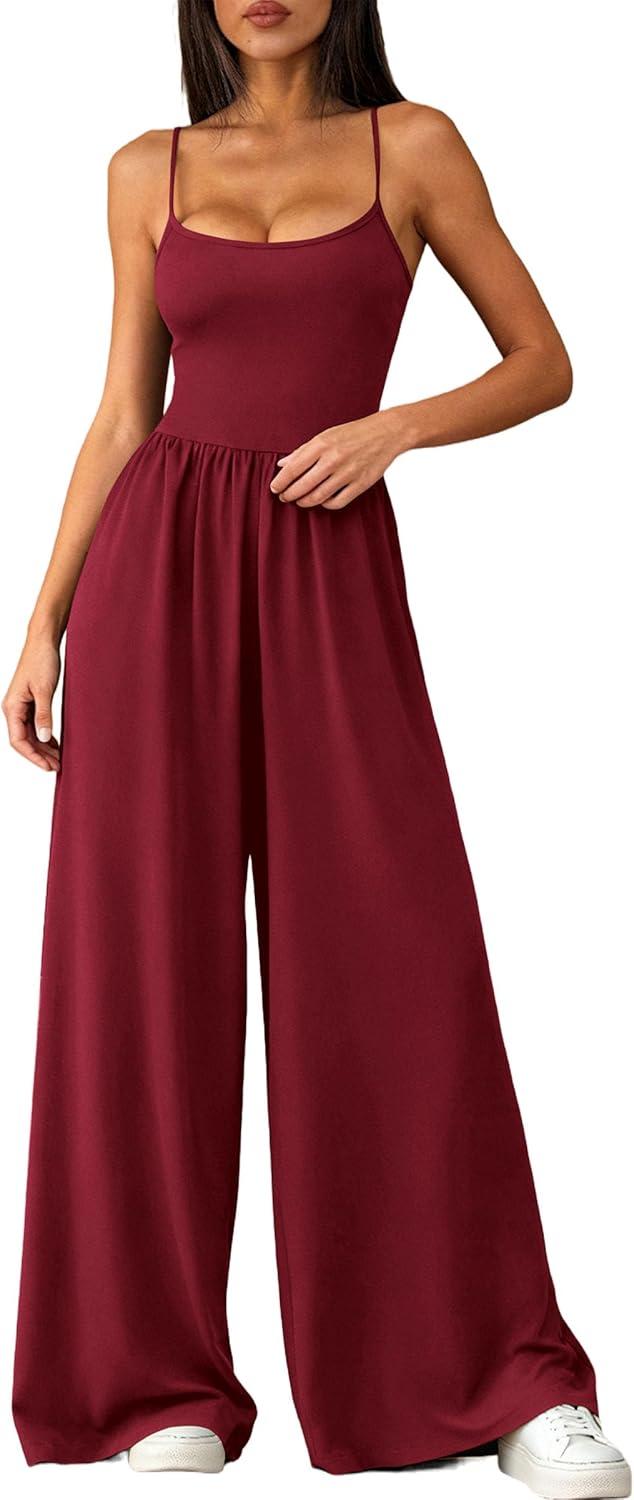 imagePRETTYGARDEN Summer Jumpsuits for Women Casual 2026 Wide Leg Date Night Rompers Sleeveless Beach Vacation One Piece OutfitsWine Red