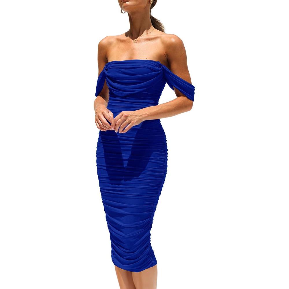 PRETTYGARDEN Summer Off The Shoulder Ruched Bodycon Dresses Sleeveless Sexy Party Club Midi Dress(Bright Blue)