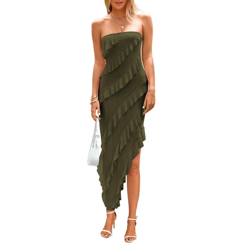 PRETTYGARDEN Summer Wedding Guest Dresses for Women 2026 Strapless Tube Ruffle Elegant Dinner Cocktail Long Spring Dress(Army Green)