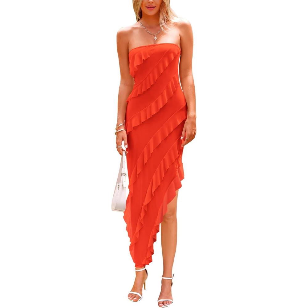 PRETTYGARDEN Summer Wedding Guest Dresses for Women 2026 Strapless Tube Ruffle Elegant Dinner Cocktail Long Spring Dress(Orange)
