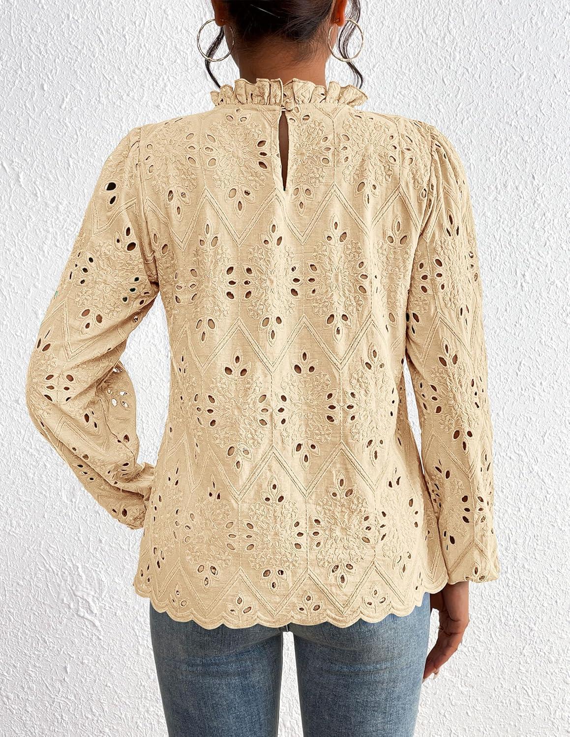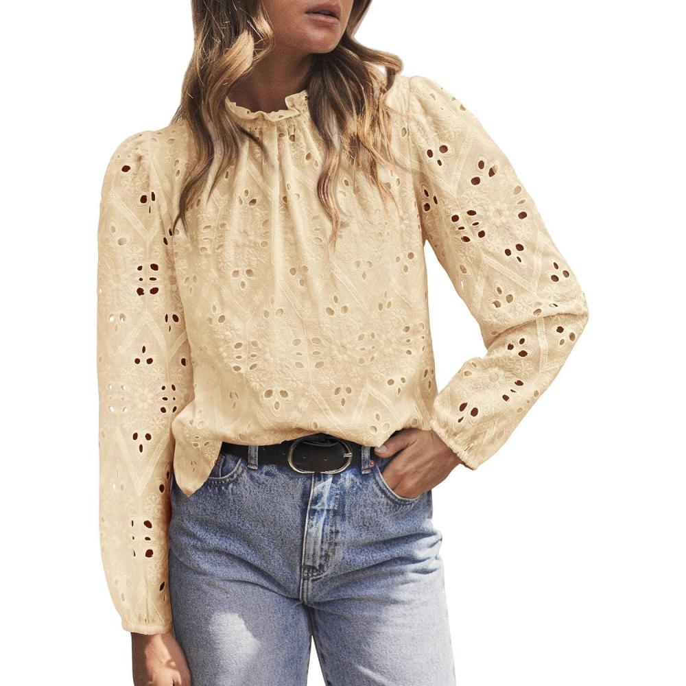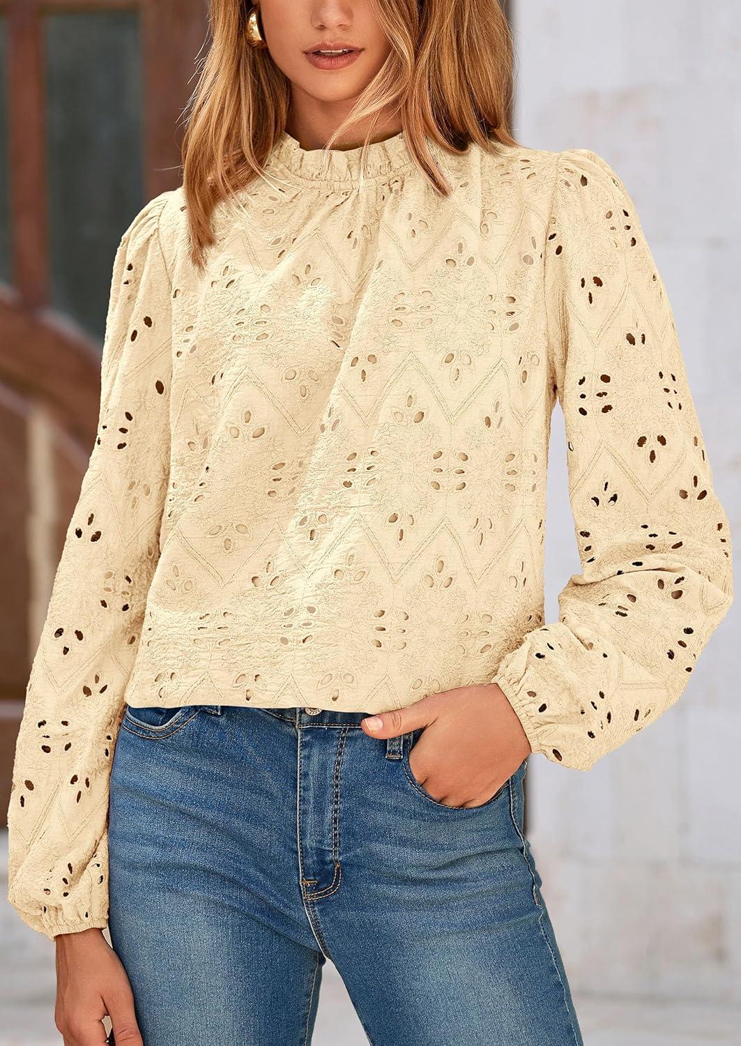 PRETTYGARDEN Tops for Women Trendy 2025 Fall Long Sleeve Blouses Dressy Casual Embroidered Eyelet Shirts Going Out Outfits(Beige Yellow)