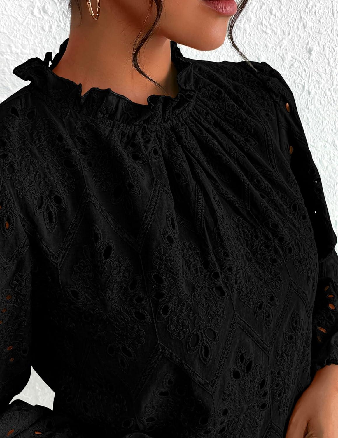 PRETTYGARDEN Tops for Women Trendy 2025 Fall Long Sleeve Blouses Dressy Casual Embroidered Eyelet Shirts Going Out Outfits(Black)