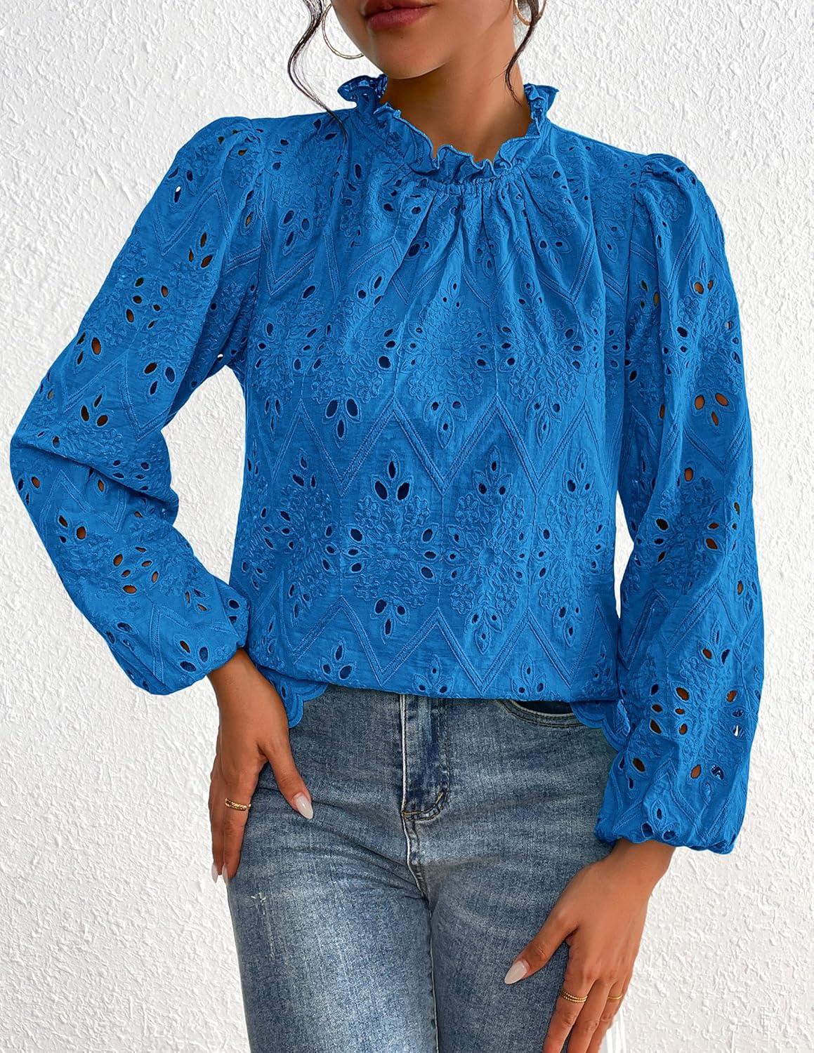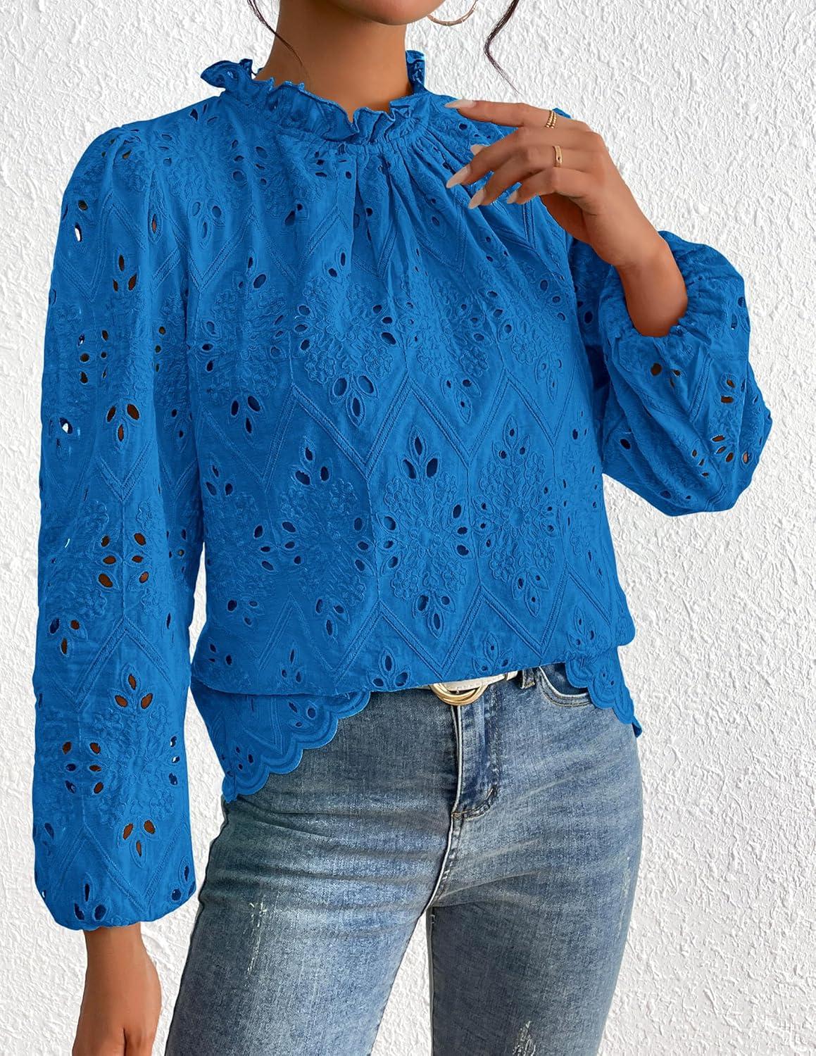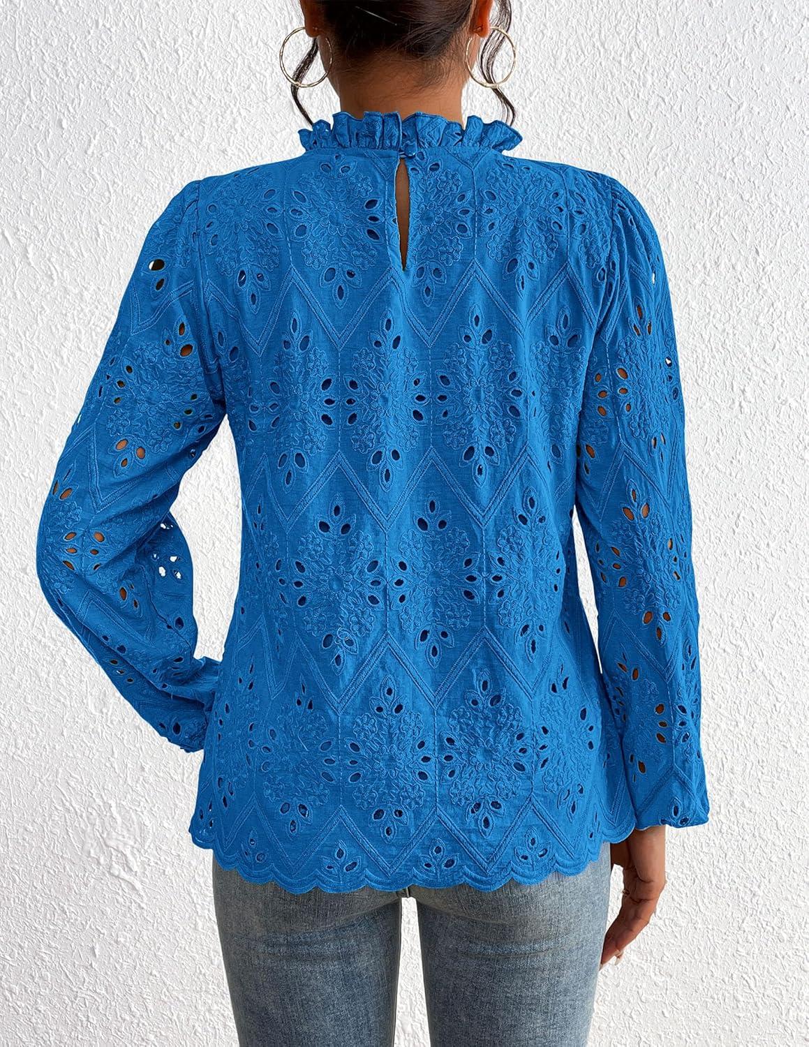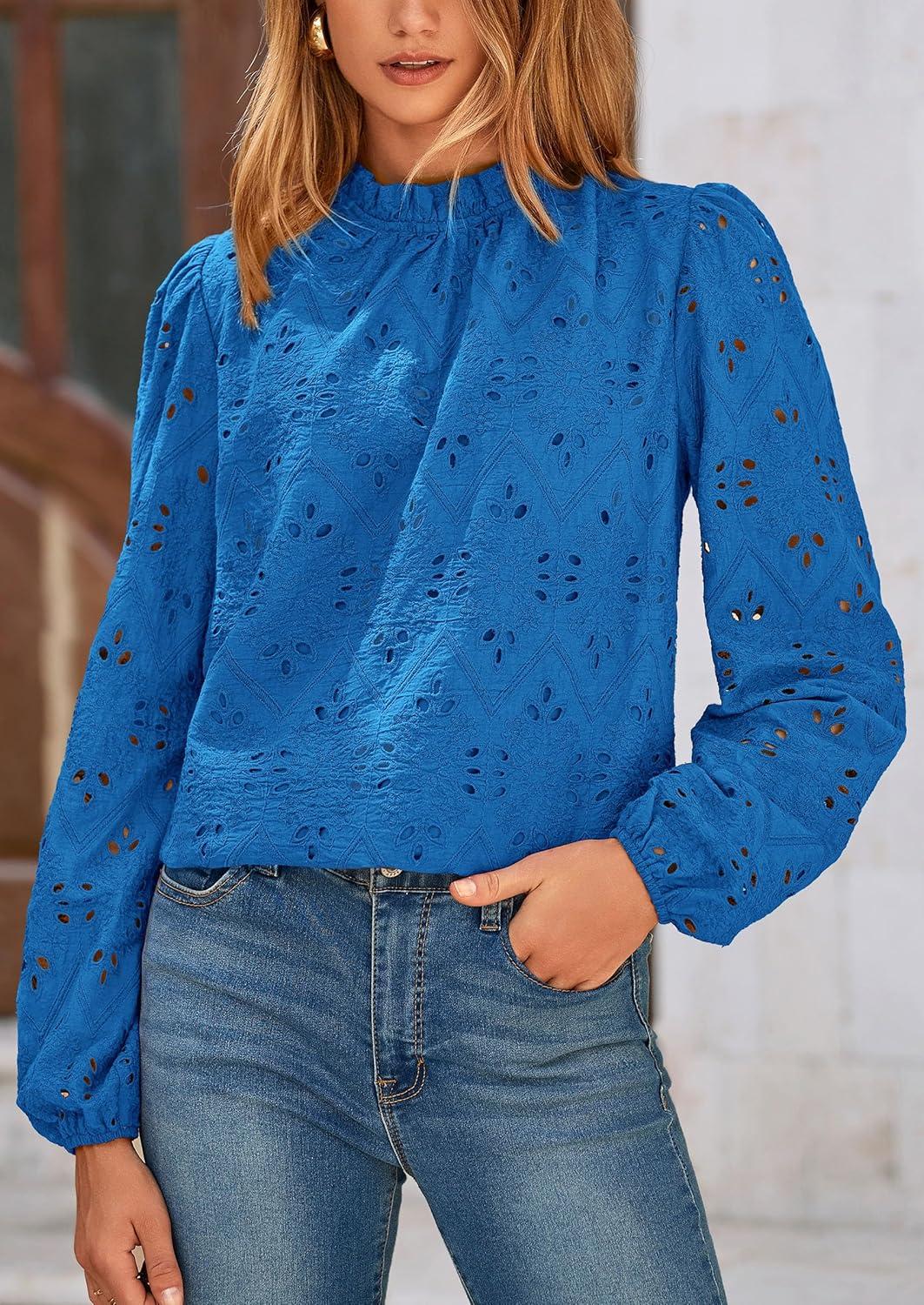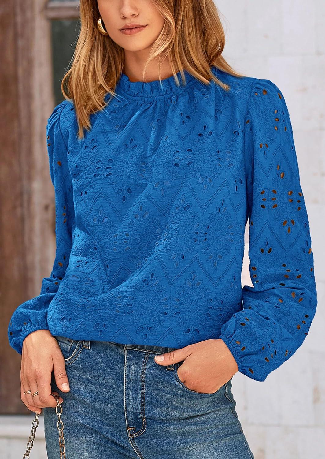 PRETTYGARDEN Tops for Women Trendy 2025 Fall Long Sleeve Blouses Dressy Casual Embroidered Eyelet Shirts Going Out Outfits(Brilliant Blue)