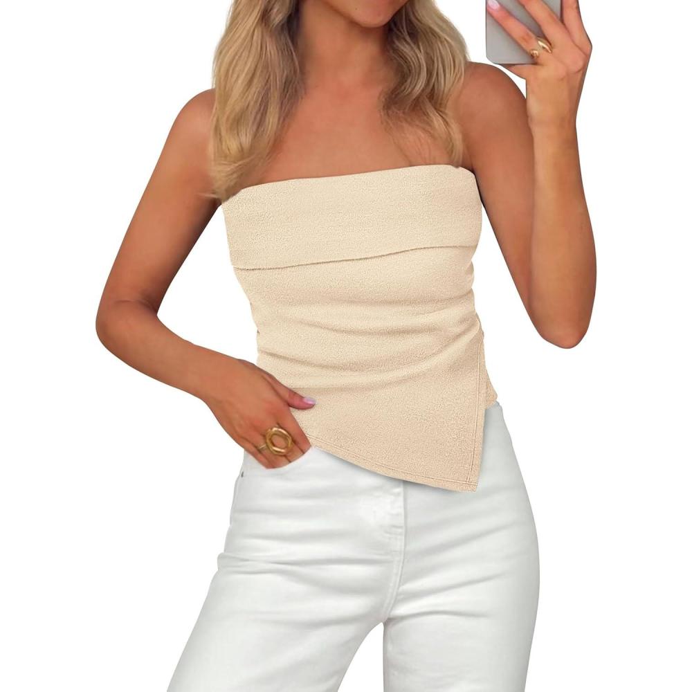 PRETTYGARDEN Tube Tops for Women 2026 Summer Strapless Asymmetrical Ruched Bandeau Shirts Trendy Spring Going Out Outfits(Beige)