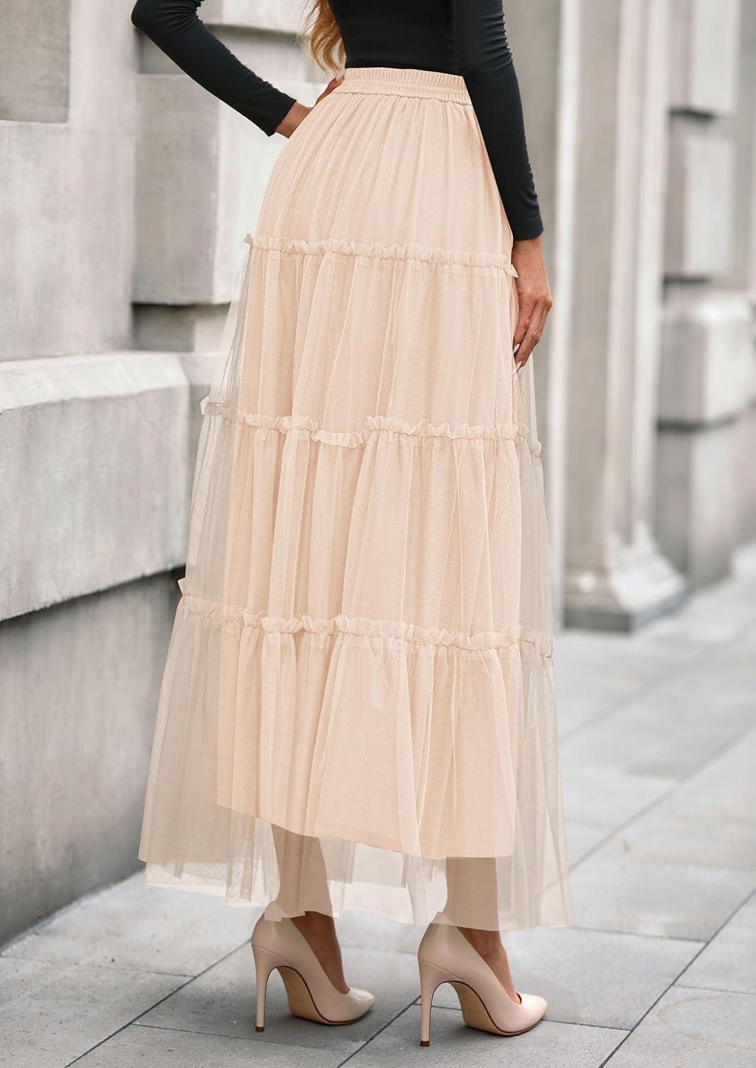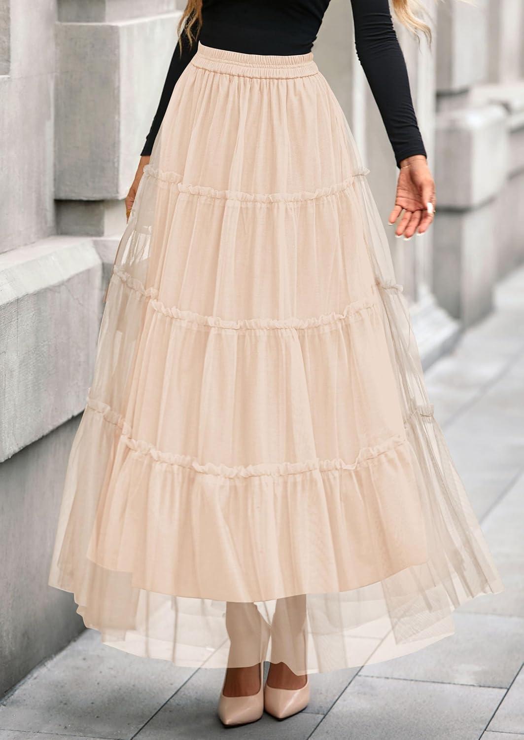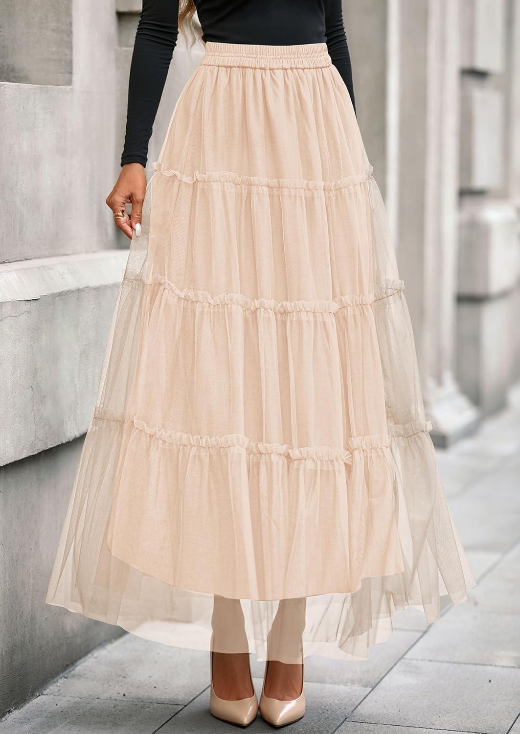 PRETTYGARDEN Tulle Skirts for Women 2025 Fall Fashion Elastic High Waisted Tiered Flowy A-Line Casual Maxi Long Skirt(Beige)
