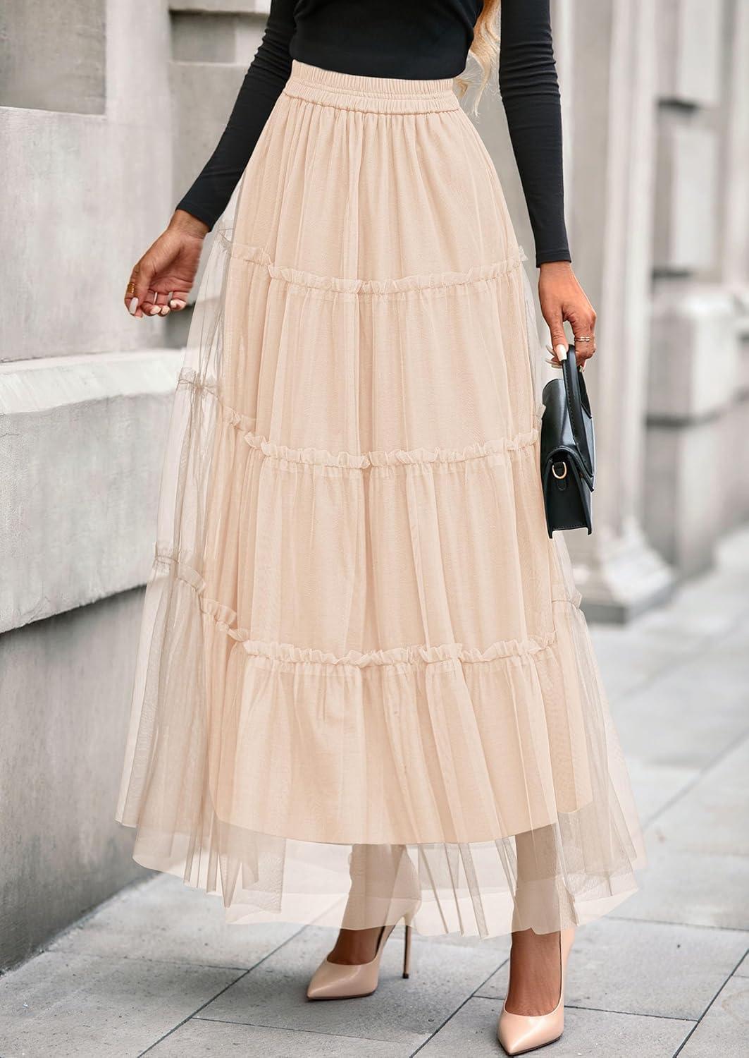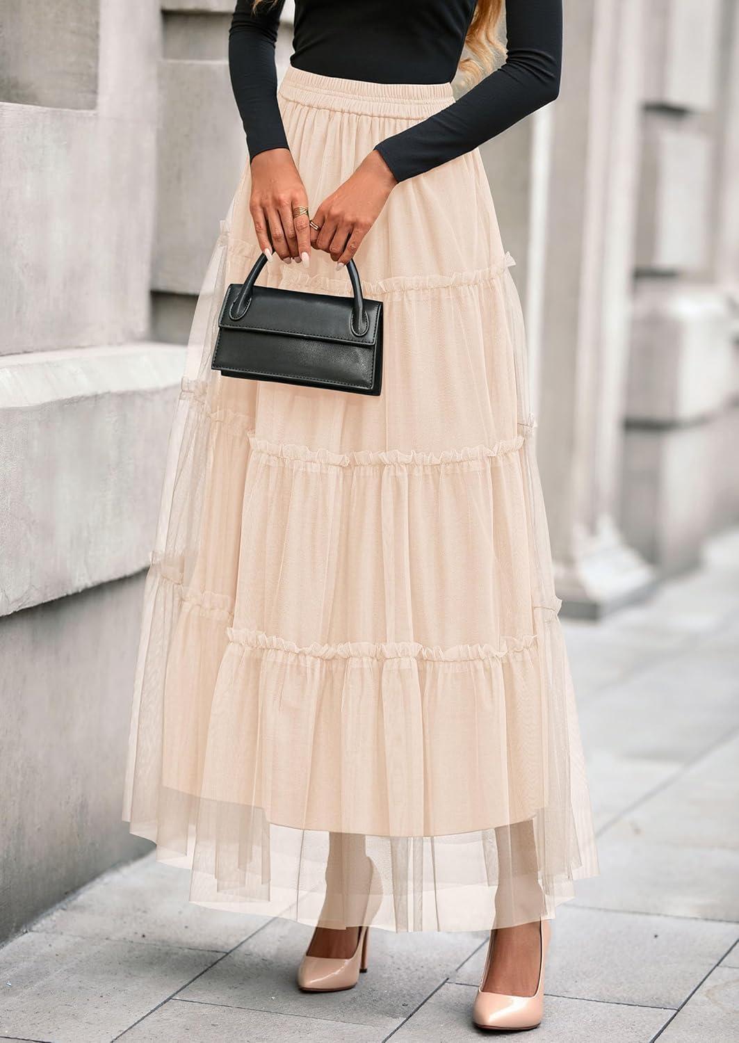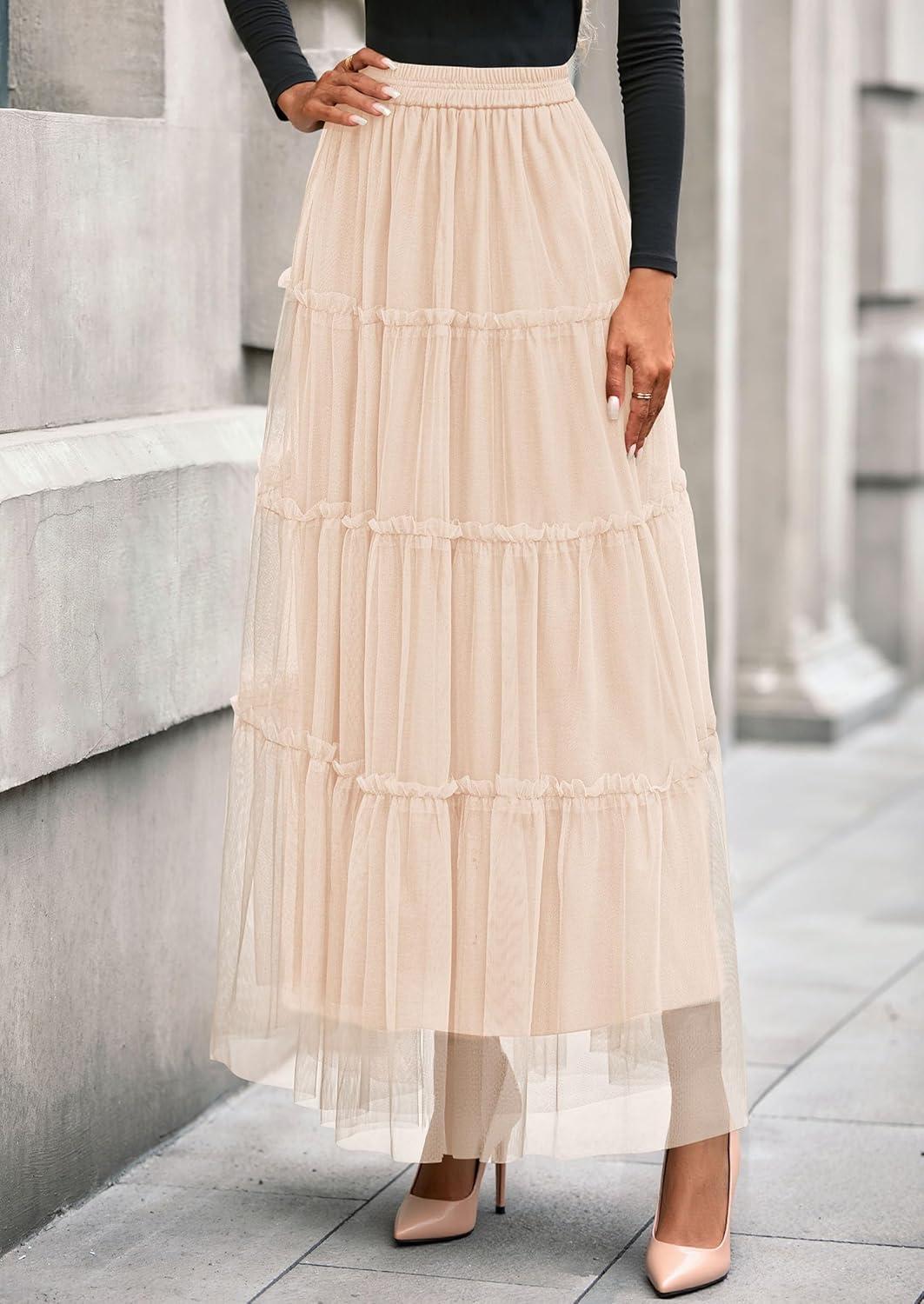 PRETTYGARDEN Tulle Skirts for Women 2025 Fall Fashion Elastic High Waisted Tiered Flowy A-Line Casual Maxi Long Skirt(Beige)