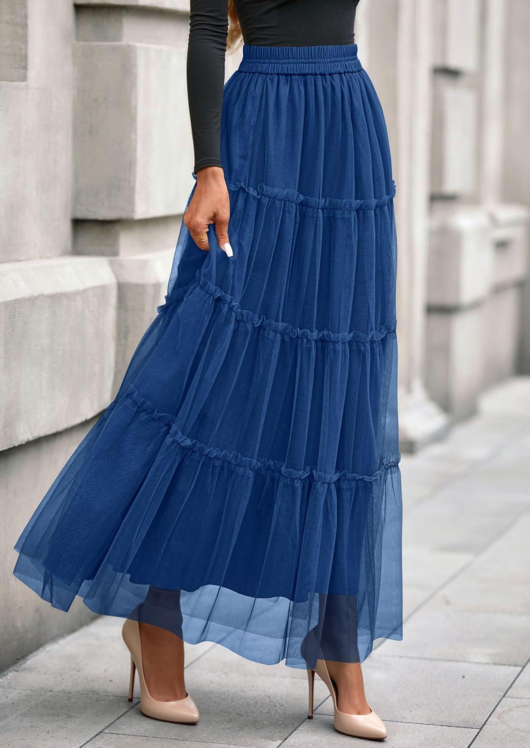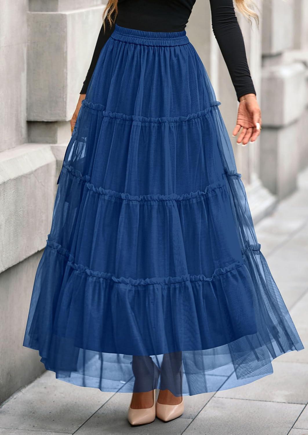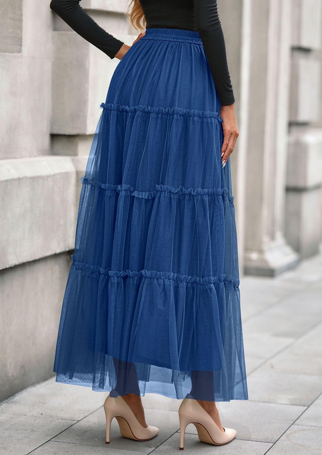 PRETTYGARDEN Tulle Skirts for Women 2025 Fall Fashion Elastic High Waisted Tiered Flowy A-Line Casual Maxi Long Skirt(Blue)