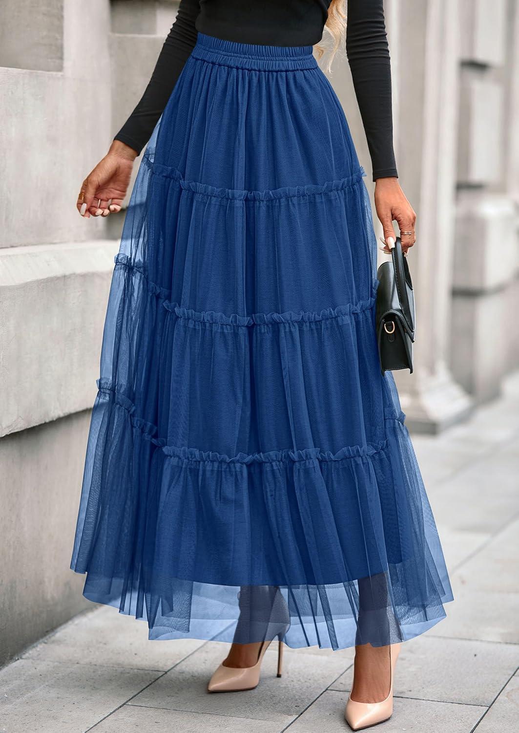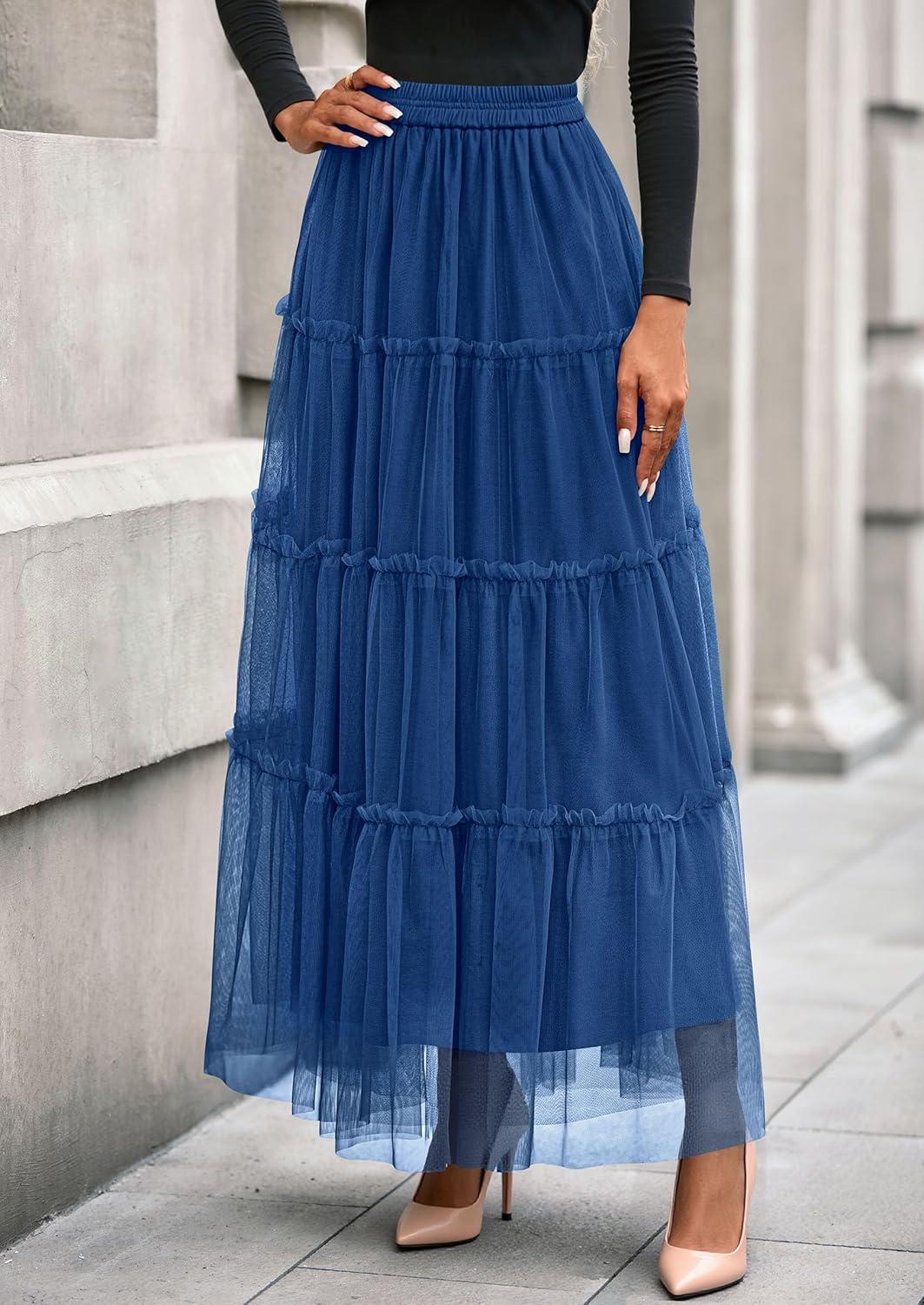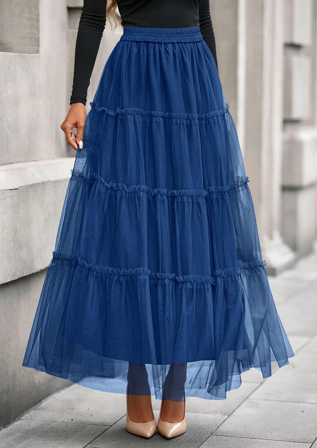 PRETTYGARDEN Tulle Skirts for Women 2025 Fall Fashion Elastic High Waisted Tiered Flowy A-Line Casual Maxi Long Skirt(Blue)