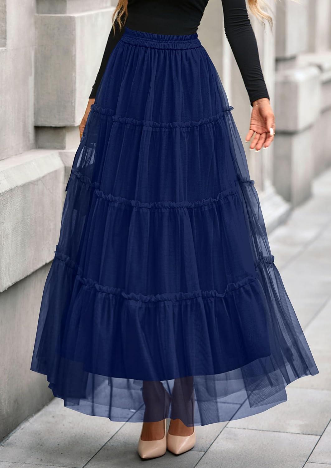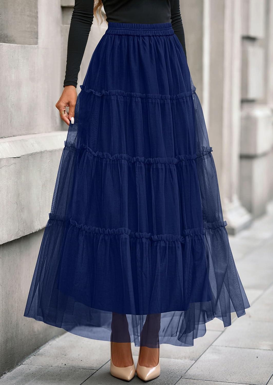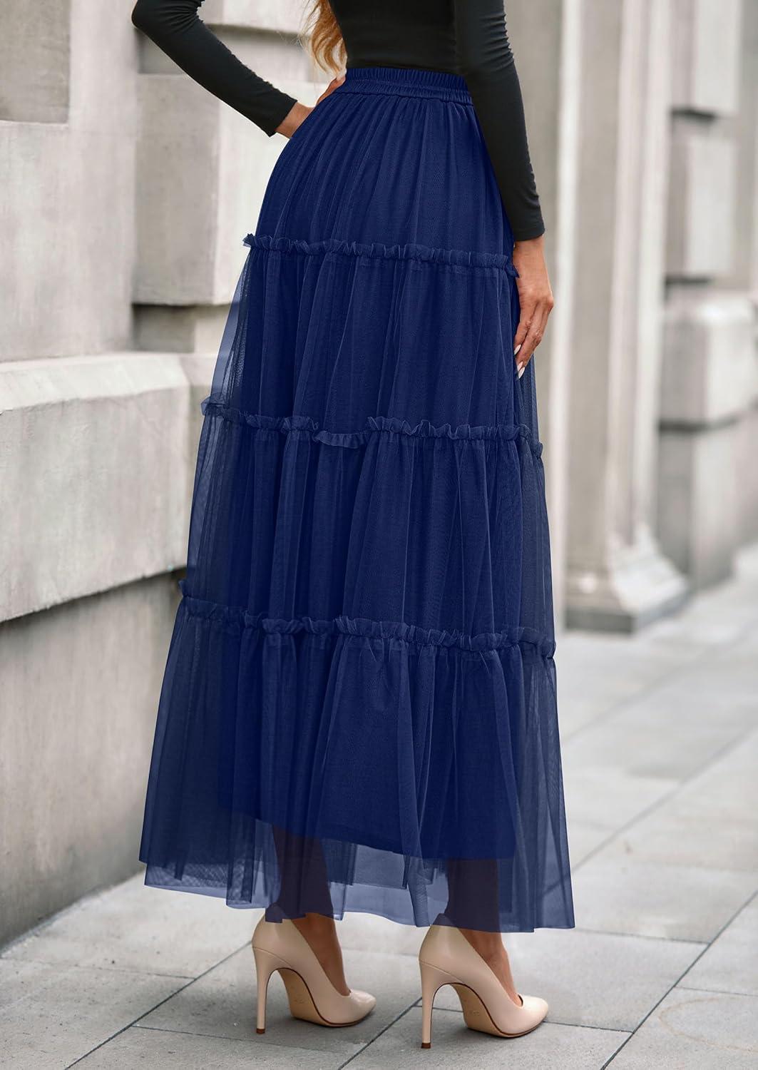PRETTYGARDEN Tulle Skirts for Women 2025 Fall Fashion Elastic High Waisted Tiered Flowy A-Line Casual Maxi Long Skirt(Navy Blue)