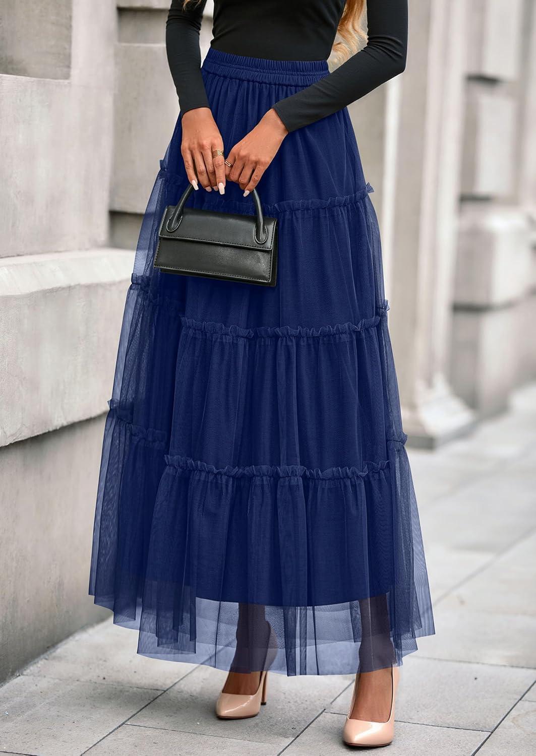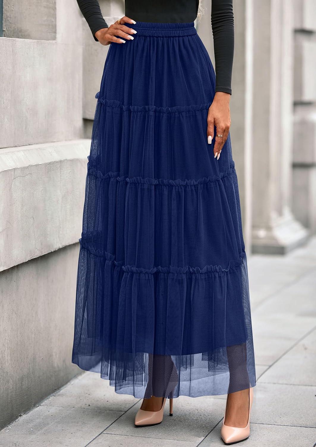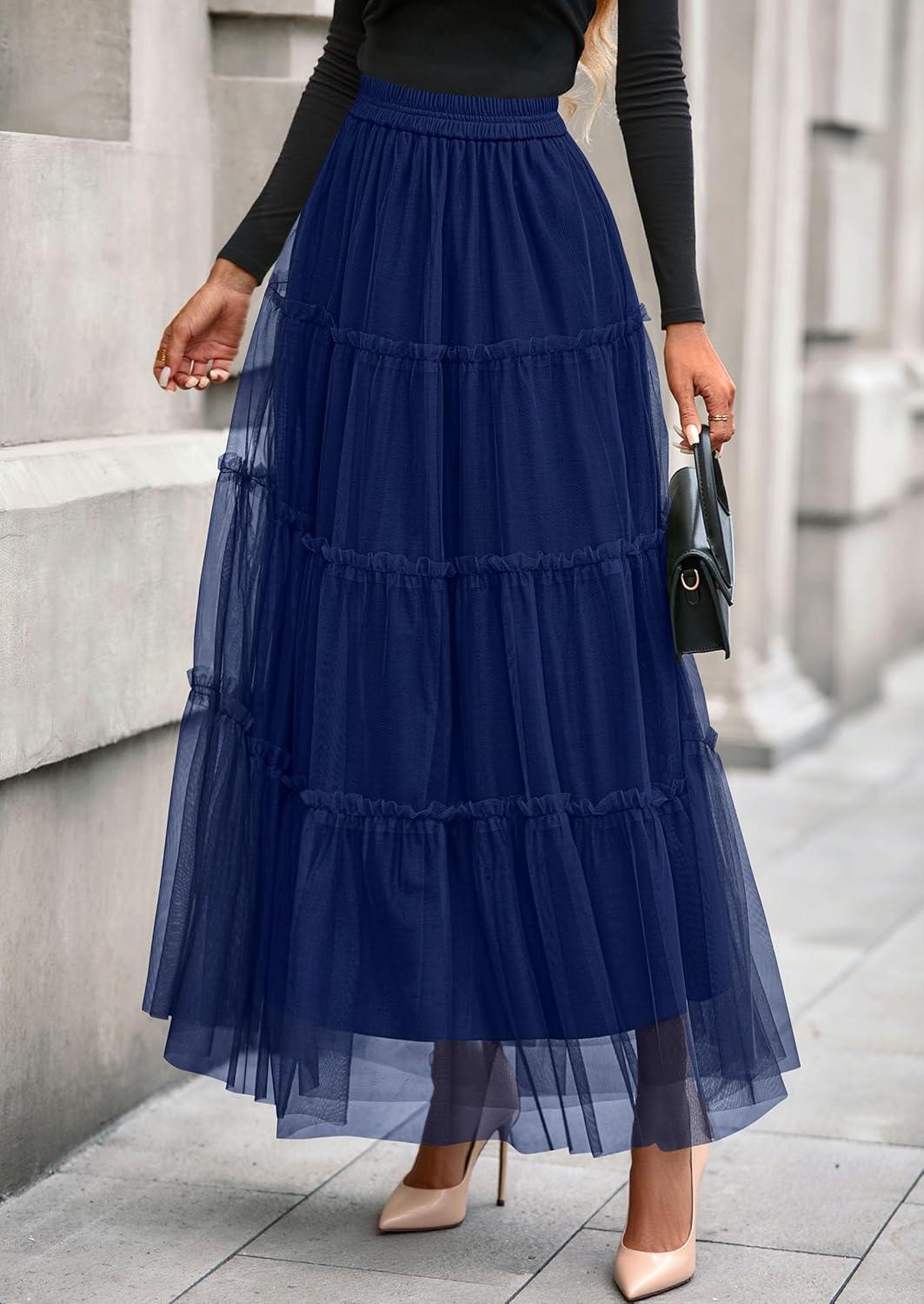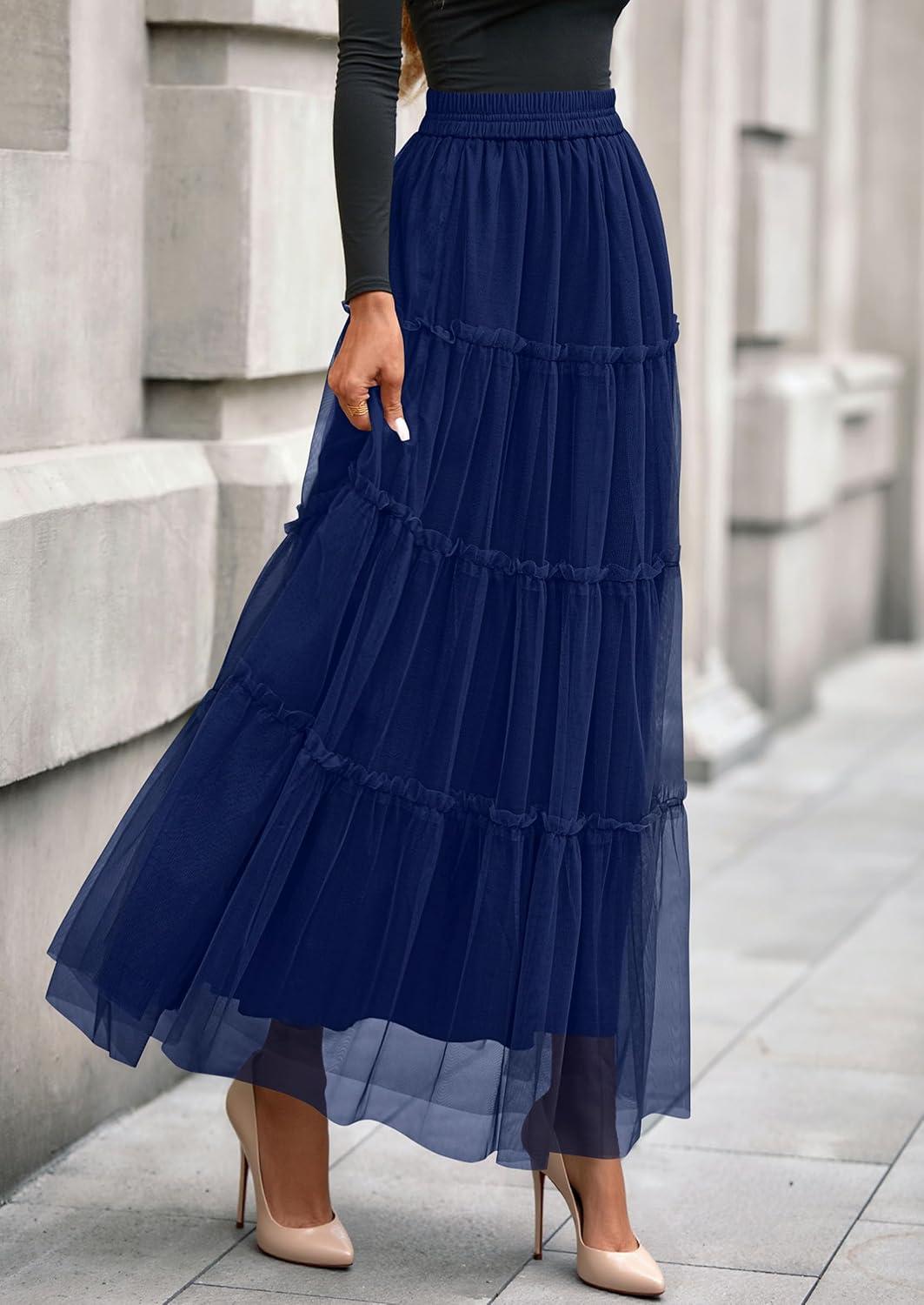 PRETTYGARDEN Tulle Skirts for Women 2025 Fall Fashion Elastic High Waisted Tiered Flowy A-Line Casual Maxi Long Skirt(Navy Blue)