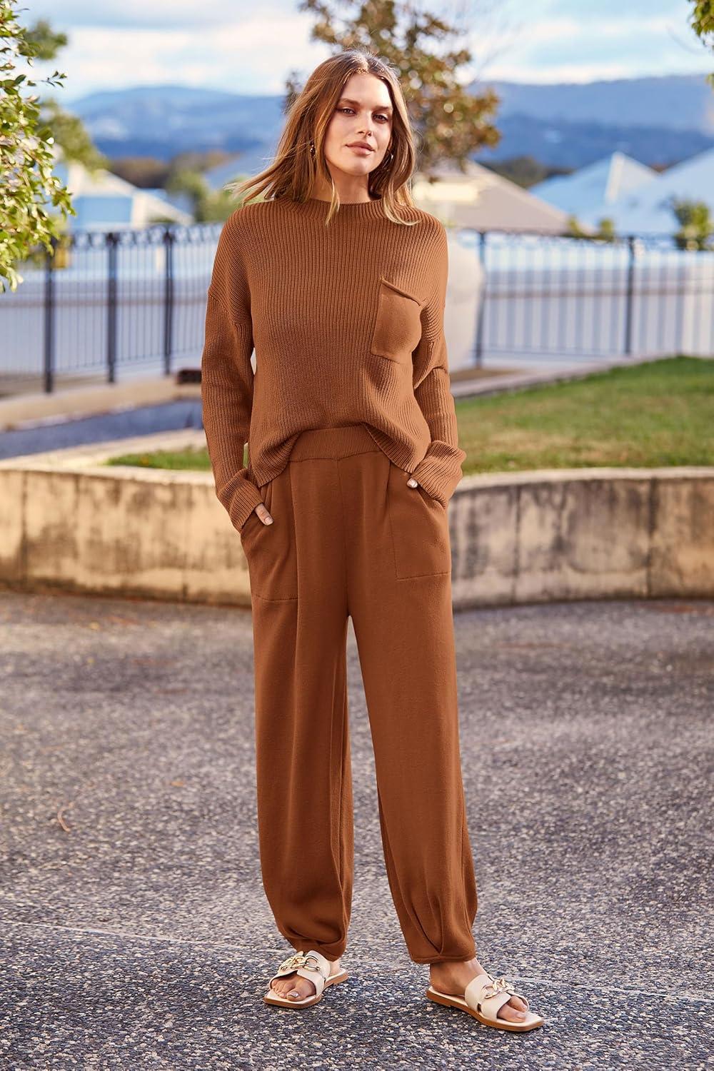 imagePRETTYGARDEN Two Piece Sets for Women 2025 Pullover Sweater High Waisted Sweatpants Tracksuit Lounge Set Fall Winter OutfitsBrown
