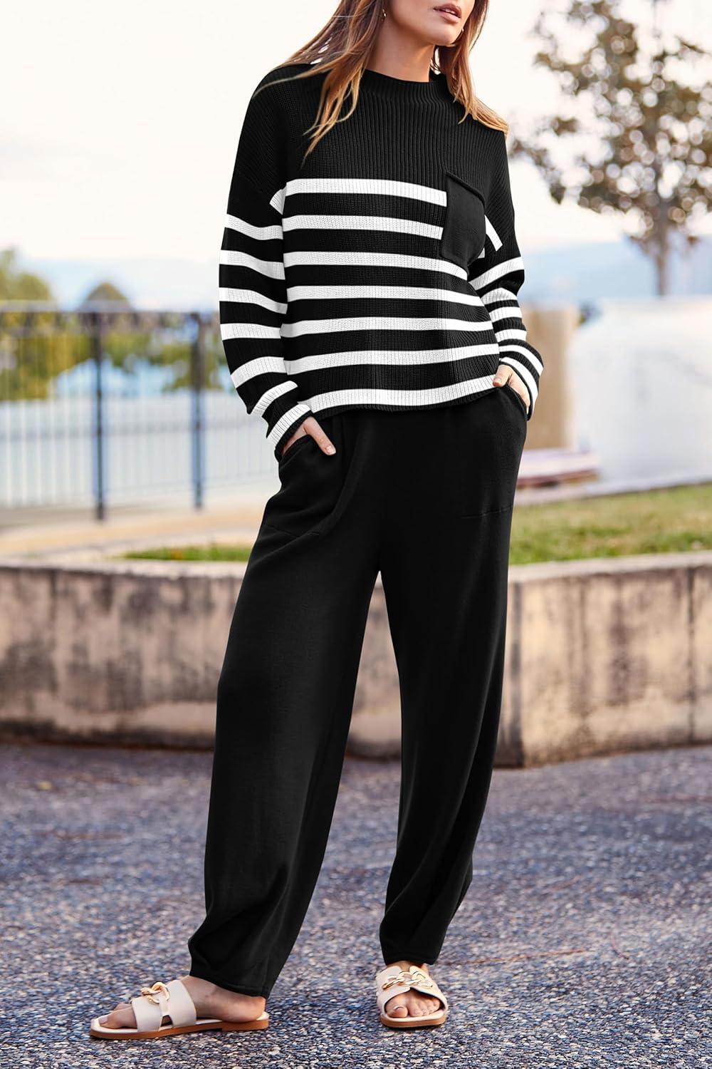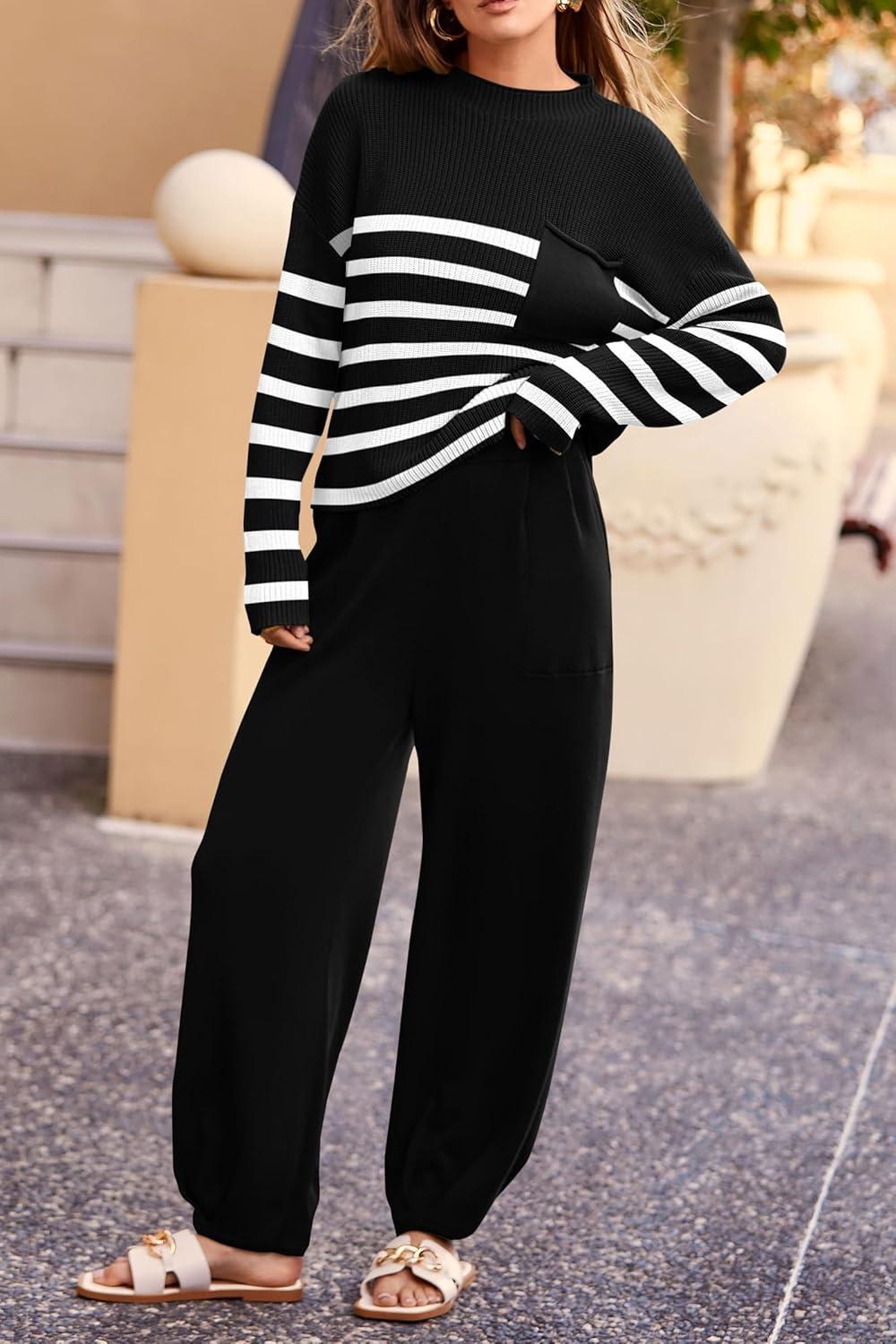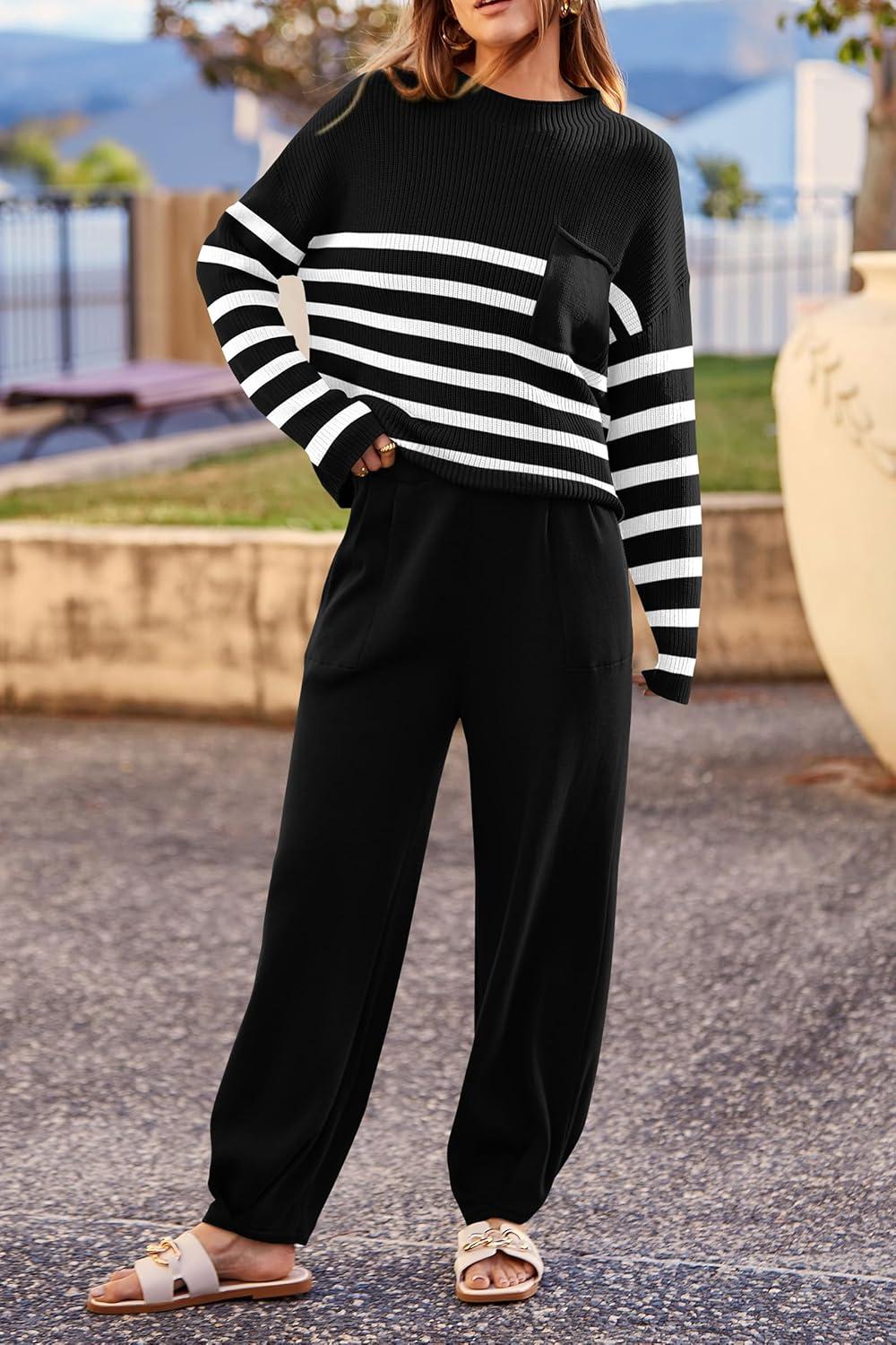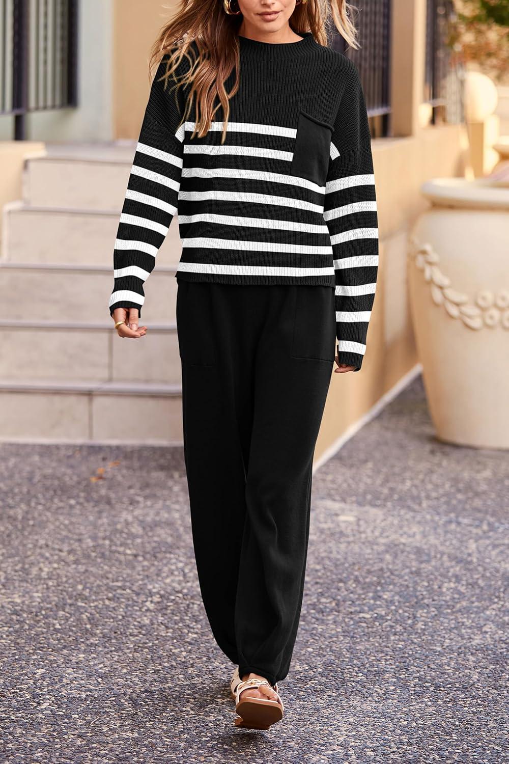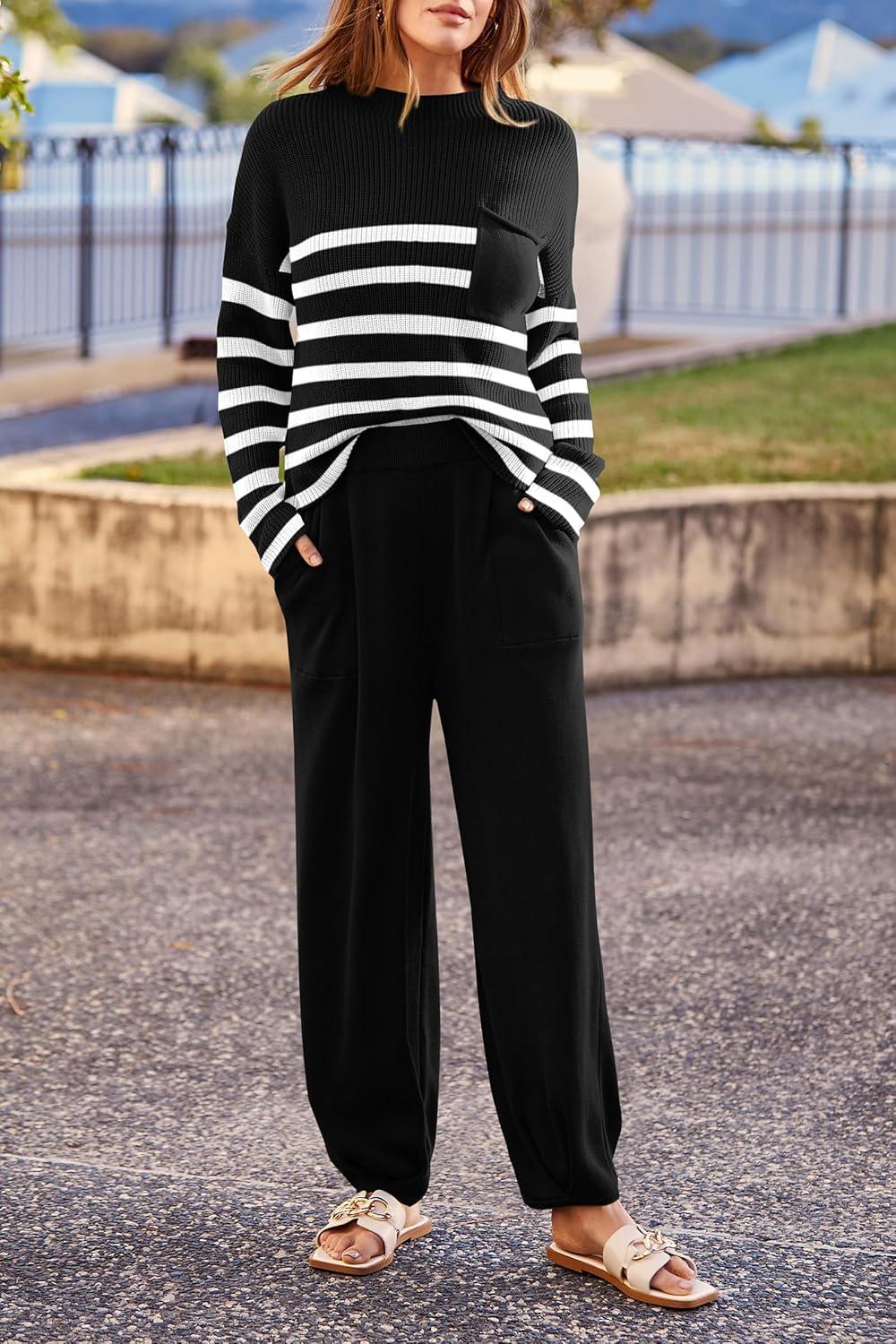 PRETTYGARDEN Two Piece Sets for Women 2025 Pullover Sweater High Waisted Sweatpants Tracksuit Lounge Set Fall Winter Outfits(Striped Black)