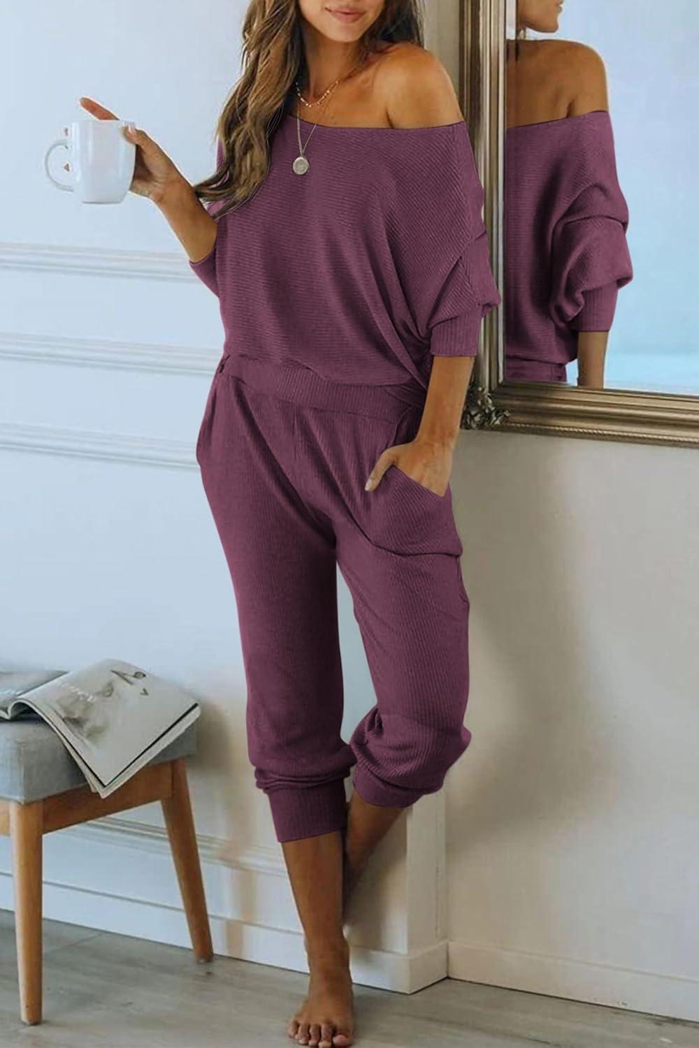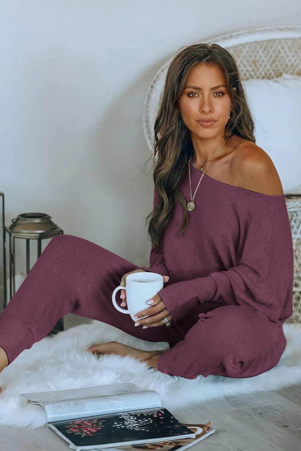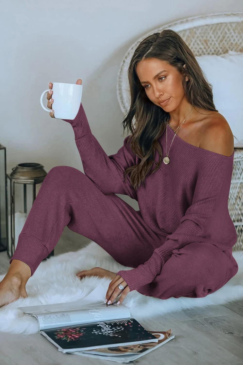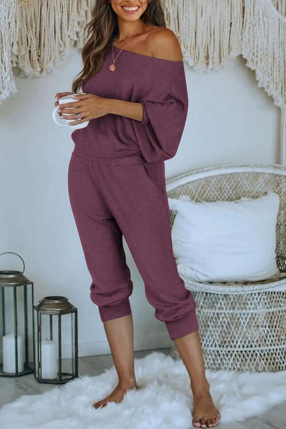 PRETTYGARDEN Two Piece Sets for Women Fall 2025 Ribbed Knit Off Shoulder Tops Lounge Pants Tracksuit Fashion Clothing(Purple Red)