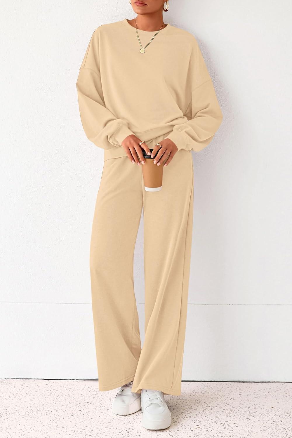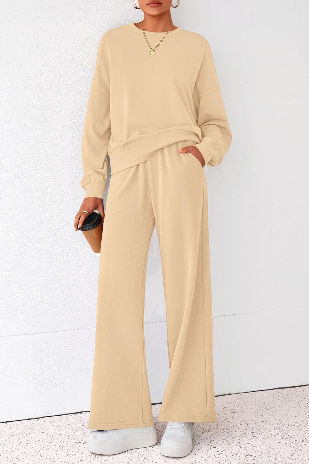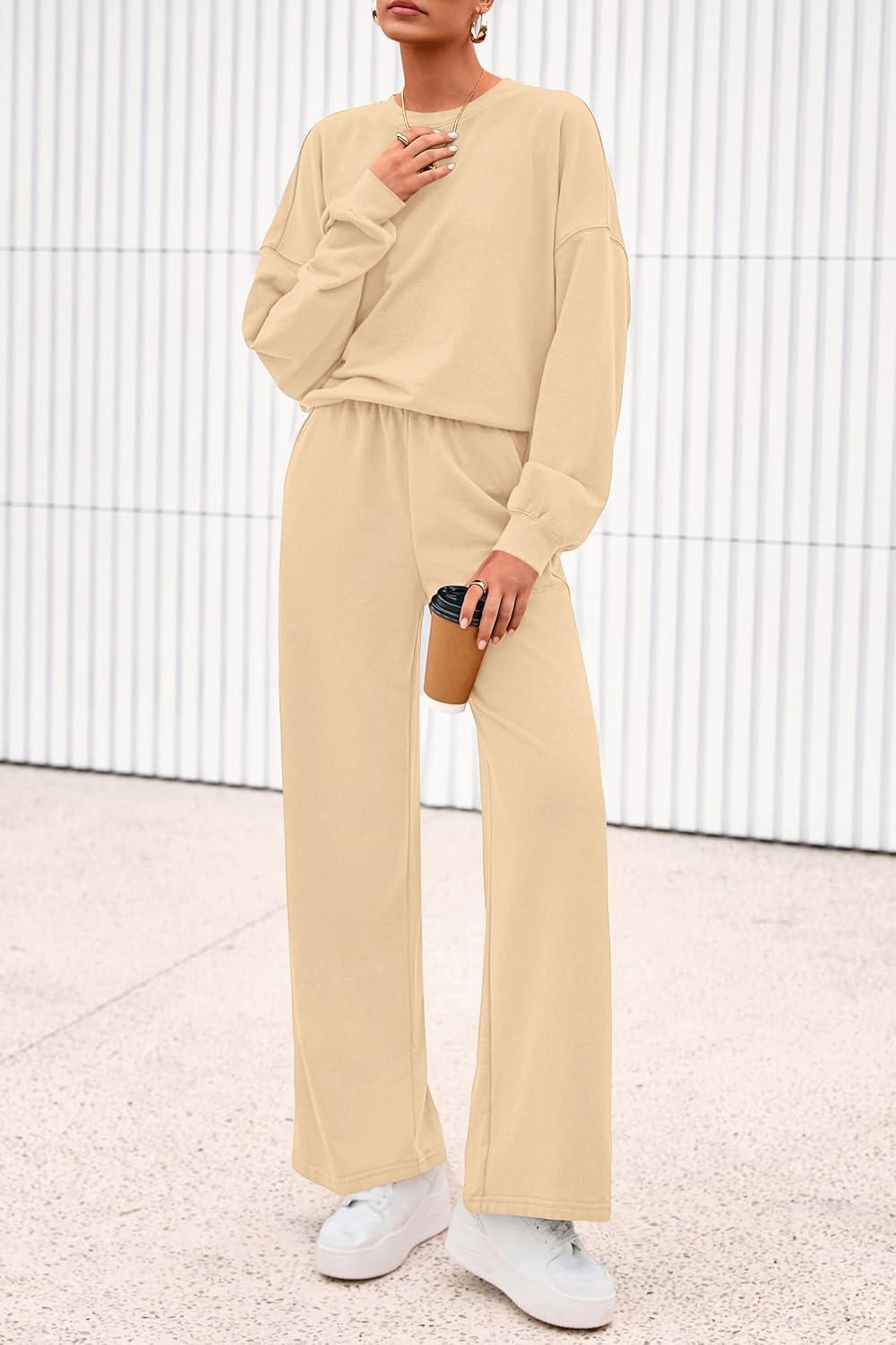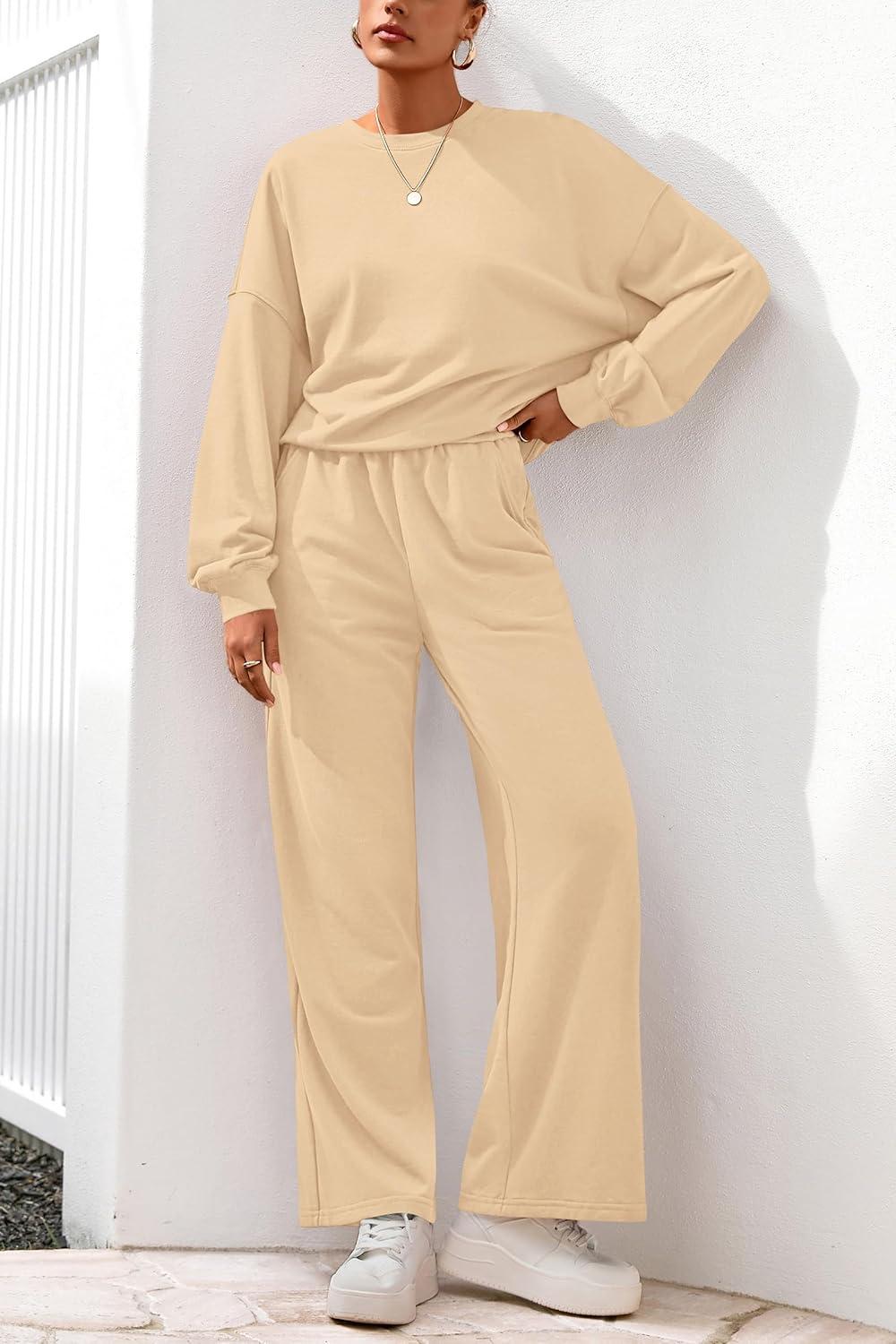 PRETTYGARDEN Women 2 Piece Outfits 2025 Fall Sweatsuits Crewneck Sweatshirt Wide Leg Sweatpants Lounge Sets Tracksuit(Apricot)