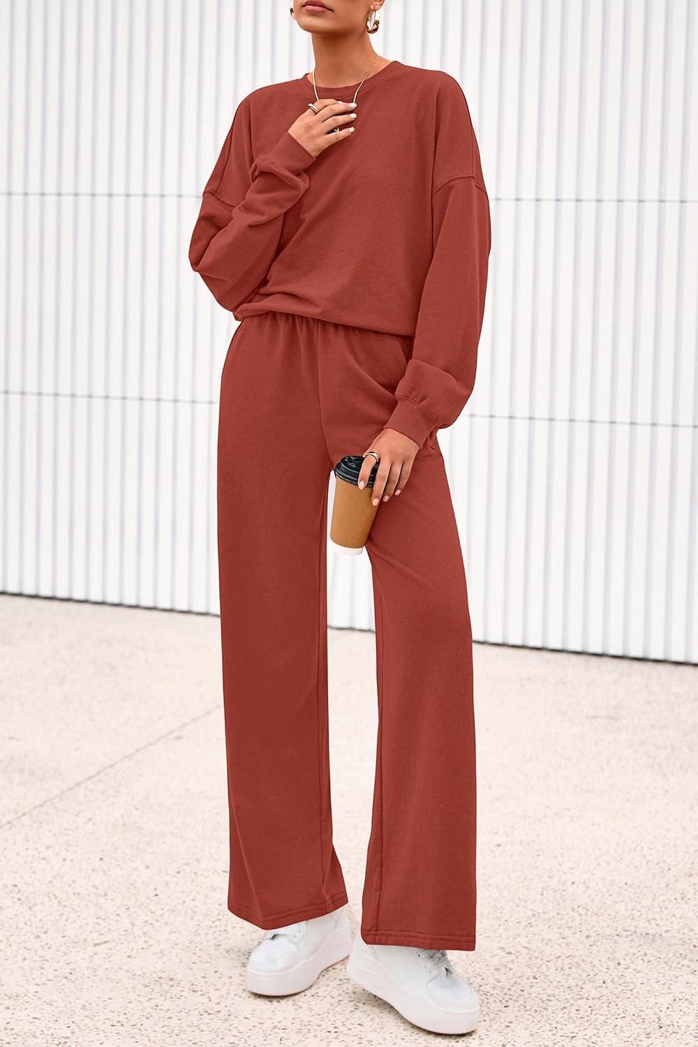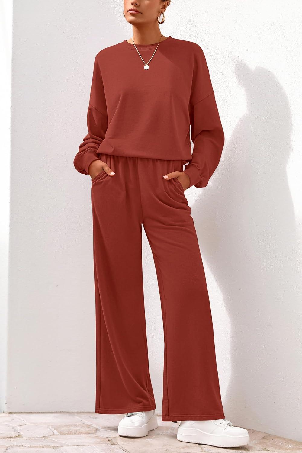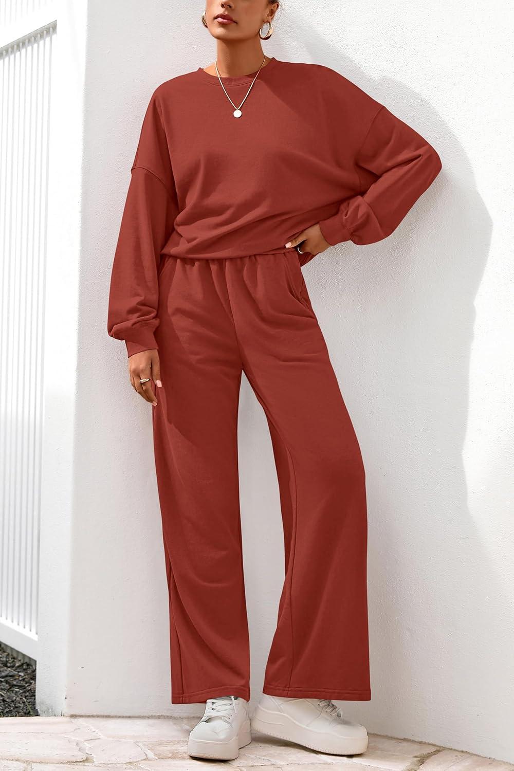 PRETTYGARDEN Women 2 Piece Outfits 2025 Fall Sweatsuits Crewneck Sweatshirt Wide Leg Sweatpants Lounge Sets Tracksuit(Brick Red)