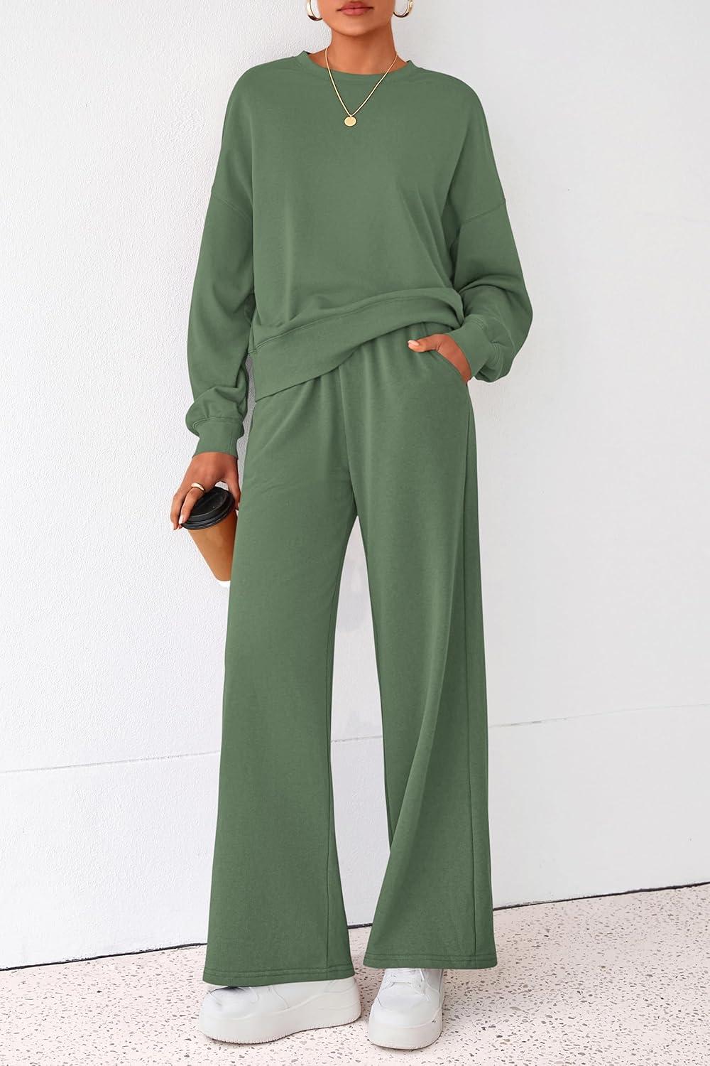 PRETTYGARDEN Women 2 Piece Outfits 2025 Fall Sweatsuits Crewneck Sweatshirt Wide Leg Sweatpants Lounge Sets Tracksuit(Green)
