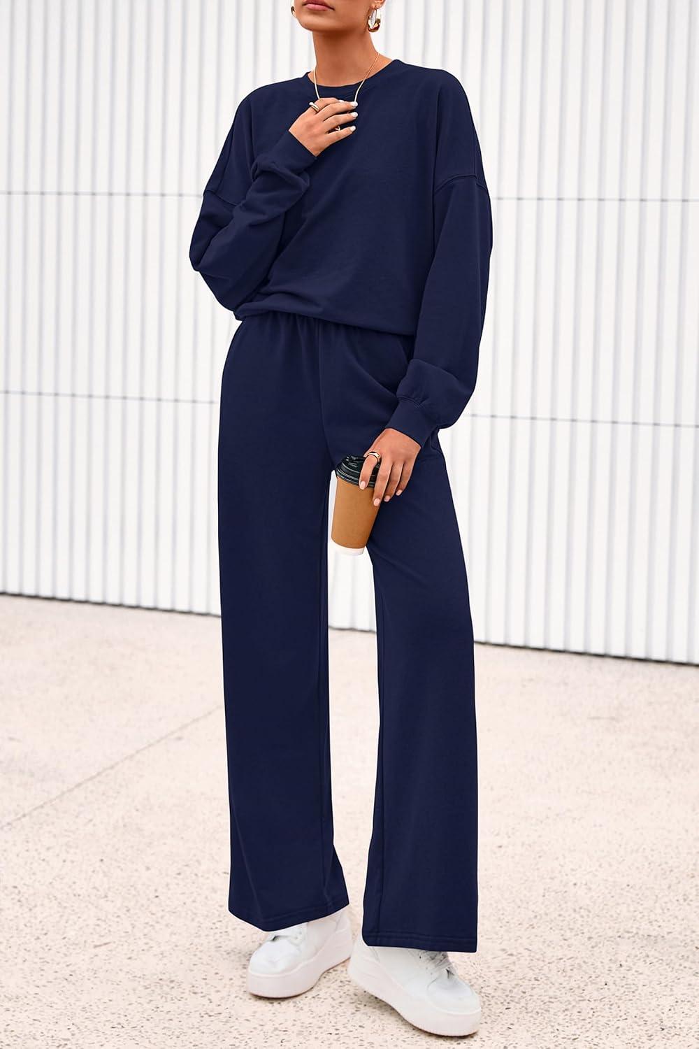 PRETTYGARDEN Women 2 Piece Outfits 2025 Fall Sweatsuits Crewneck Sweatshirt Wide Leg Sweatpants Lounge Sets Tracksuit(Navy Blue)