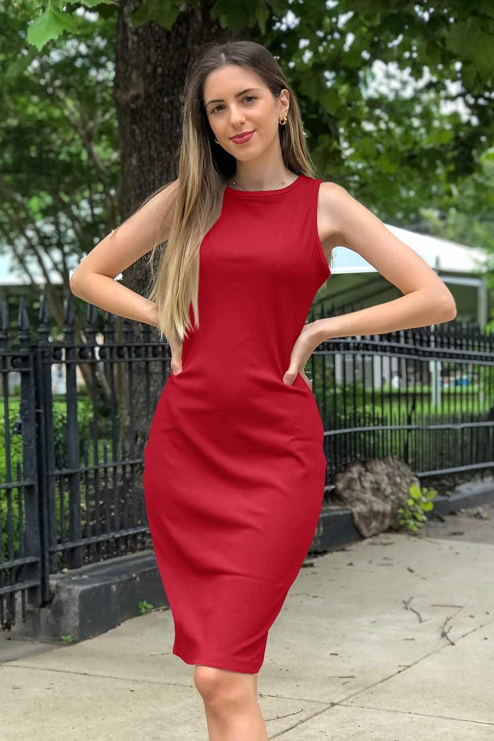 PRETTYGARDEN Women Bodycon Midi Dress 2025 Summer Spring Casual Vacation Sundress Fitted Sleeveless Tank Dresses(Red)