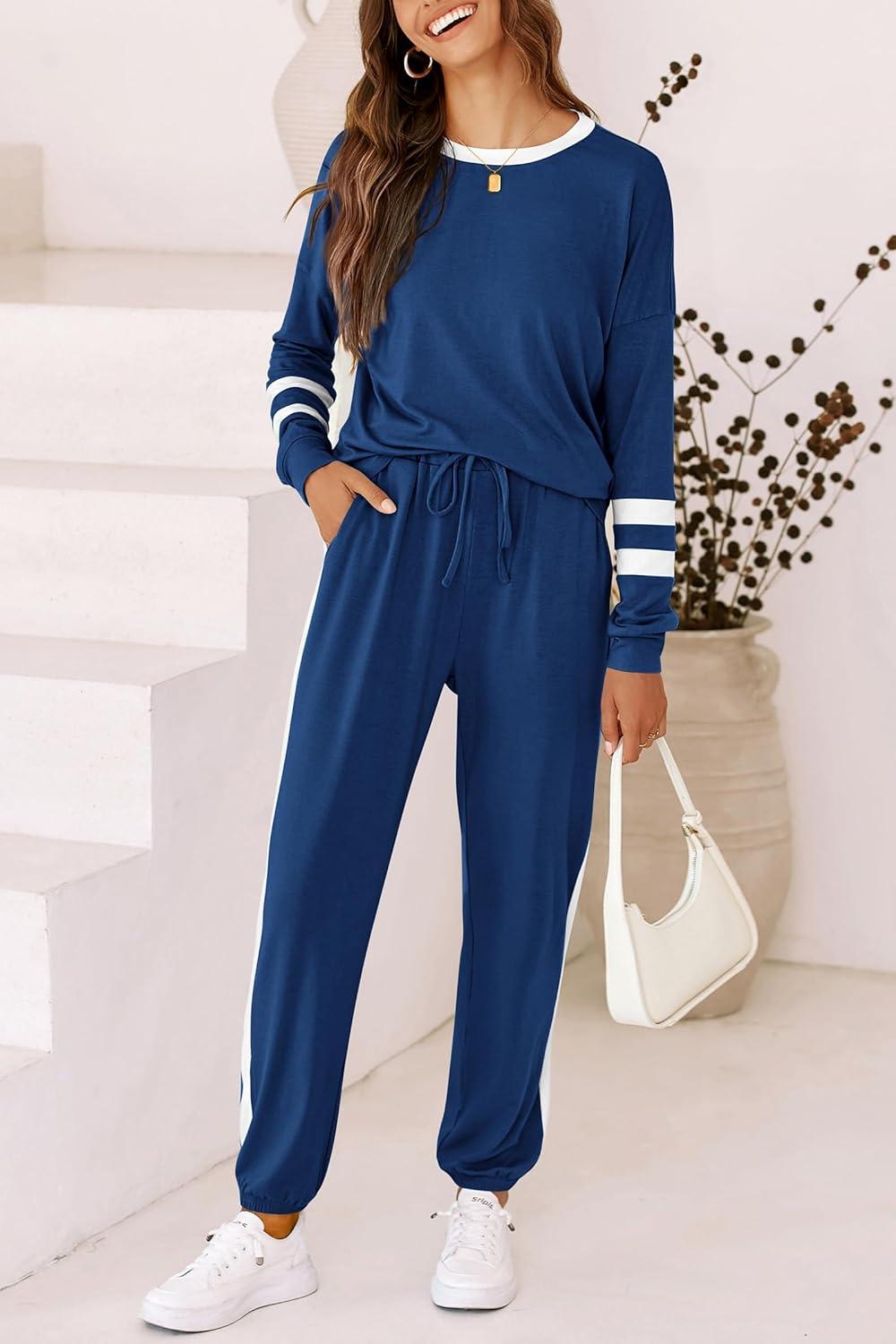 PRETTYGARDEN Women Fall 2 Piece Lounge Outfit Long Sleeve Tops High Waisted Jogger Pants Set Spring Travel Clothes Tracksuit(Striped Dark Blue)