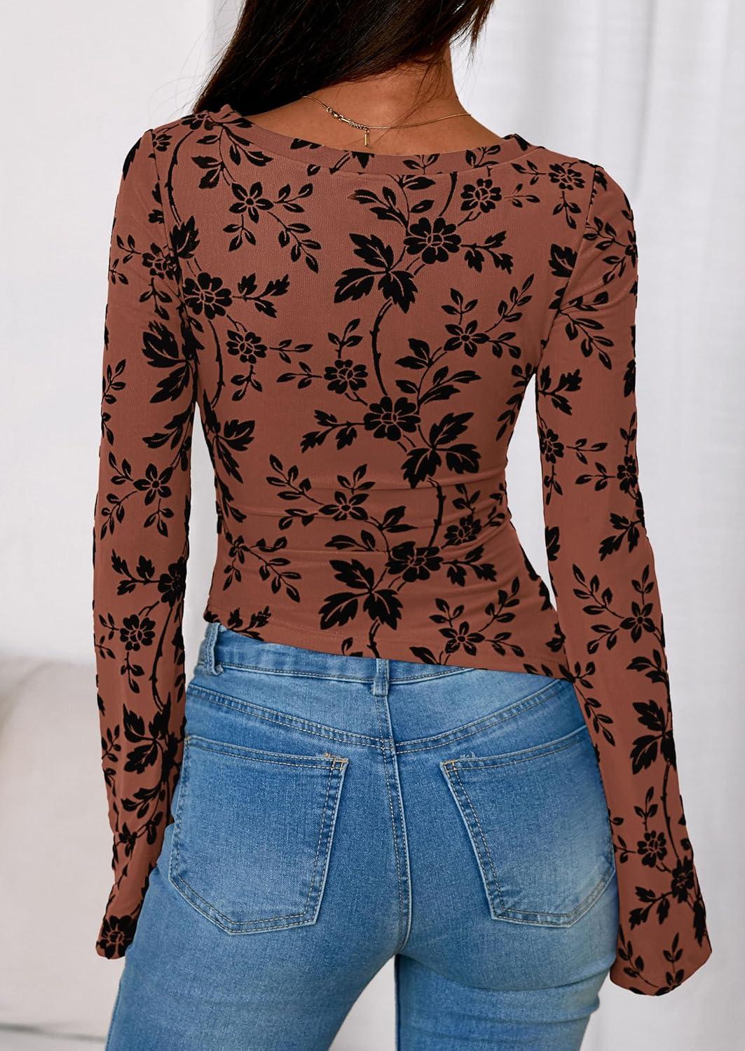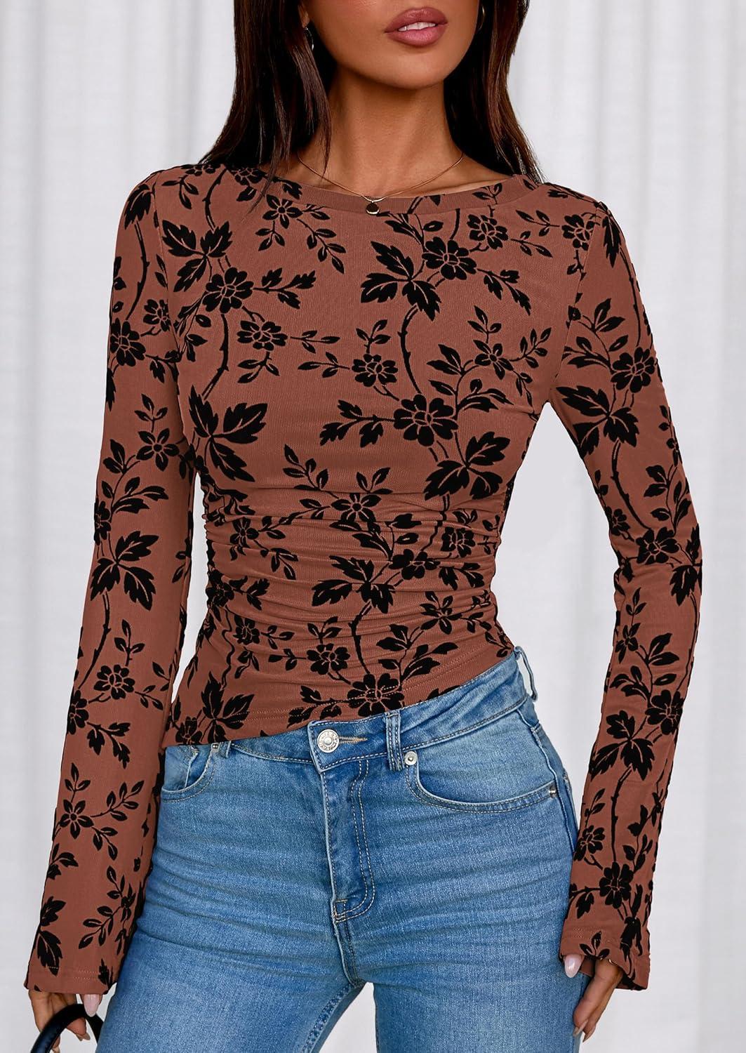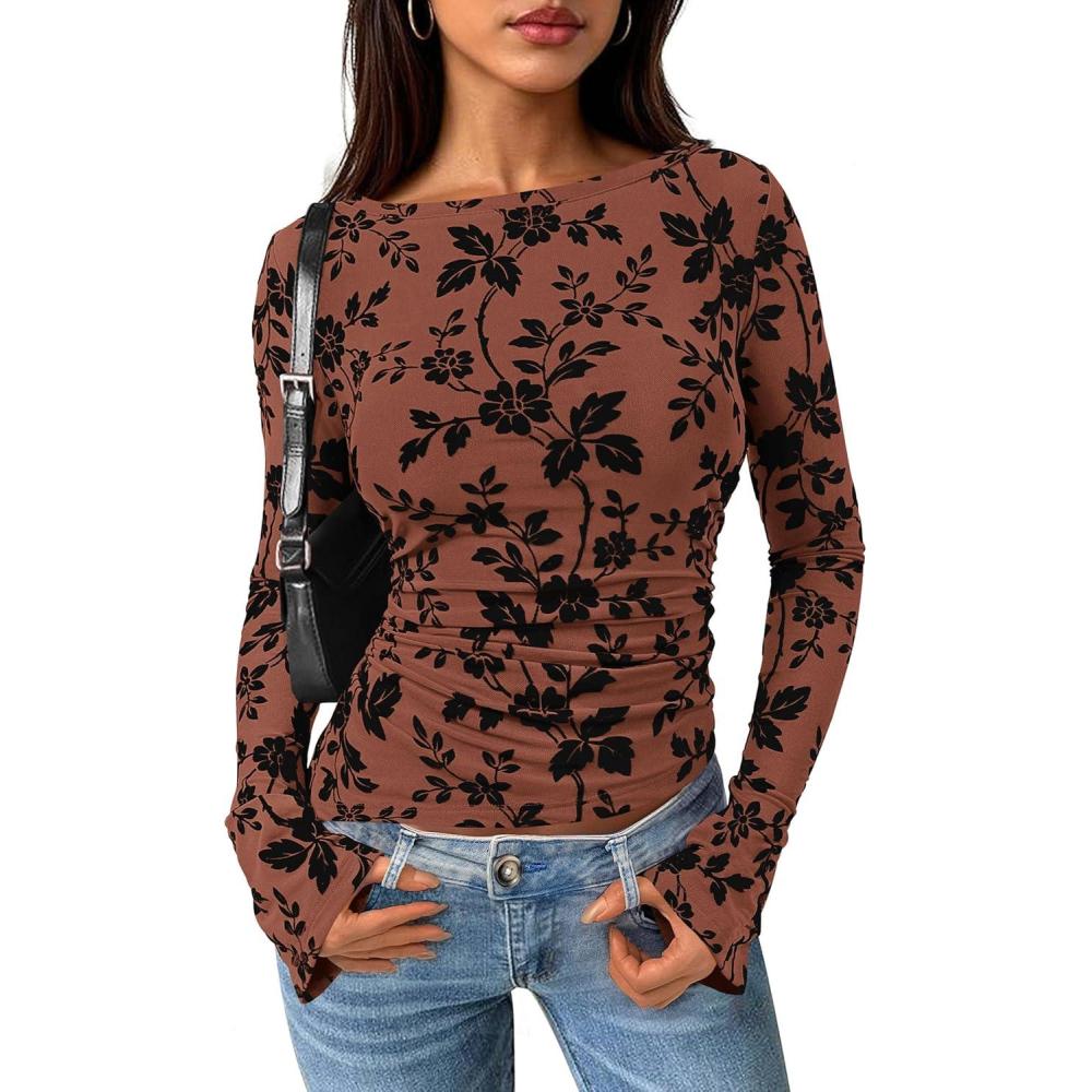 PRETTYGARDEN Women Long Sleeve Floral Mesh Tops Blouse 2025 Fall Trendy Boat Neck Ruched Fitted Shirt Going Out Date Outfits(Brown)