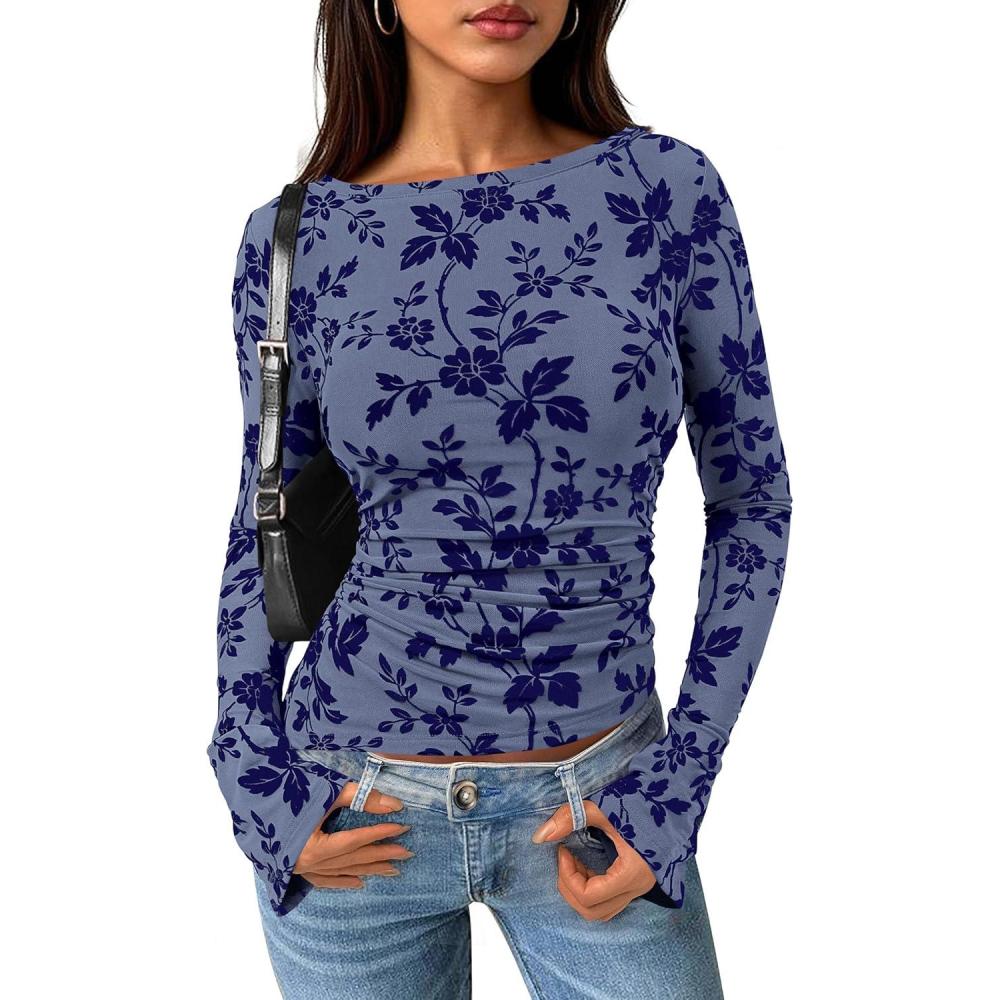 PRETTYGARDEN Women Long Sleeve Floral Mesh Tops Blouse 2026 Fall Trendy Boat Neck Ruched Spring Shirt Going Out Date Outfits(Dusty Blue)