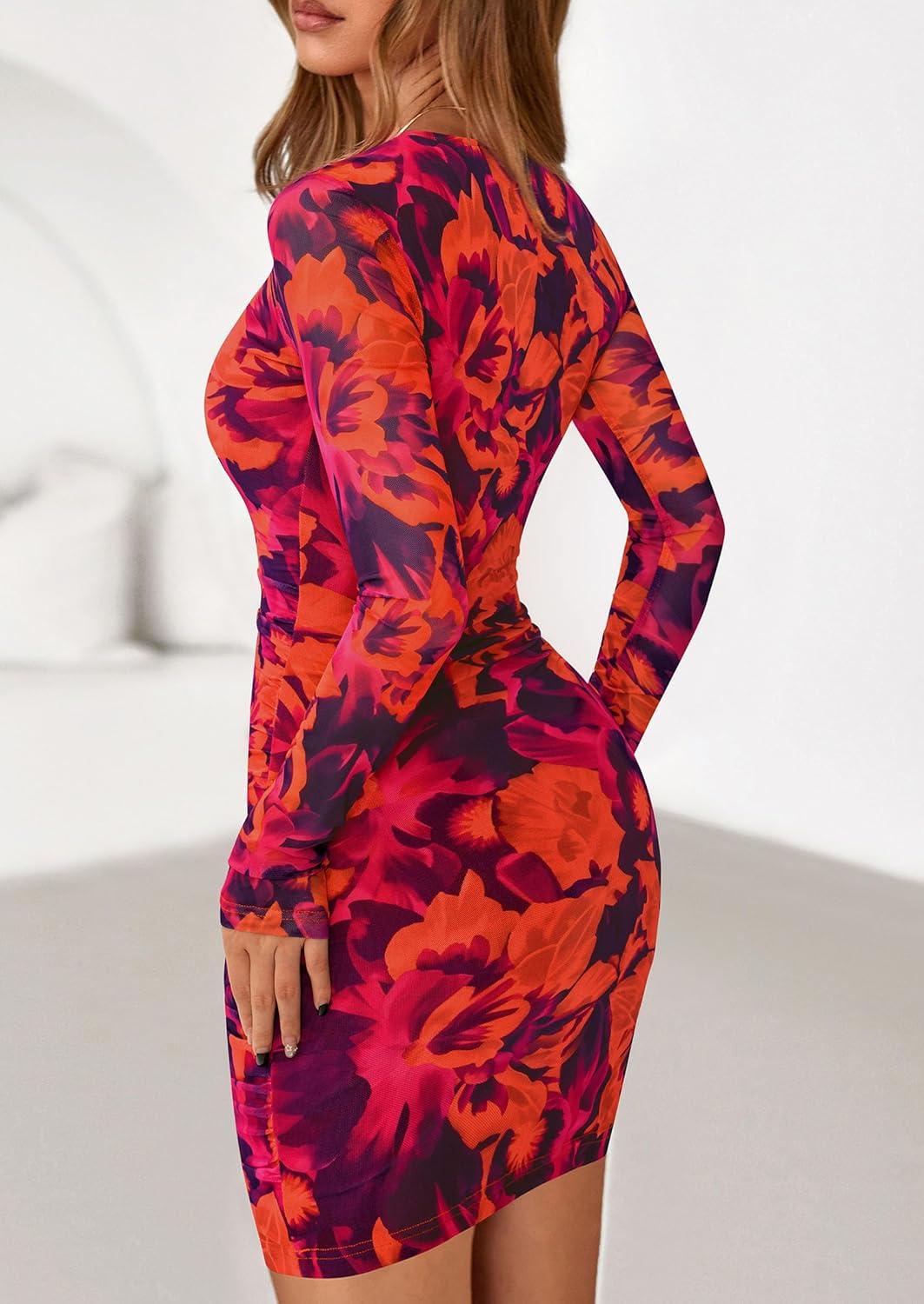 PRETTYGARDEN Women Long Sleeve Mini Fall Dress 2025 Tie Dye Print Bodycon Cocktail Party Club Outfits Homecoming Dresses(Red Floral)