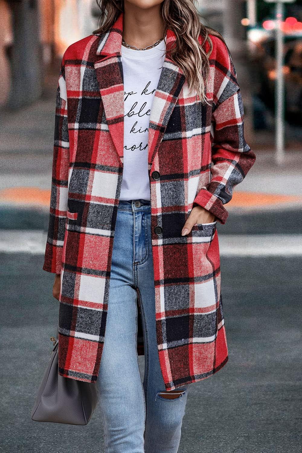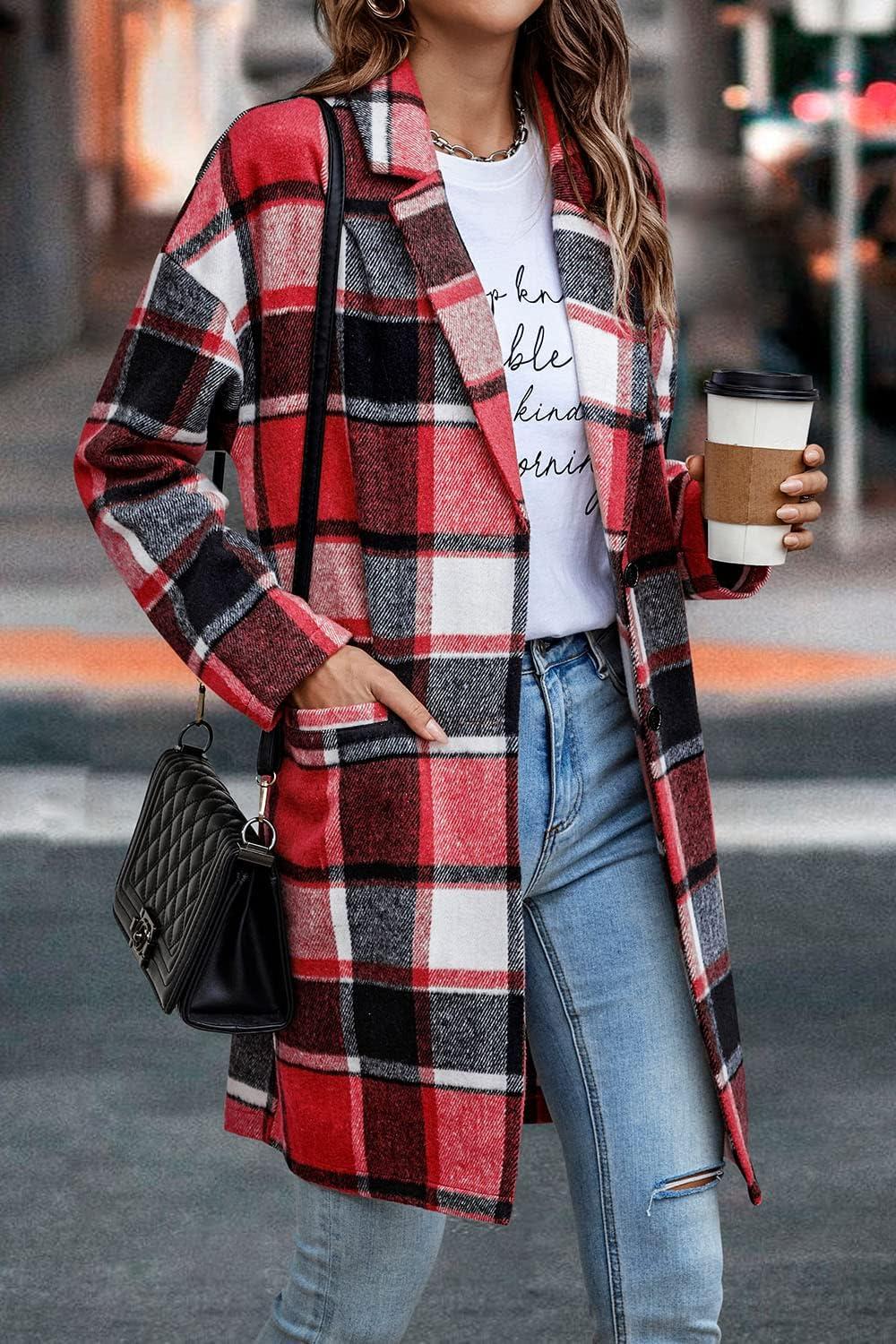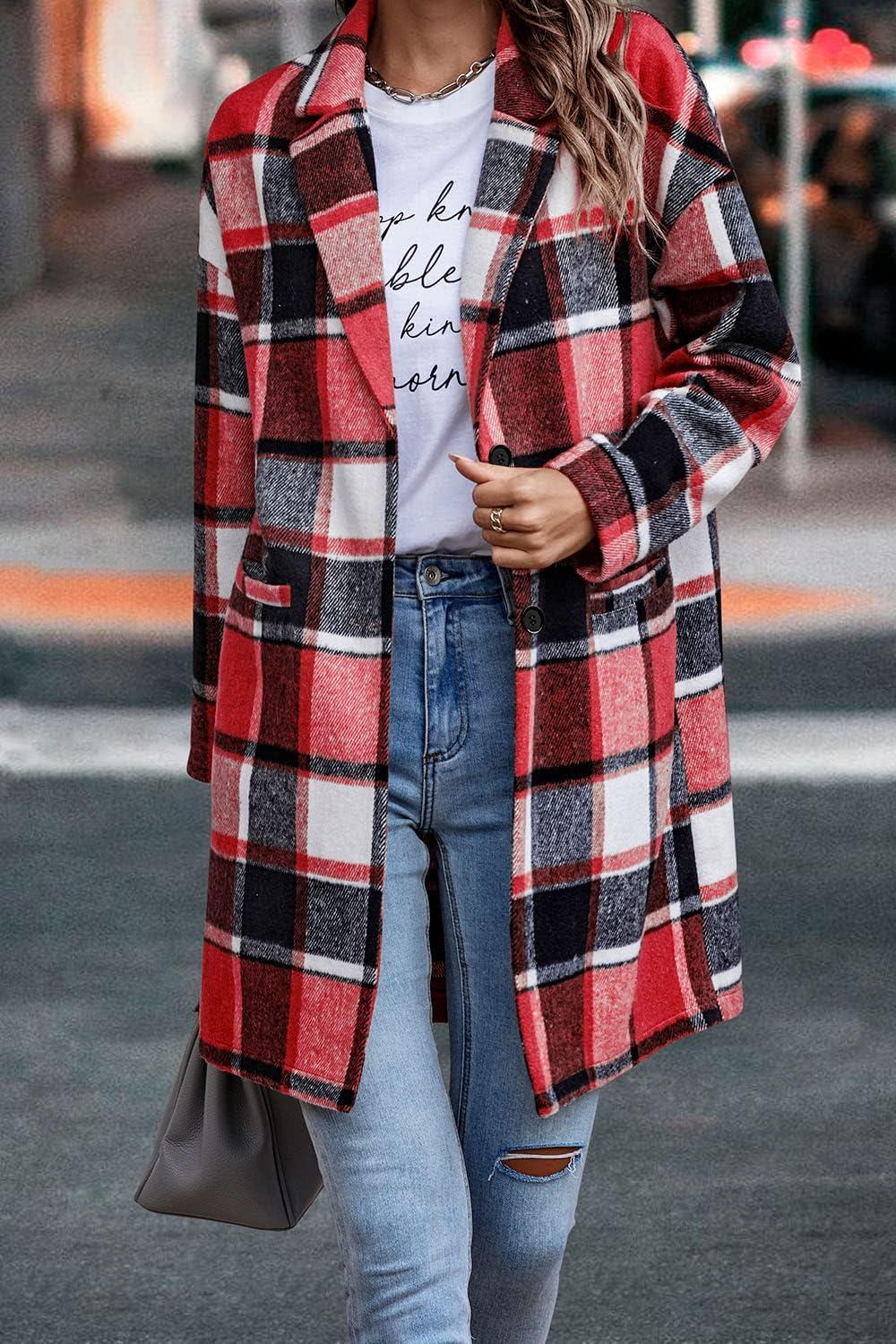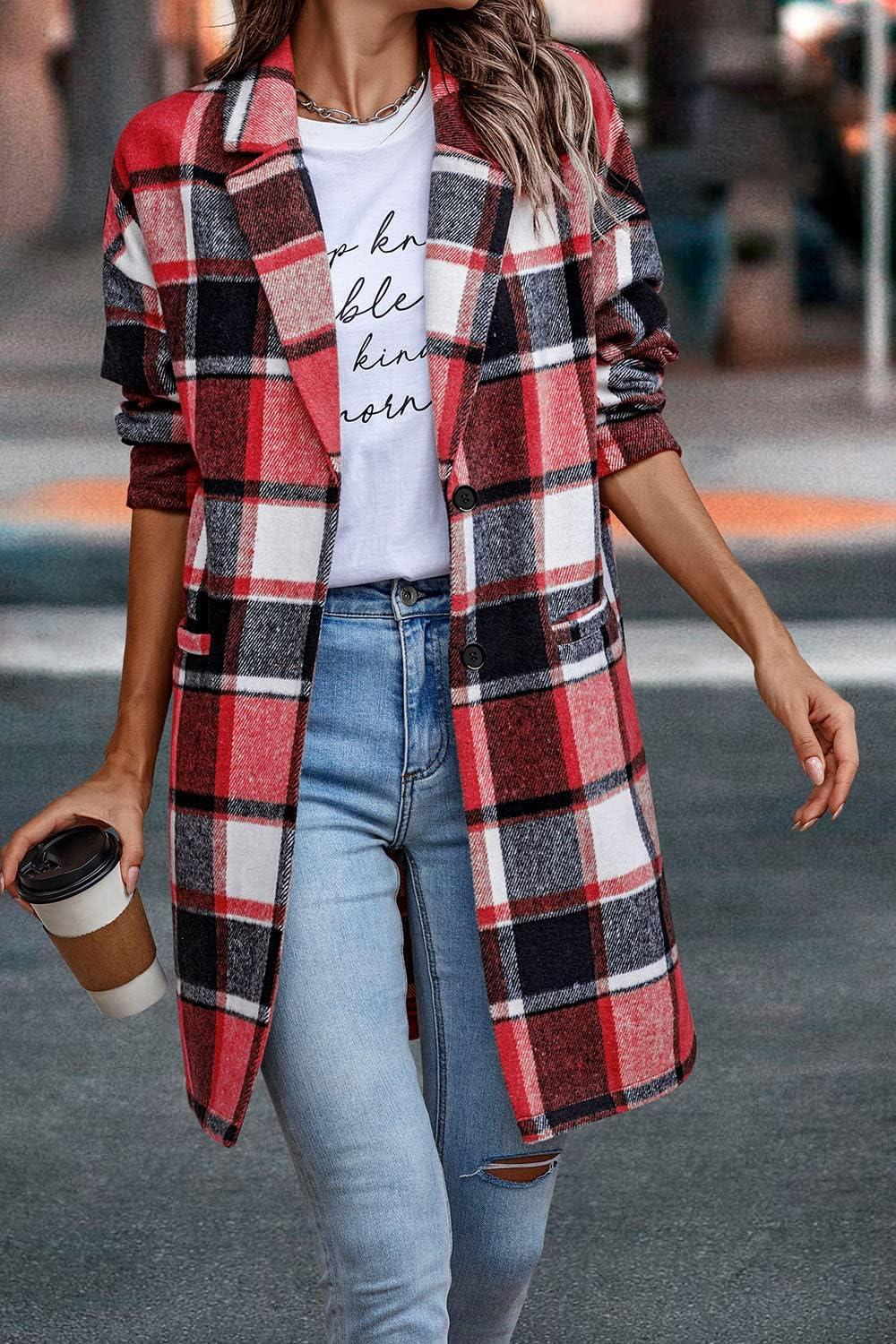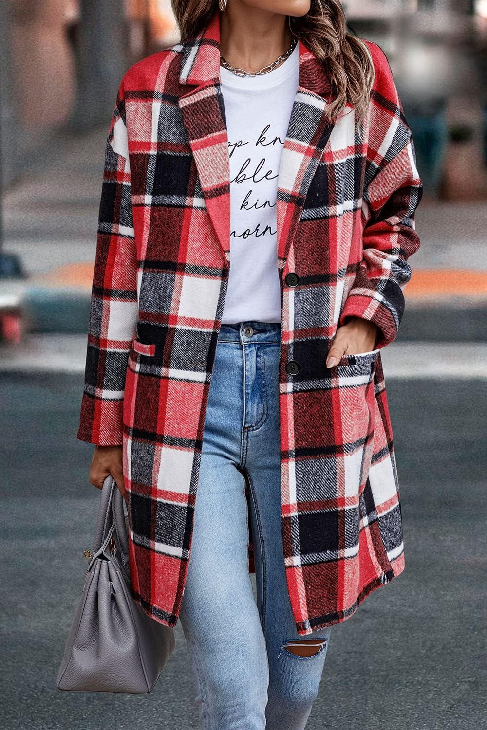 PRETTYGARDEN Women Plaid Shacket Jacket Trendy Fall Casual Button Wool Blend Tartan Trench Coat Winter Clothing with Pockets(Brilliant Red)
