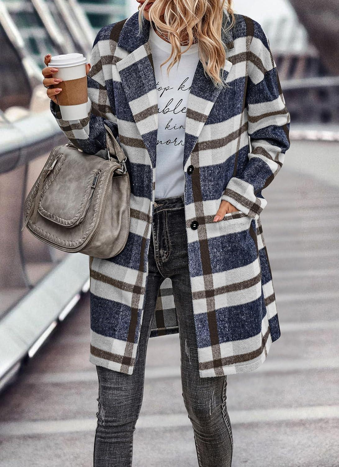PRETTYGARDEN Women Plaid Shacket Jacket Trendy Fall Casual Button Wool Blend Tartan Trench Coat Winter Clothing with Pockets(Navy White)