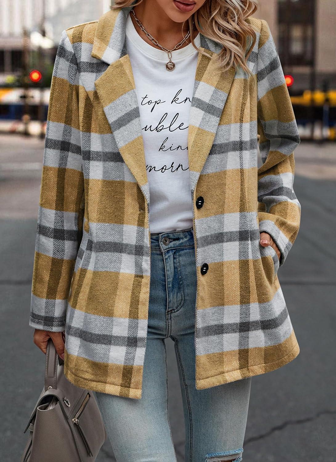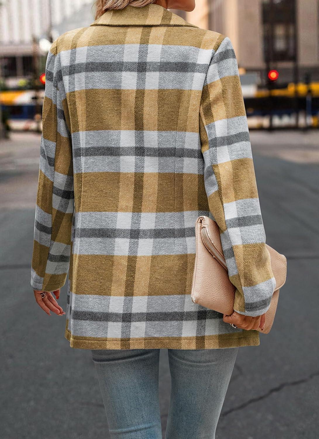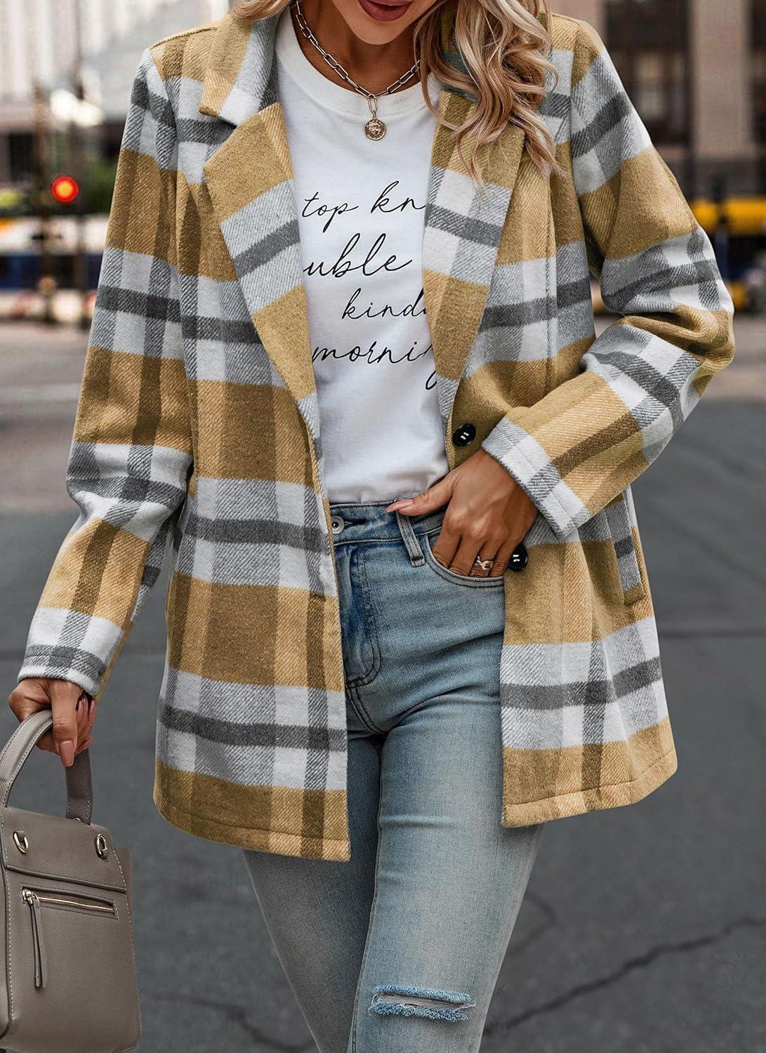 PRETTYGARDEN Women Plaid Shacket Jacket Trendy Fall Casual Button Wool Blend Tartan Trench Coat Winter Clothing with Pockets(Short Style Yellow Plaid)