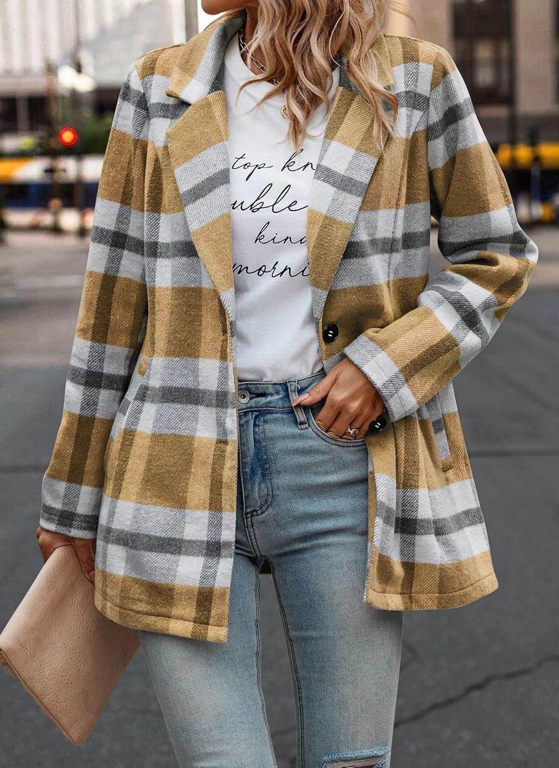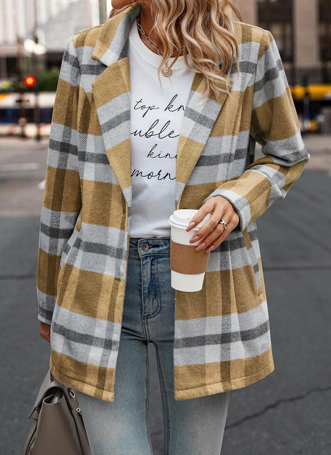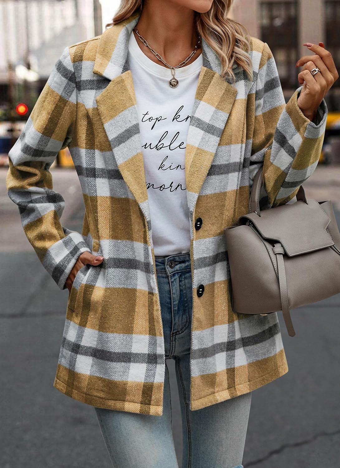 PRETTYGARDEN Women Plaid Shacket Jacket Trendy Fall Casual Button Wool Blend Tartan Trench Coat Winter Clothing with Pockets(Short Style Yellow Plaid)