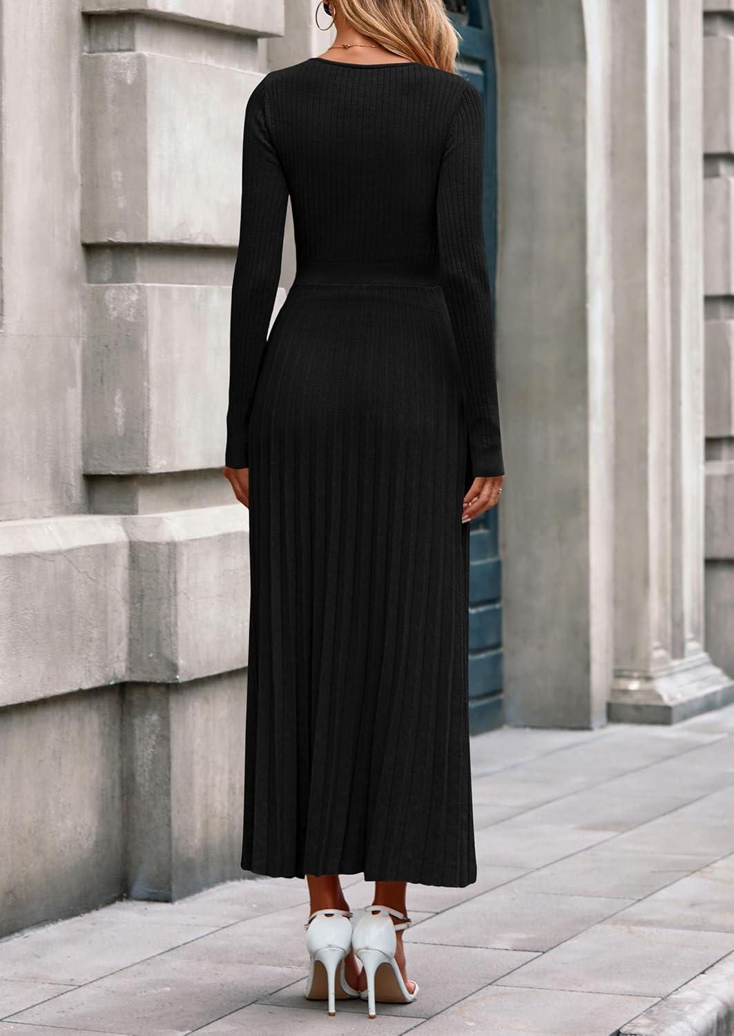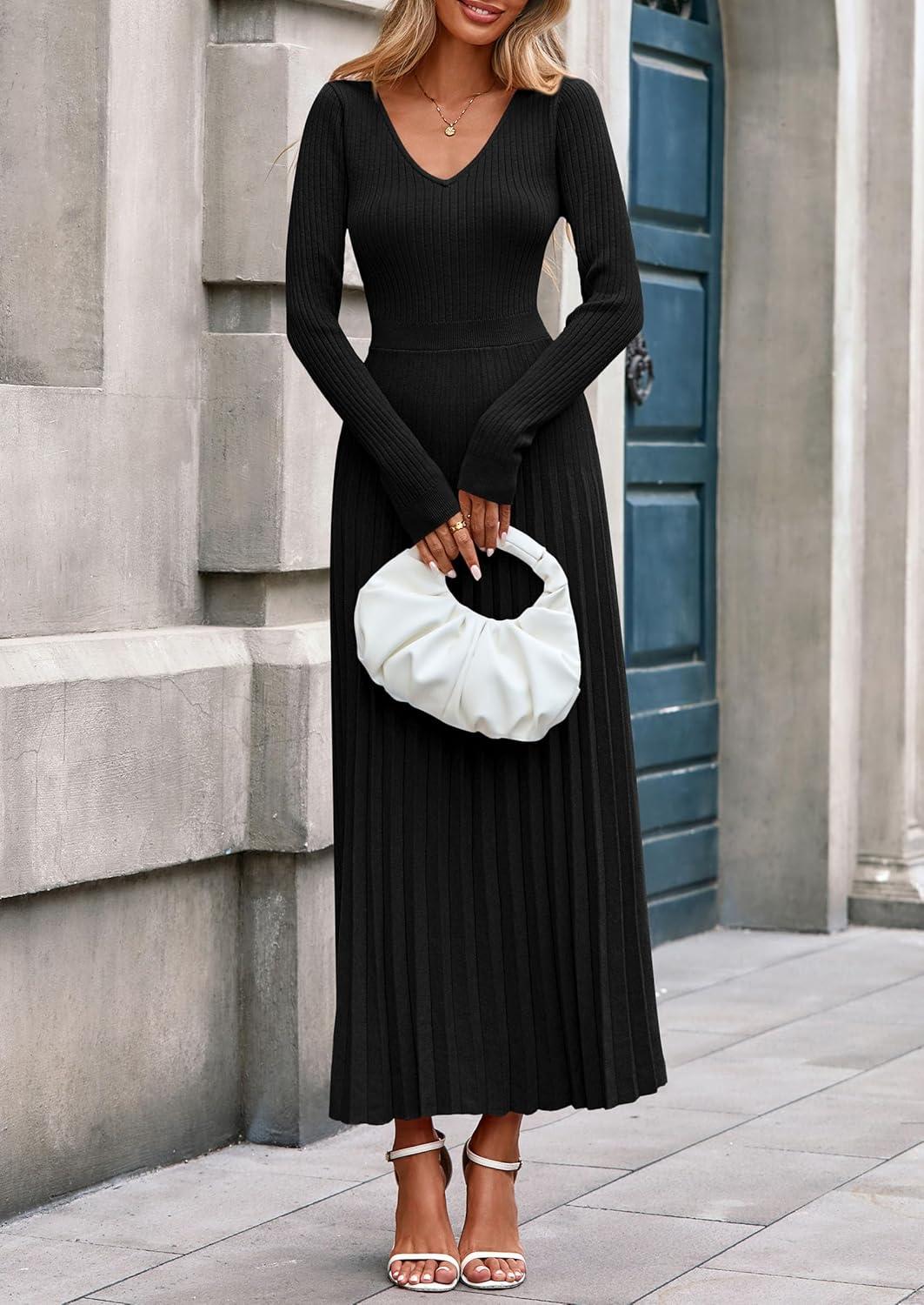 PRETTYGARDEN Women Sweater Dress Fall Fashion 2025 Long Sleeve V Neck Ribbed Knit Pleated A Line Elegant Maxi Winter Dresses(Black)