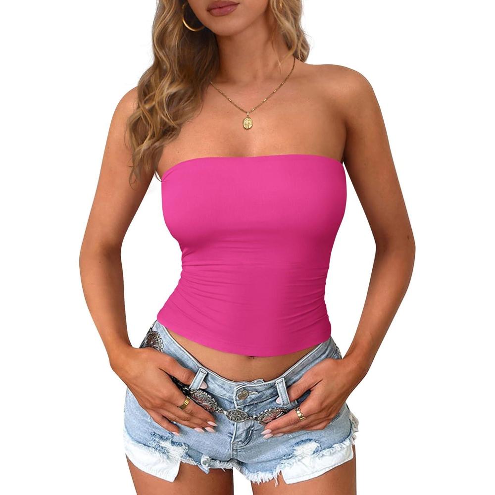 PRETTYGARDEN Women Tube Tops Strapless Going Out Crop Top 2026 Spring Fashion Y2K Summer Bandeau Shirt Beach Vacation Clothes(Rose Red)