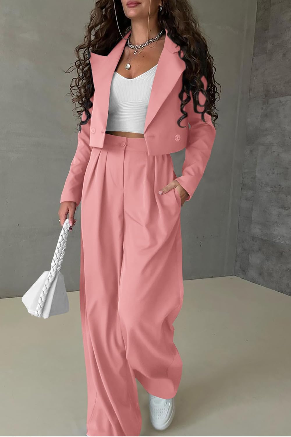 PRETTYGARDEN Womens 2 Piece Casual Outfits Cropped Blazer Jackets High Waisted Wide Leg Work Pants Suit SetLight Pink