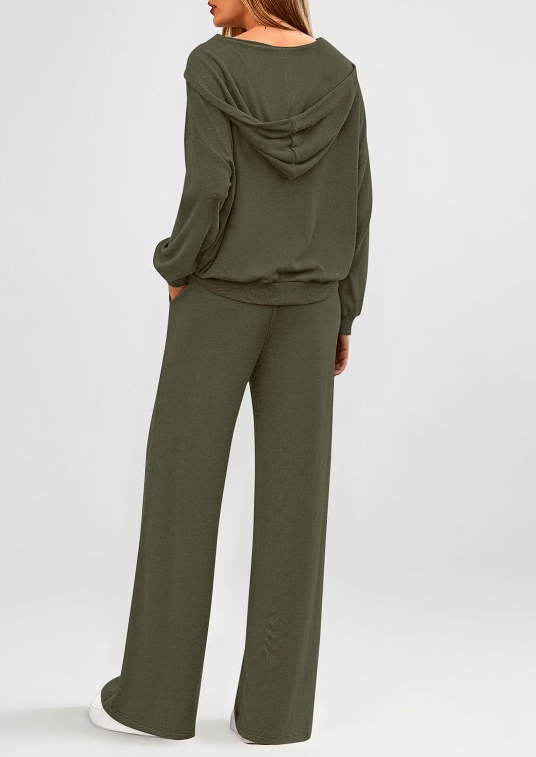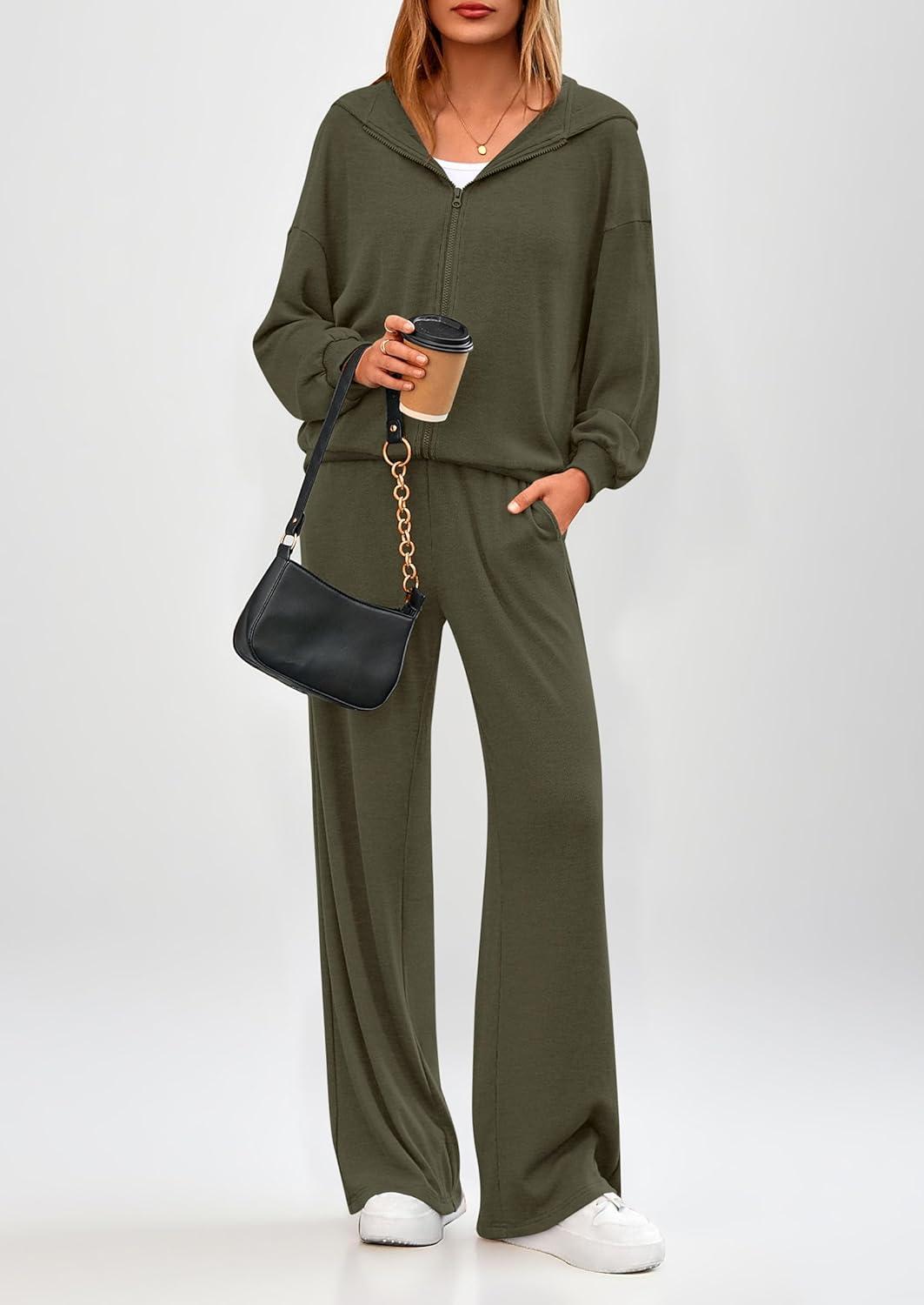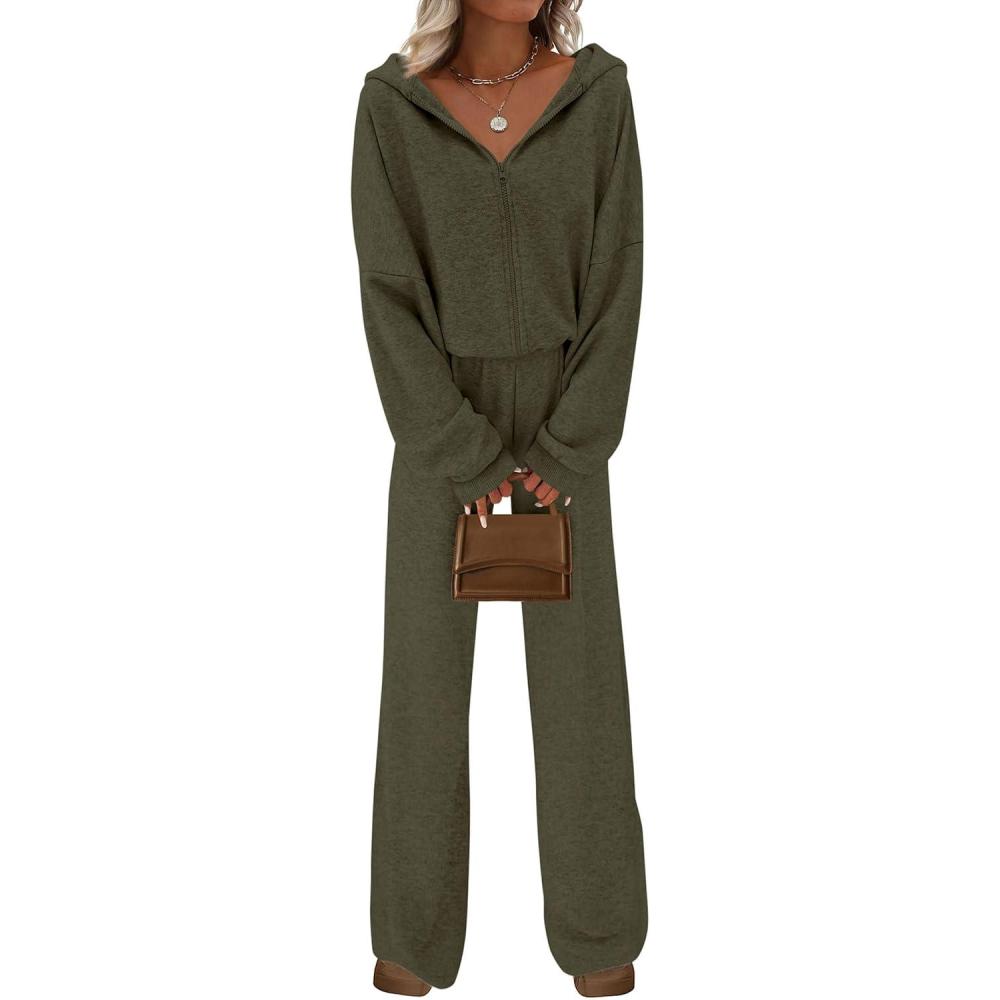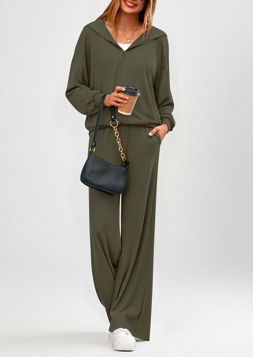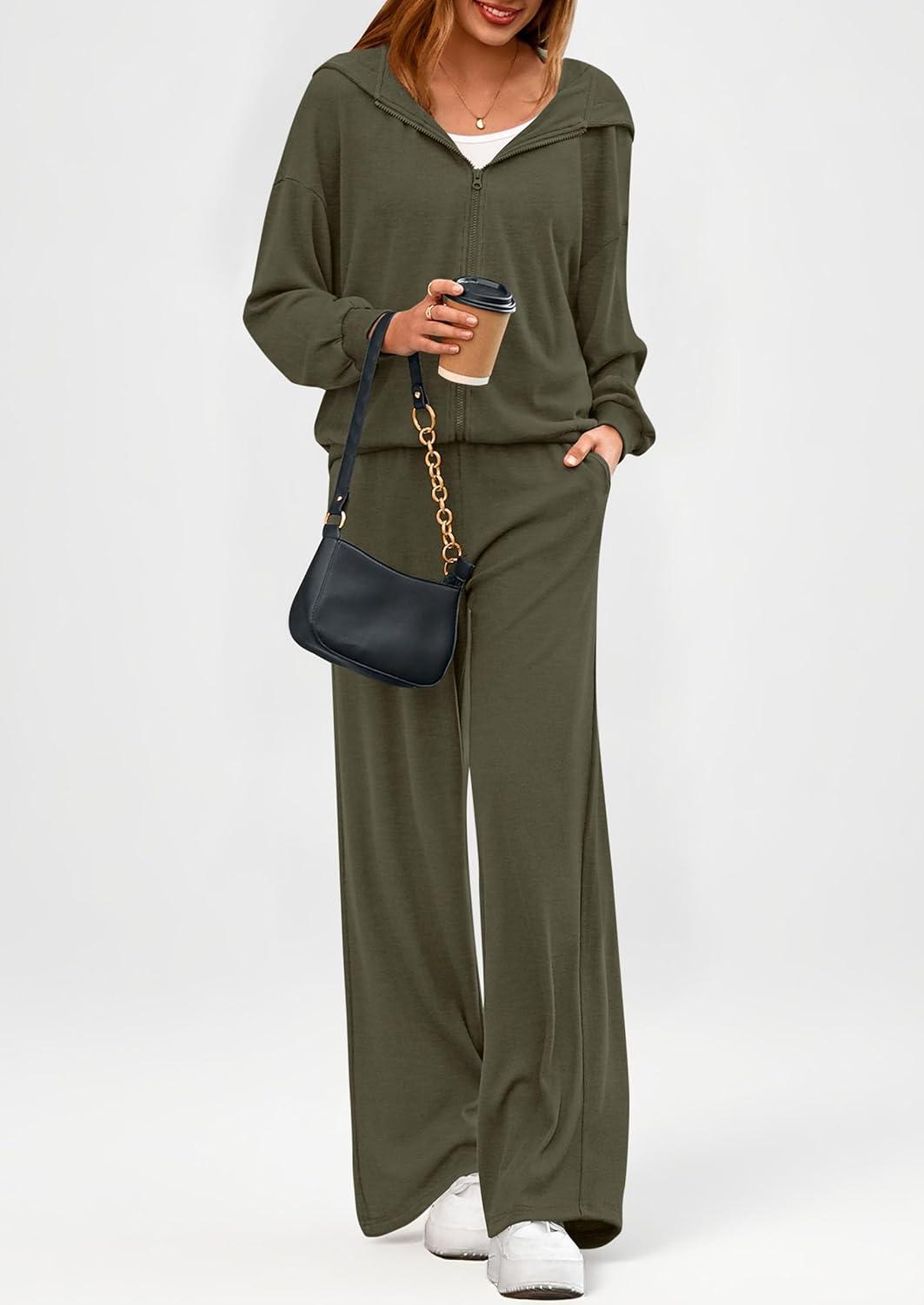 PRETTYGARDEN Women's 2 Piece Fall Lounge Sets 2025 Zip Up Hoodie Wide Leg Pants Tracksuit Matching Travel Outfits Clothes(Army Green)