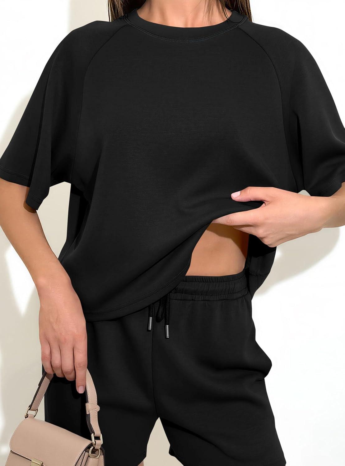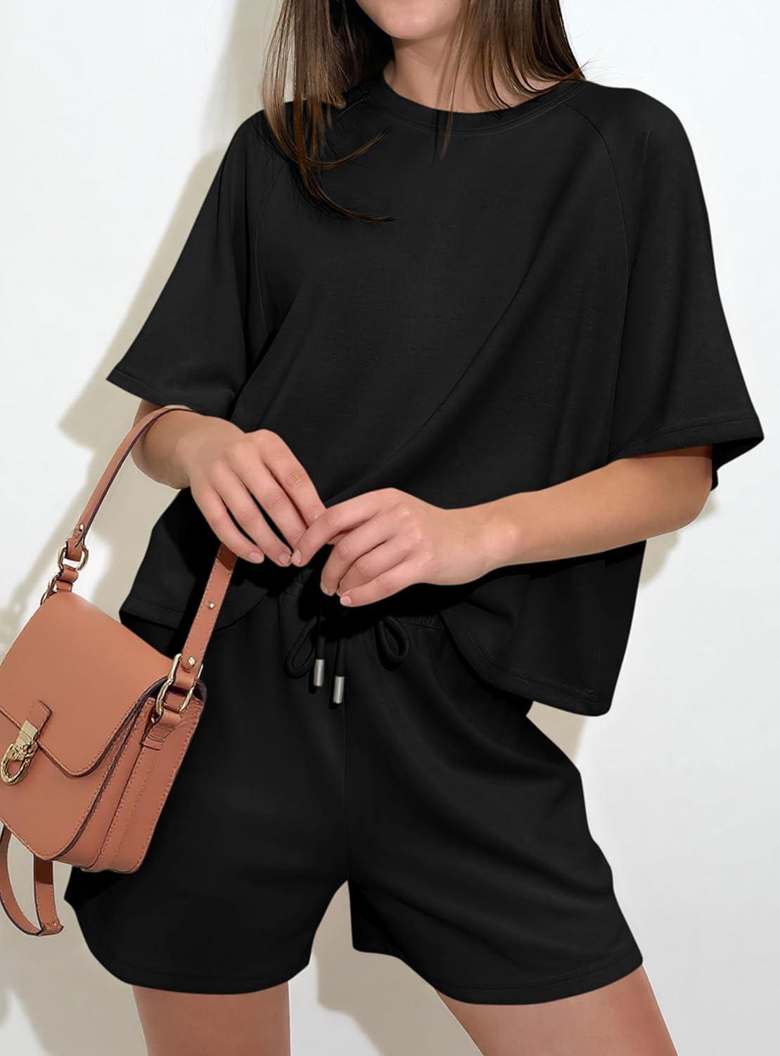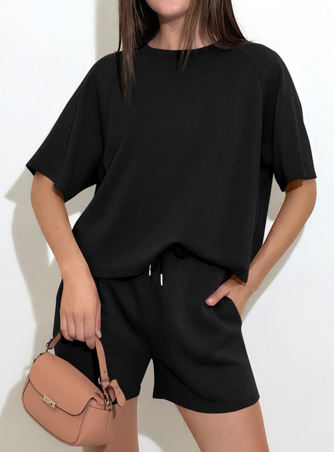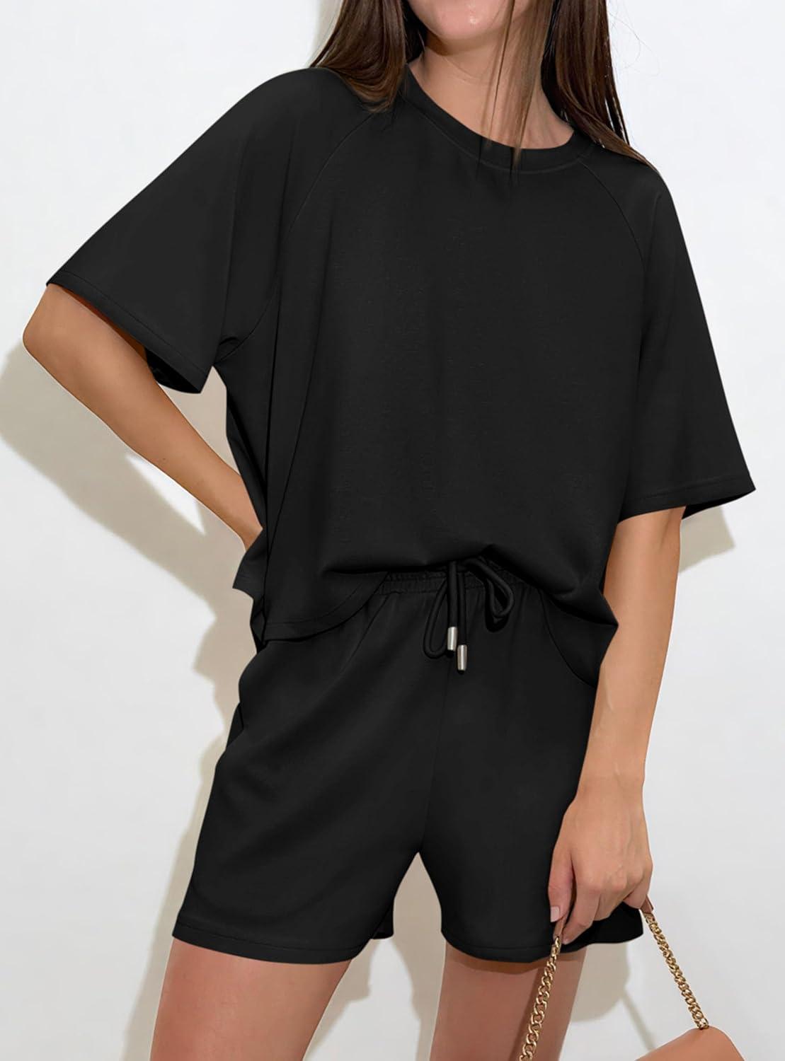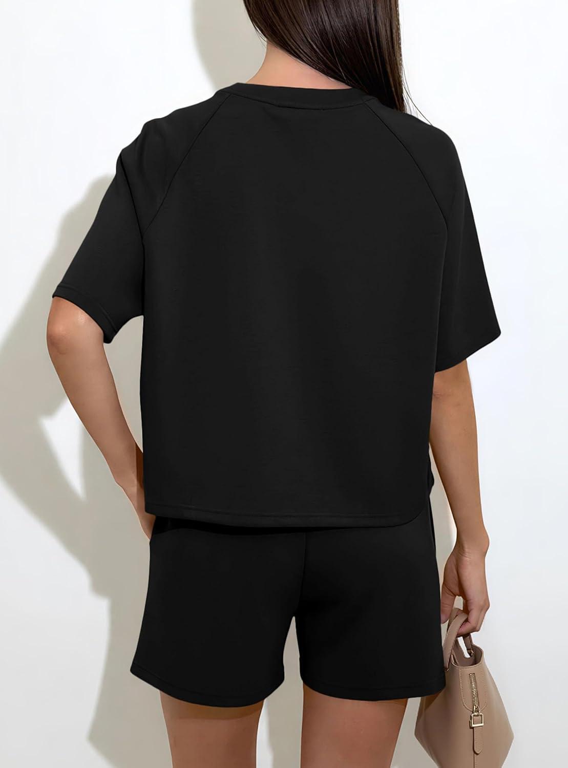 PRETTYGARDEN Women's 2 Piece Lounge Sets Short Sleeve Shirts Casual Tops Shorts Matching Clothing 2026 Summer Airport Outfits(Black)