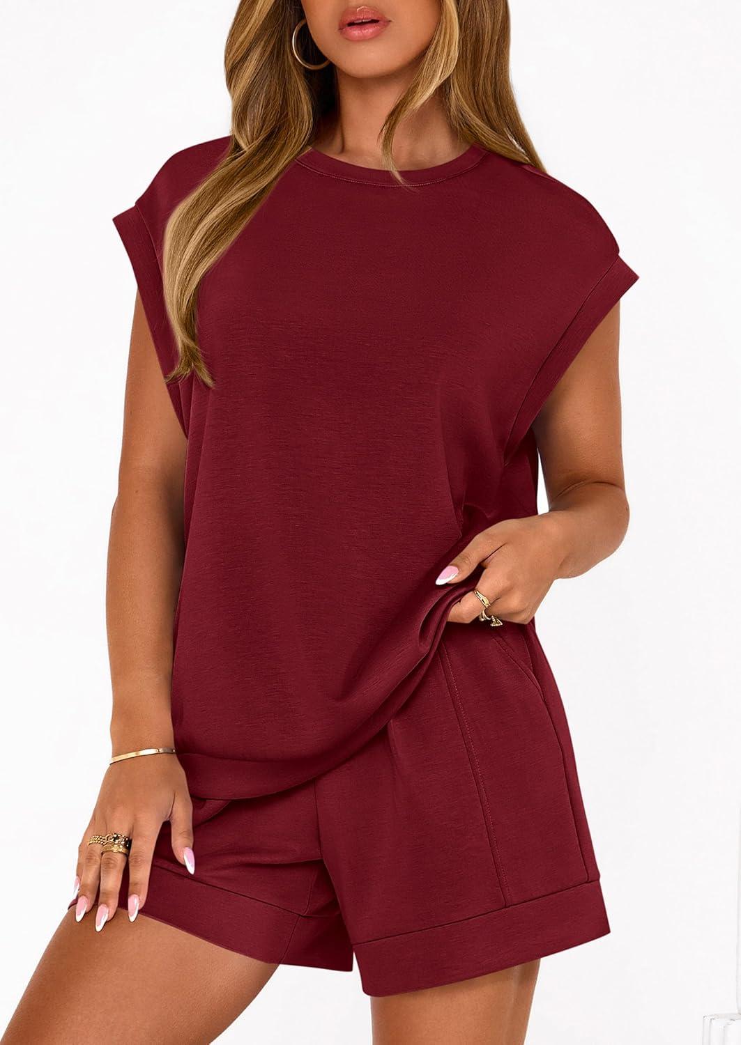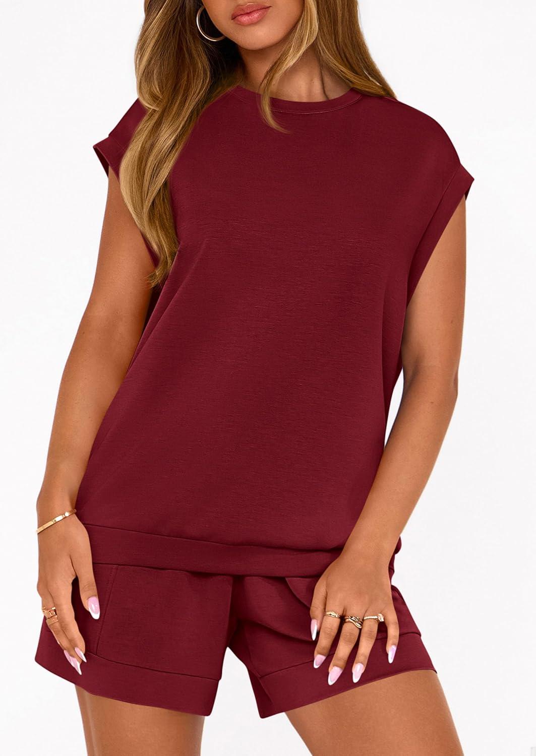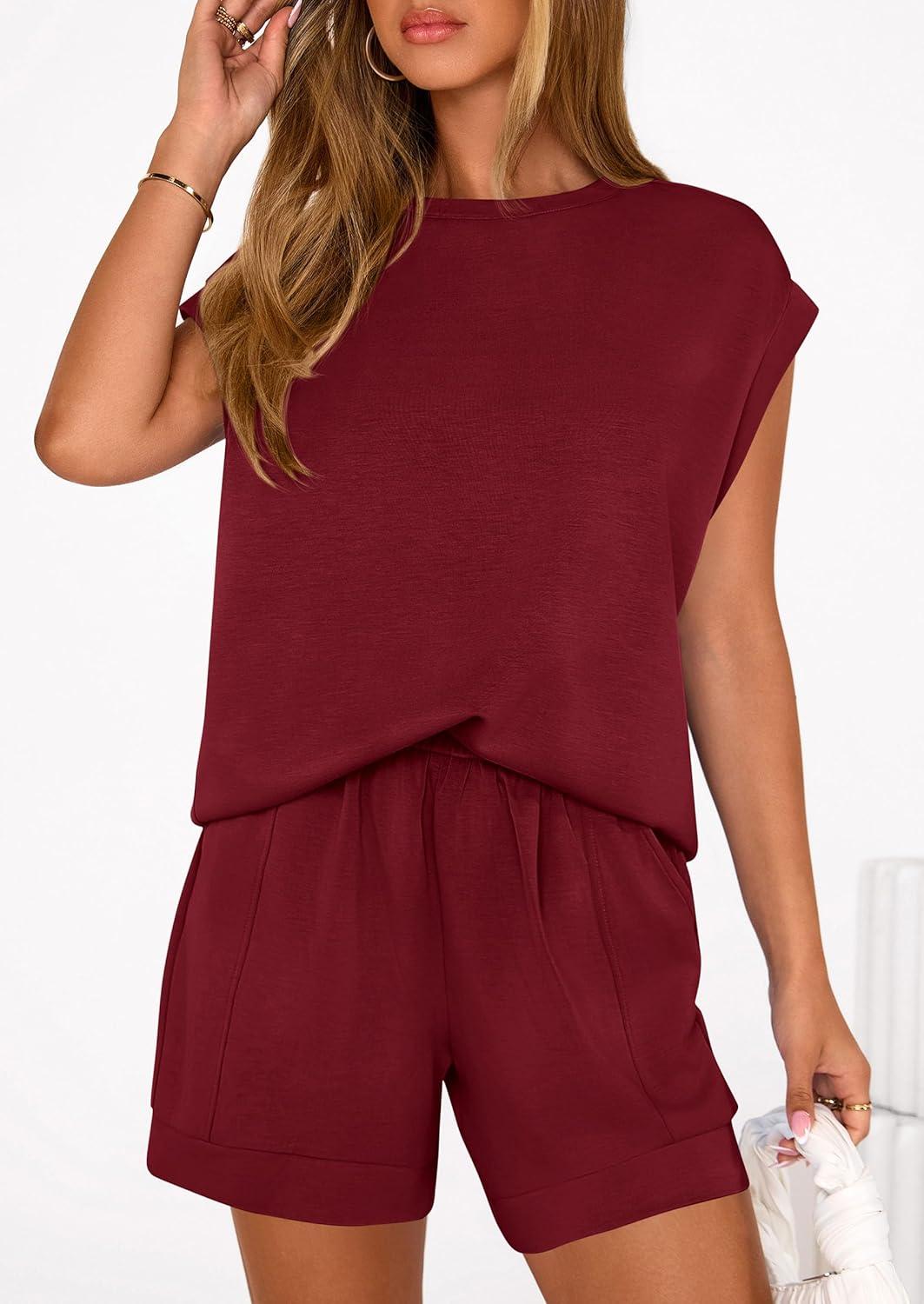 PRETTYGARDEN Women's 2 Piece Lounge Shorts Sets 2026 Summer Travel Outfits Casual Beach Vacation Clothes Spring Sweatsuits(Burgundy)