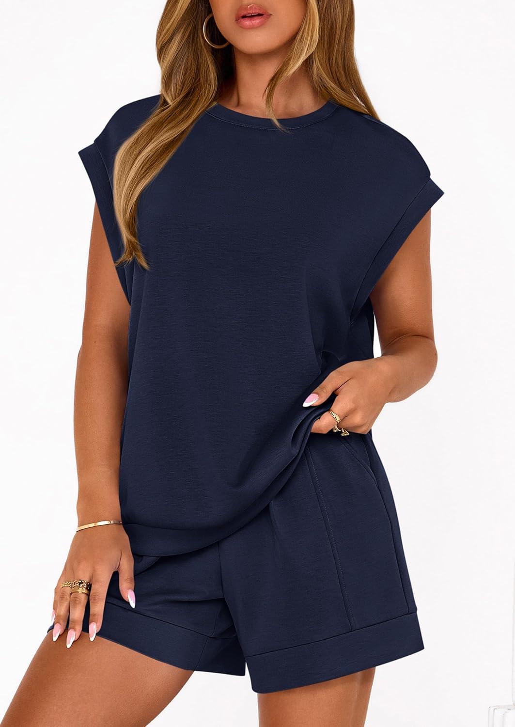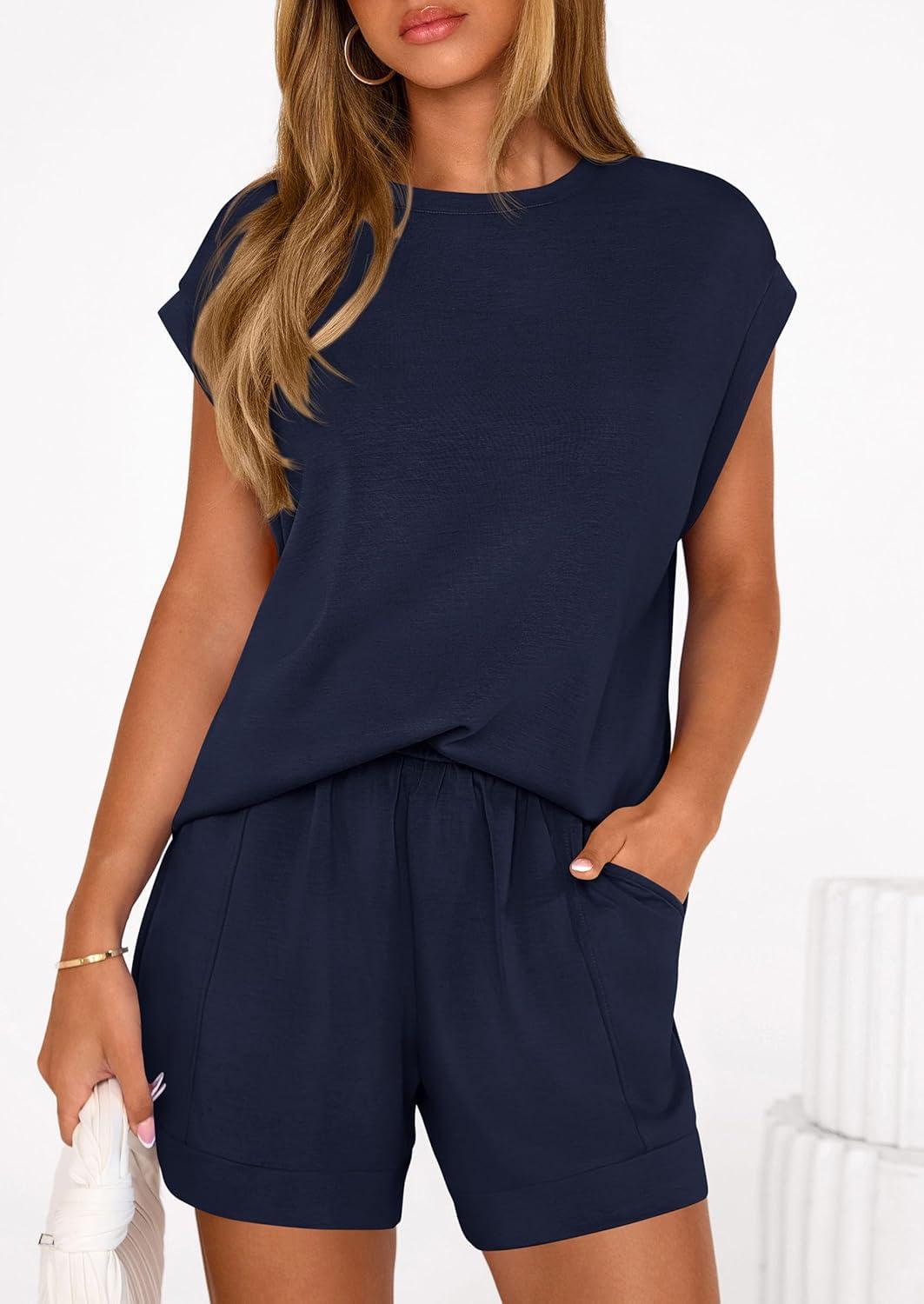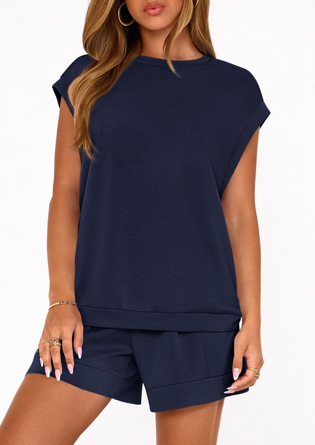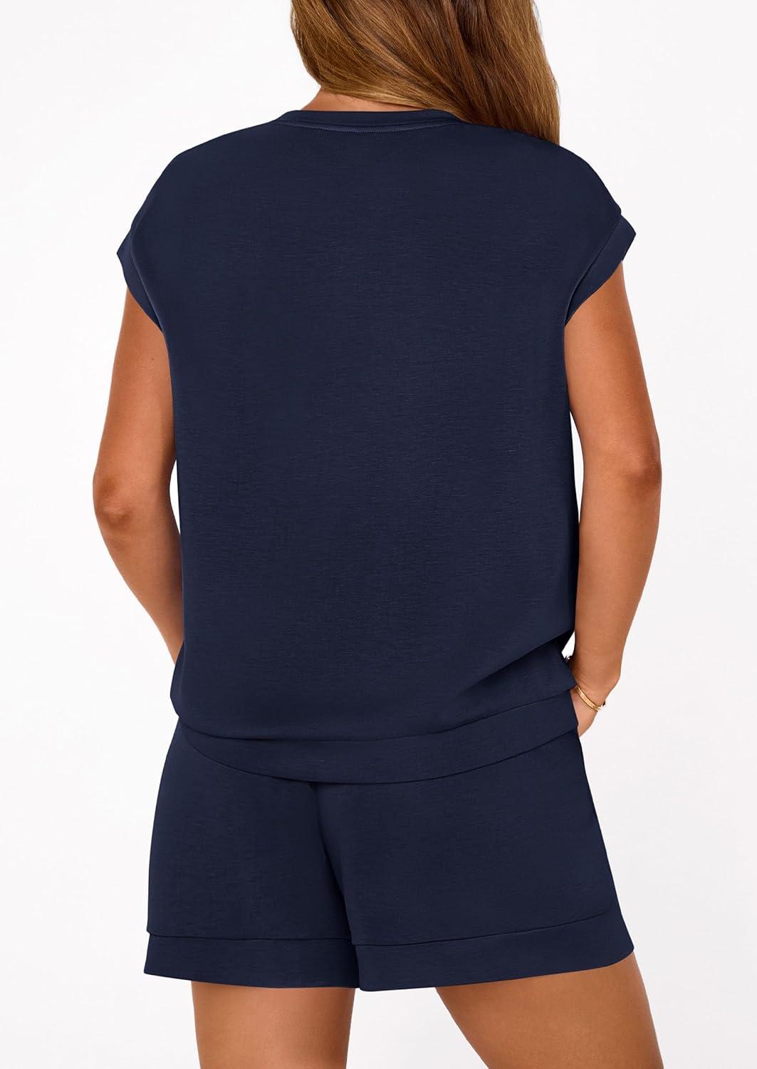 PRETTYGARDEN Women’s 2 Piece Lounge Shorts Sets 2026 Summer Travel Outfits Casual Beach Vacation Clothes Spring Sweatsuits(Navy Blue)