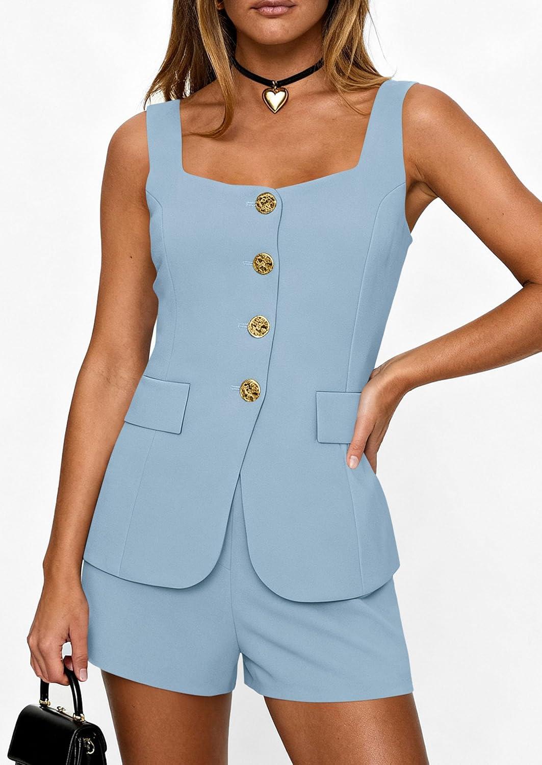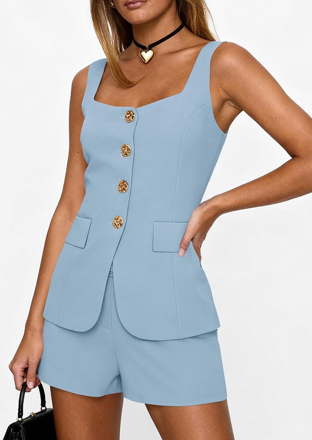 PRETTYGARDEN Womens 2 Piece Matching Sets 2026 Fashion Button Down Suit Vest Tops Shorts Set Spring Business Casual Outfits(Light Blue)