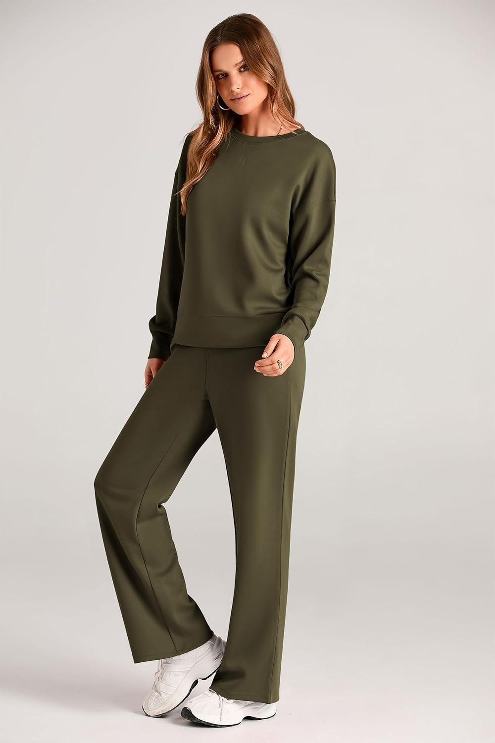 PRETTYGARDEN Womens 2 Piece Outfits 2025 Fall Long Sleeve Sweatshirt Wide Leg Pants Lounge Sets Winter Sweatsuits Tracksuit(Army Green)
