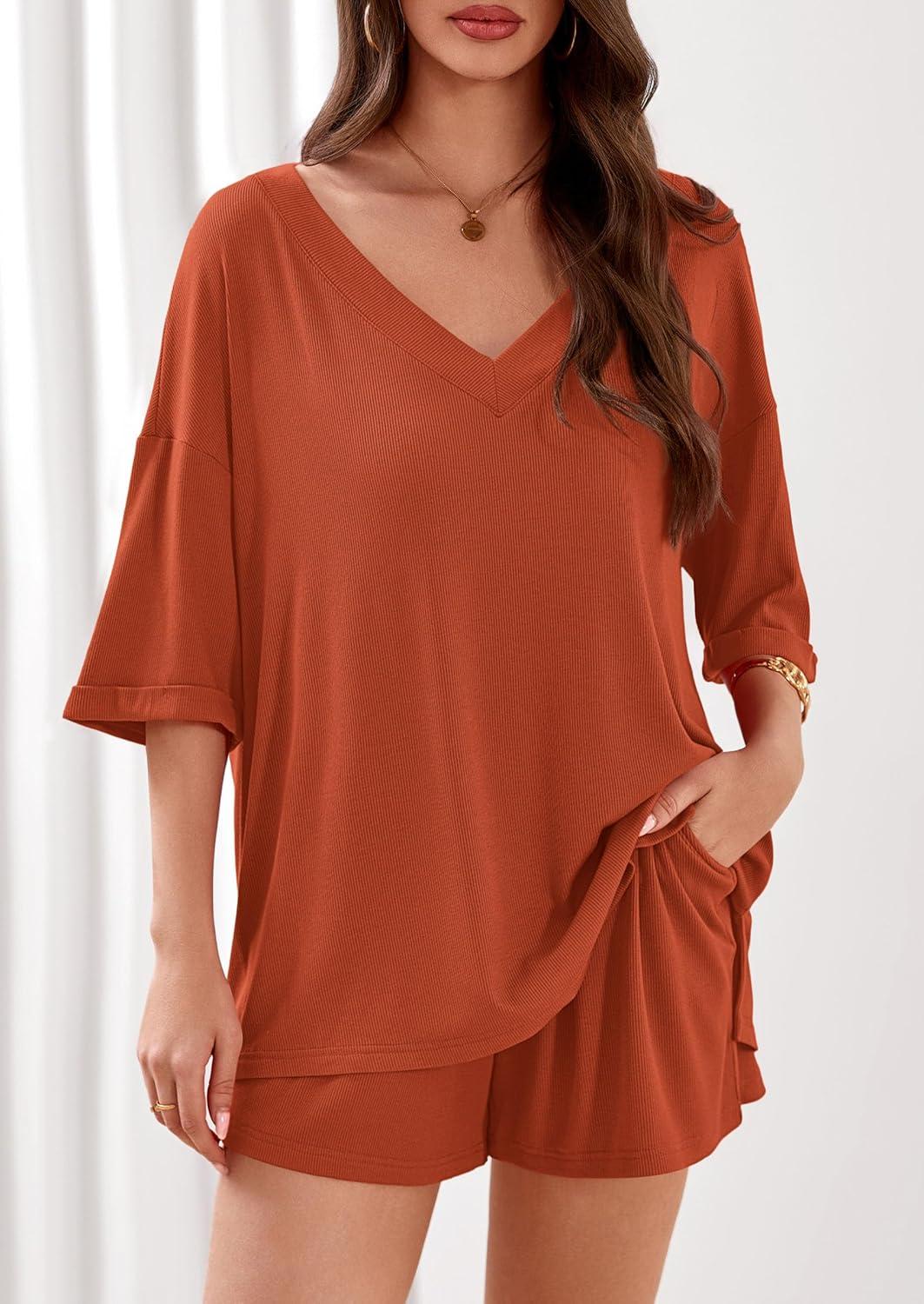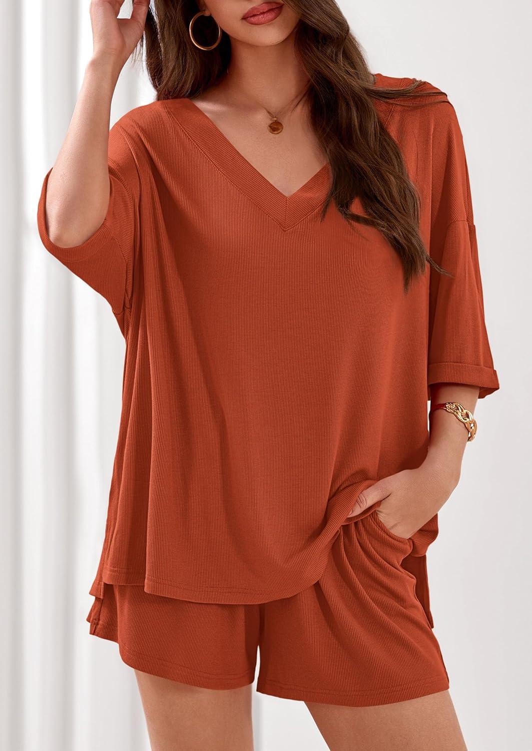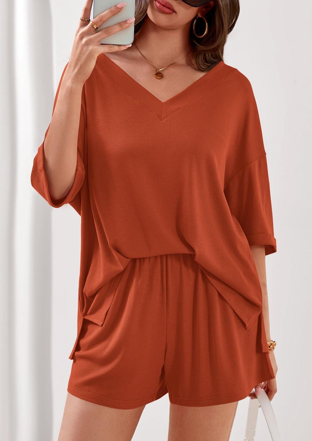 PRETTYGARDEN Womens 2 Piece Sets 2026 Oversized Vneck Half Sleeve Tops Shorts Lounge Set Casual Summer Travel Beach Outfits(Burnt Orange)