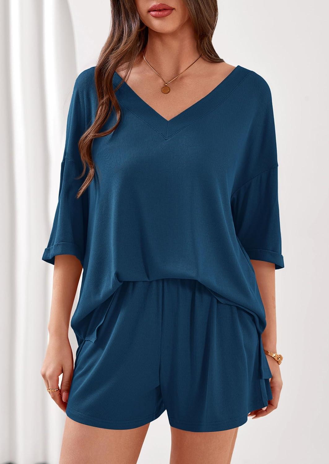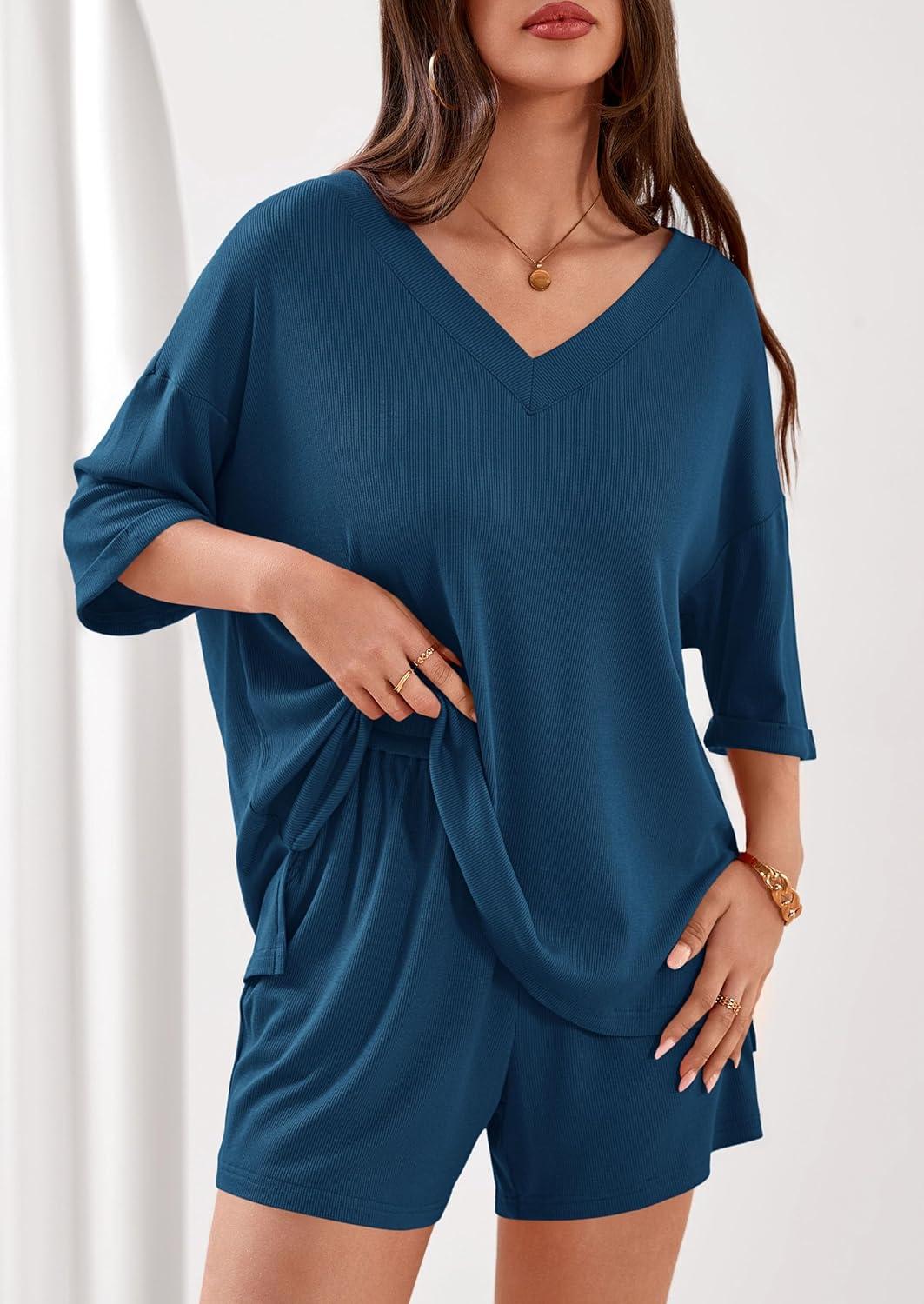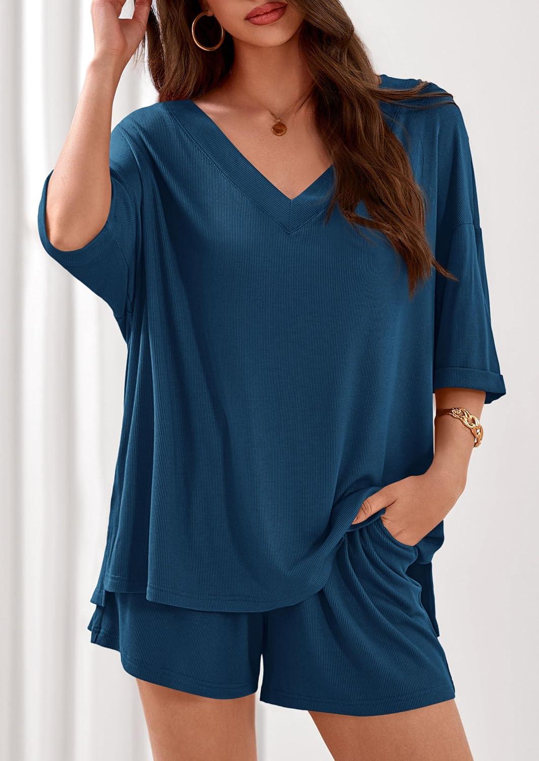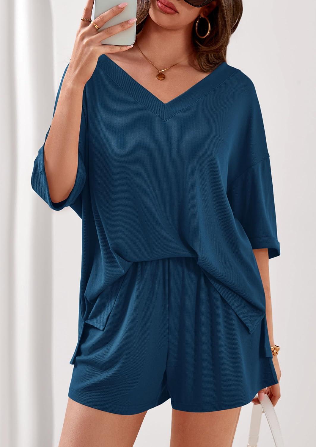 PRETTYGARDEN Womens 2 Piece Sets 2026 Oversized Vneck Half Sleeve Tops Shorts Lounge Set Casual Summer Travel Beach Outfits(Dark Blue)