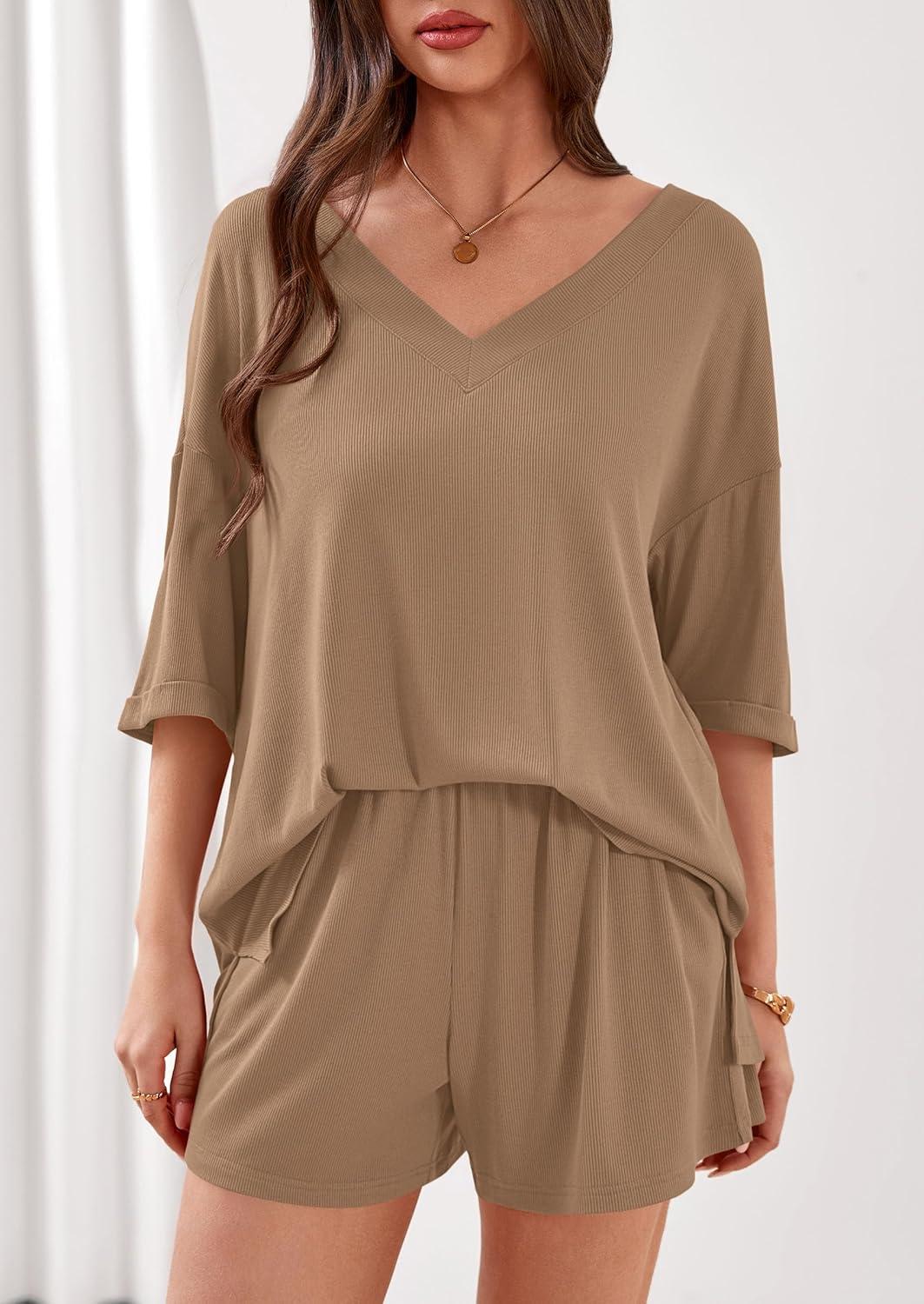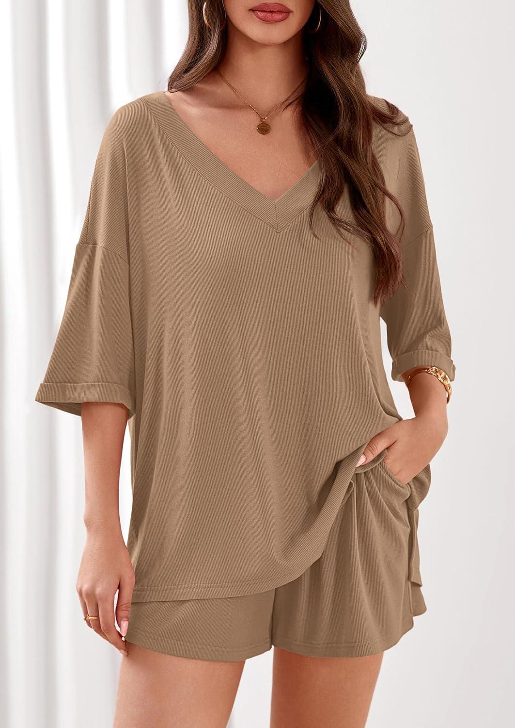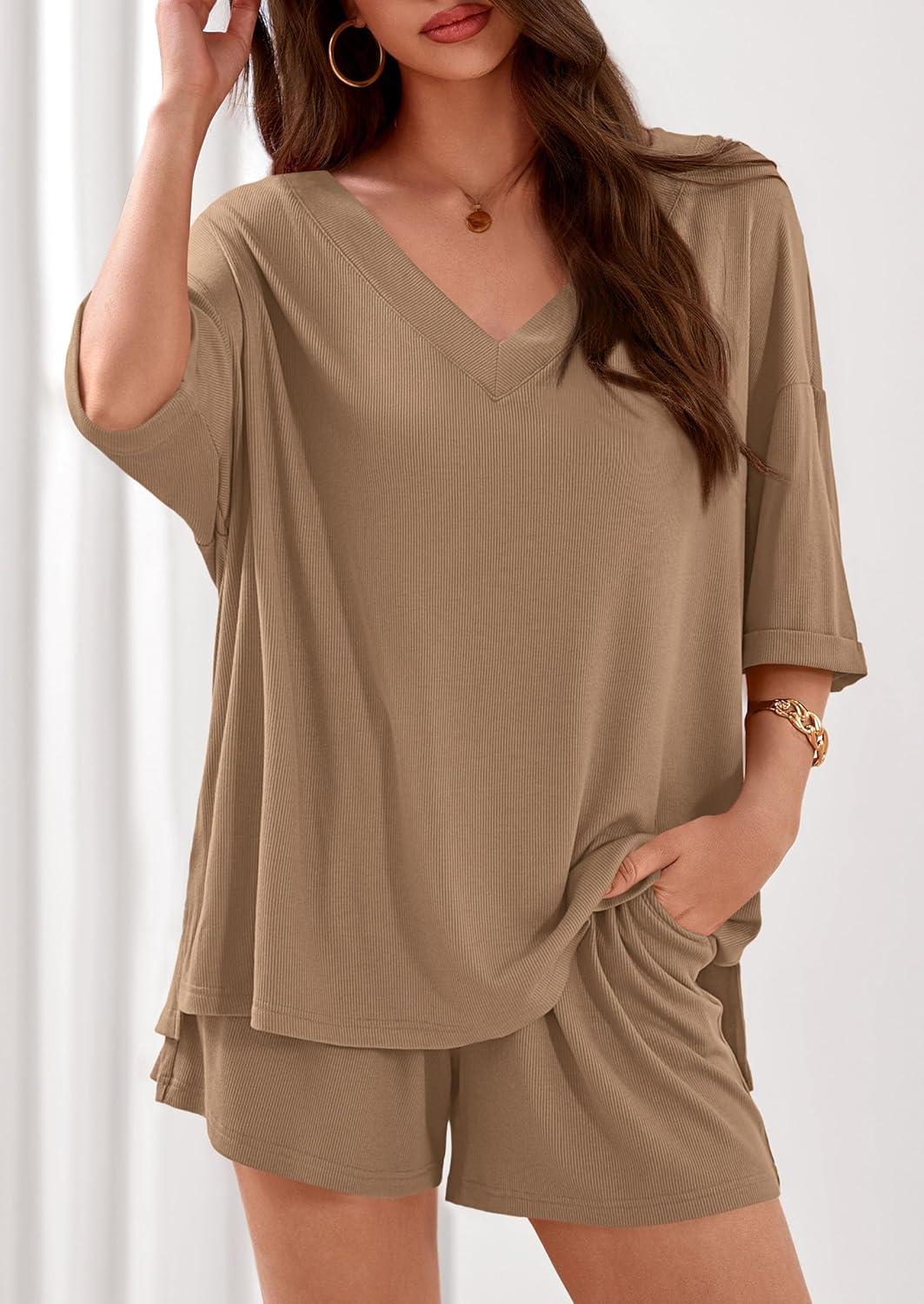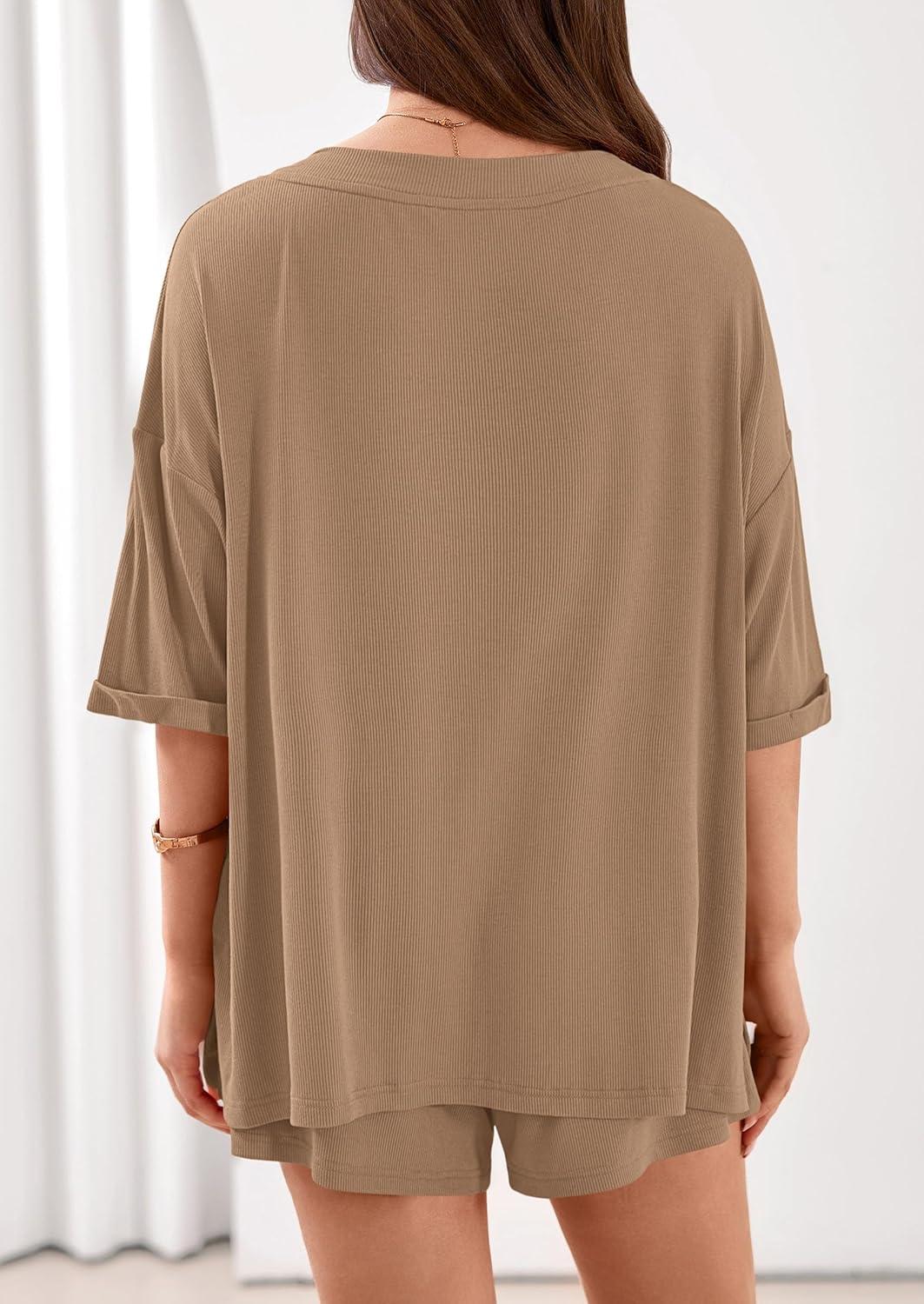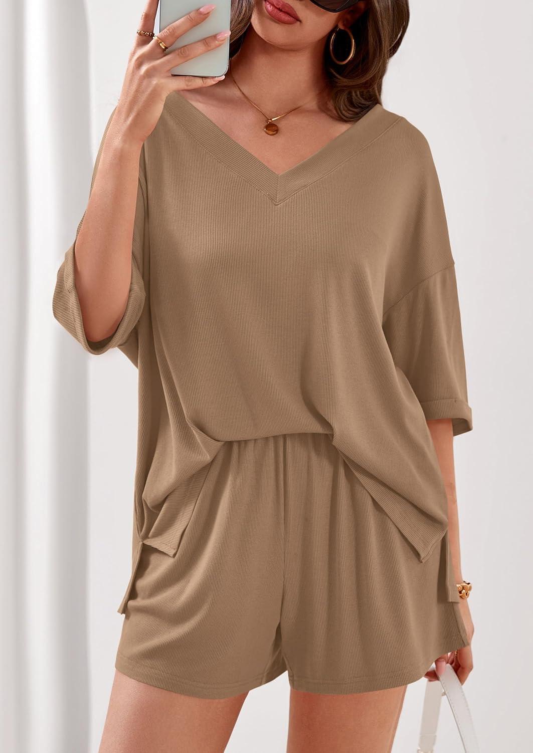 PRETTYGARDEN Womens 2 Piece Sets 2026 Oversized Vneck Half Sleeve Tops Shorts Lounge Set Casual Summer Travel Beach Outfits(Khaki)