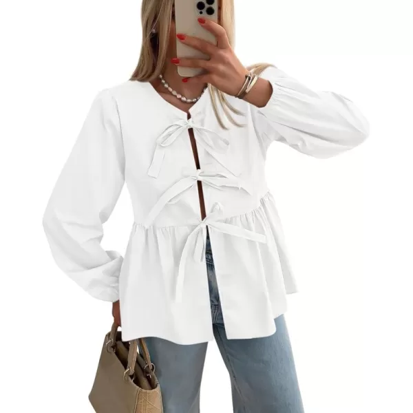 PRETTYGARDEN Womens Babydoll Peplum Blouse Shirt Puff Long Sleeve Bow Tie Front Trendy Cute Y2K Going Out TopsSolid White