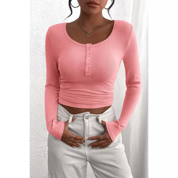 PRETTYGARDEN Womens 2024 Fall Long Sleeve Henley T Shirts Button Ribbed Knit Slim Fit Casual Basic Tops BlousePink