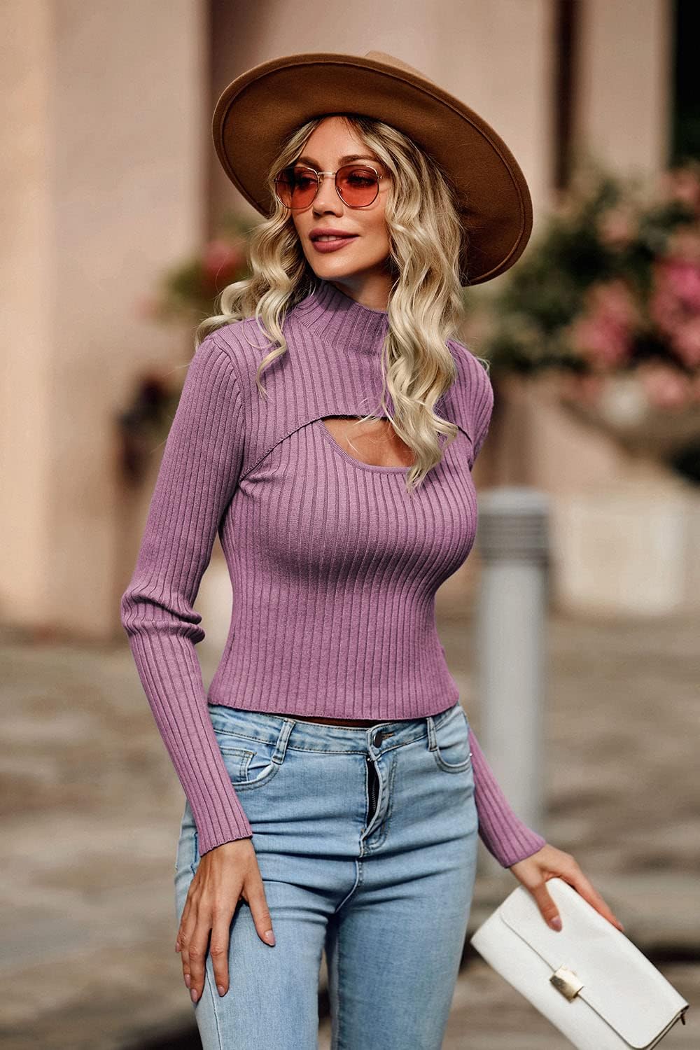PRETTYGARDEN Women's 2024 Fashion Fall Clothes 2 Piece Cutout Tops Long Sleeve Mock Neck Rib Knit Winter Pullover Sweater(Bean Paste Purple)