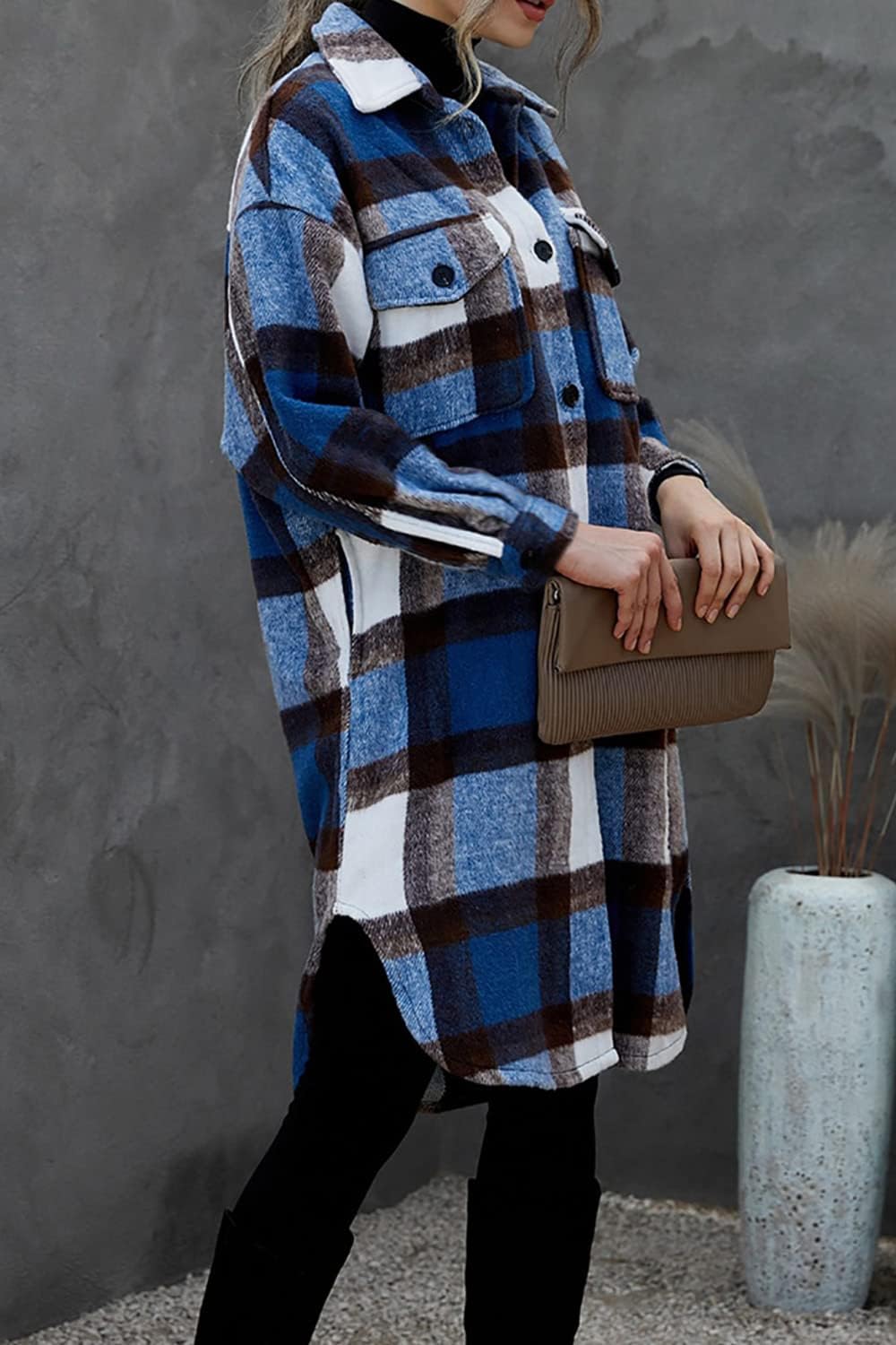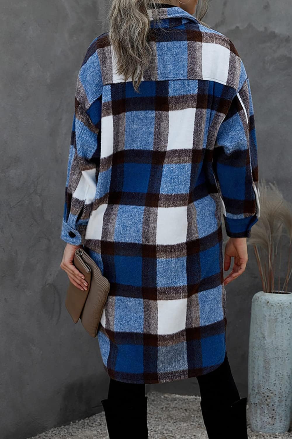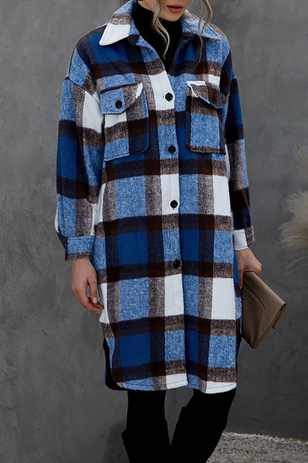 PRETTYGARDEN Women's 2024 Plaid Shacket Jacket Long Sleeve Button Down Shirts Fashion Winter Wool Coats(Dark Blue)