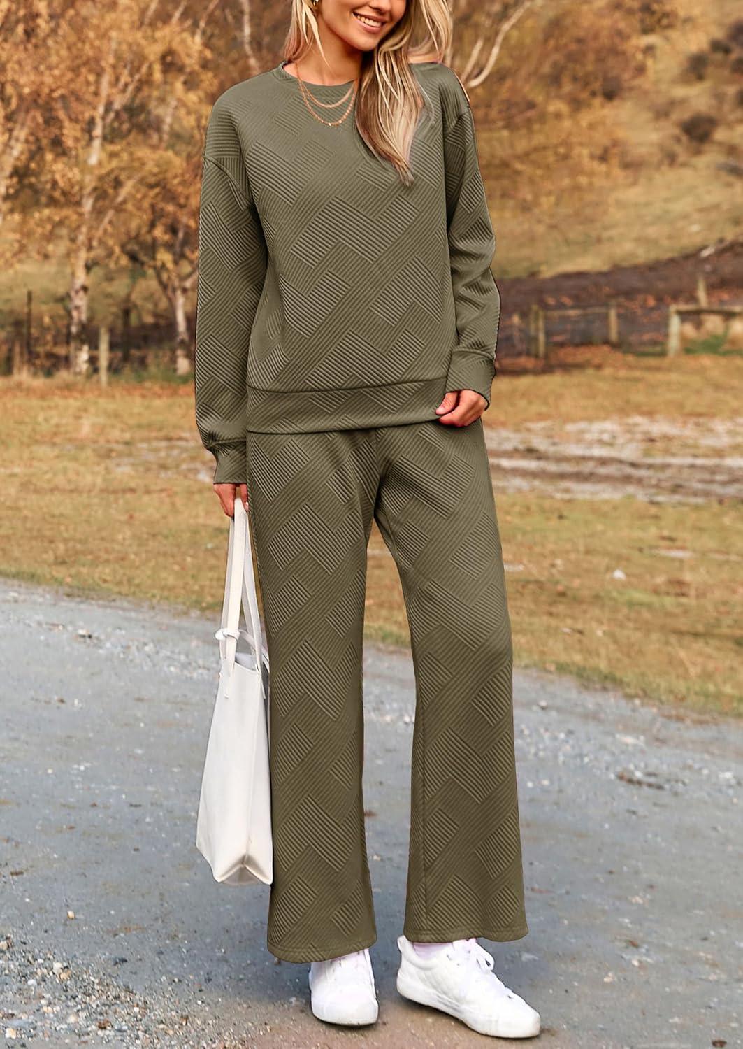 PRETTYGARDEN Womens 2025 Fall 2 Piece Outfits Long Sleeve Pullover Tops Wide Leg Pants Matching Lounge Sets Fashion Clothing(Army Green)