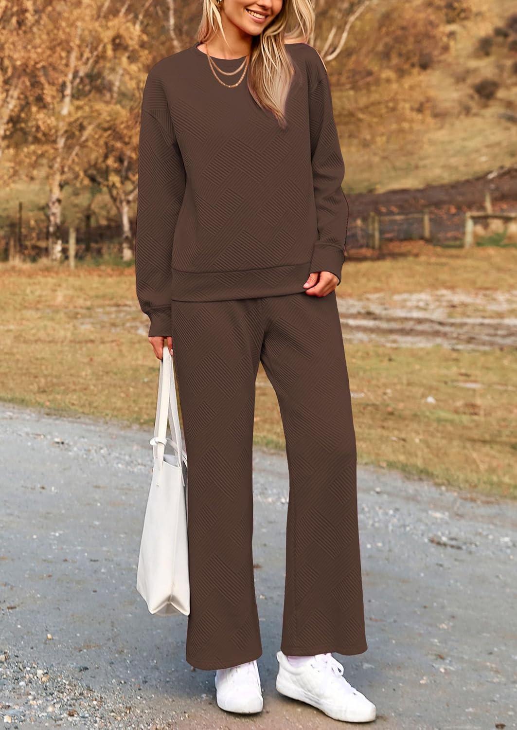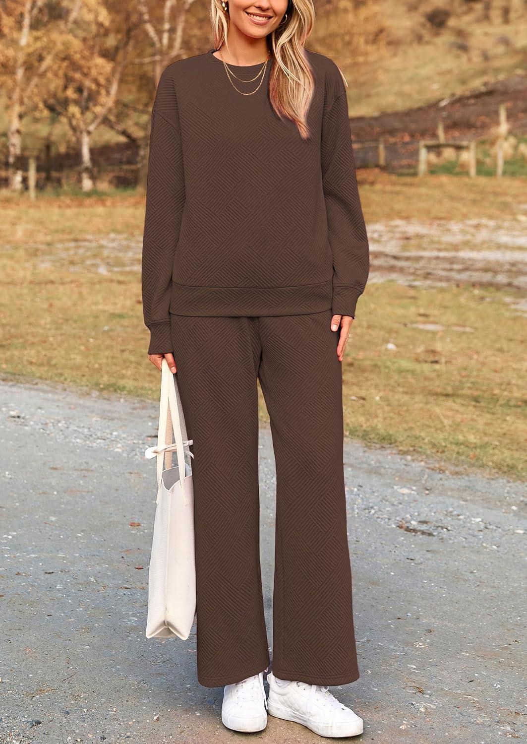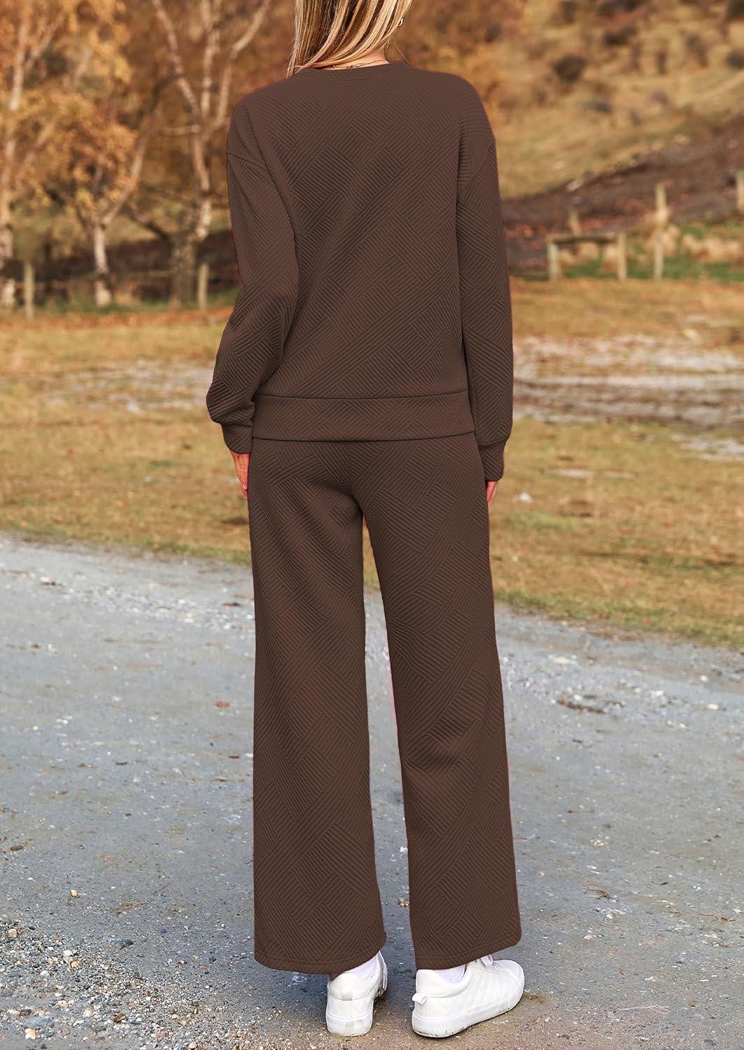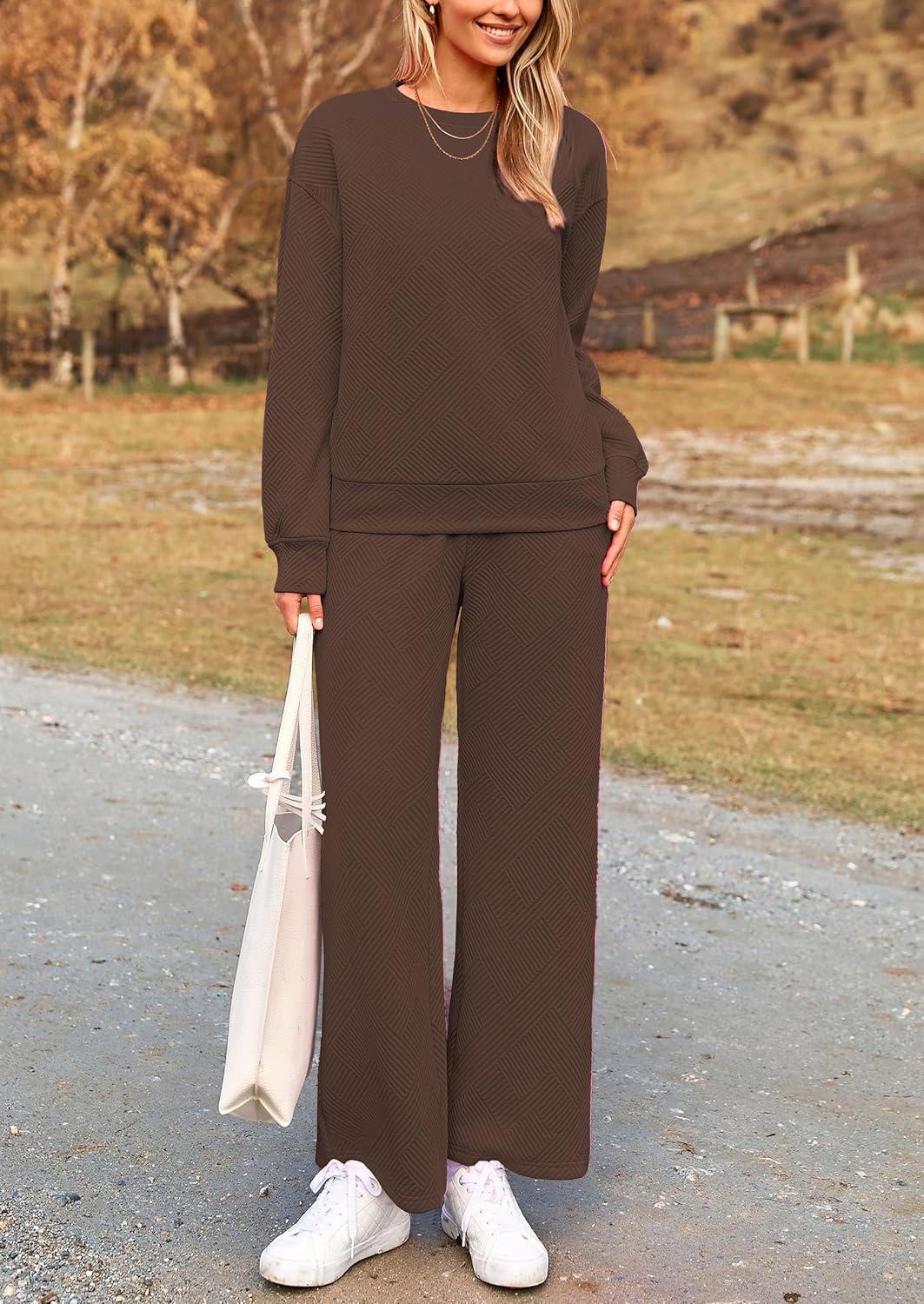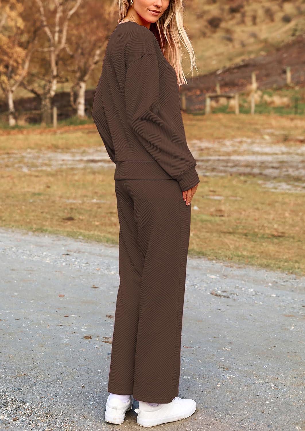 PRETTYGARDEN Womens 2025 Fall 2 Piece Outfits Long Sleeve Pullover Tops Wide Leg Pants Matching Lounge Sets Fashion Clothing(Coffee)
